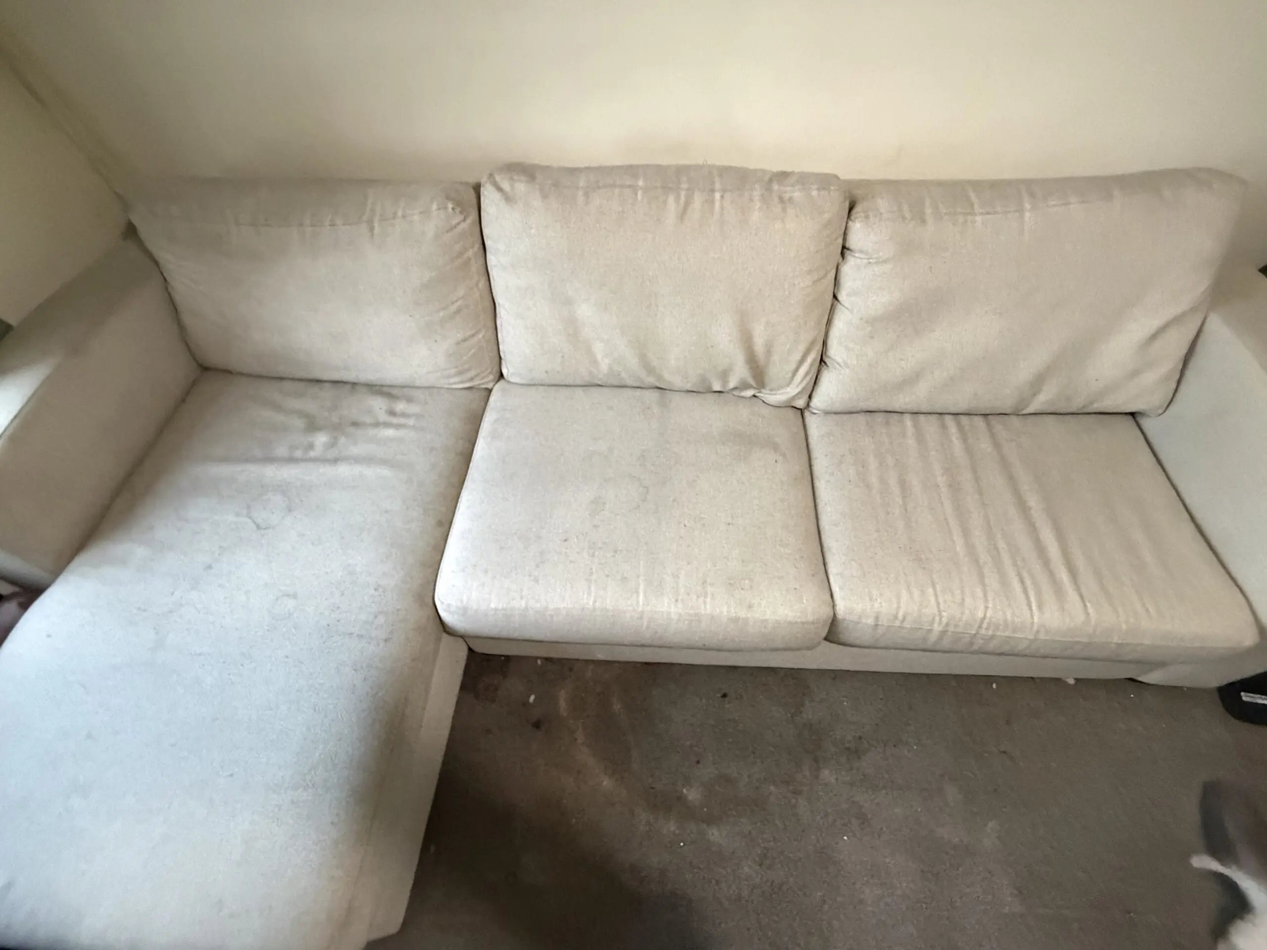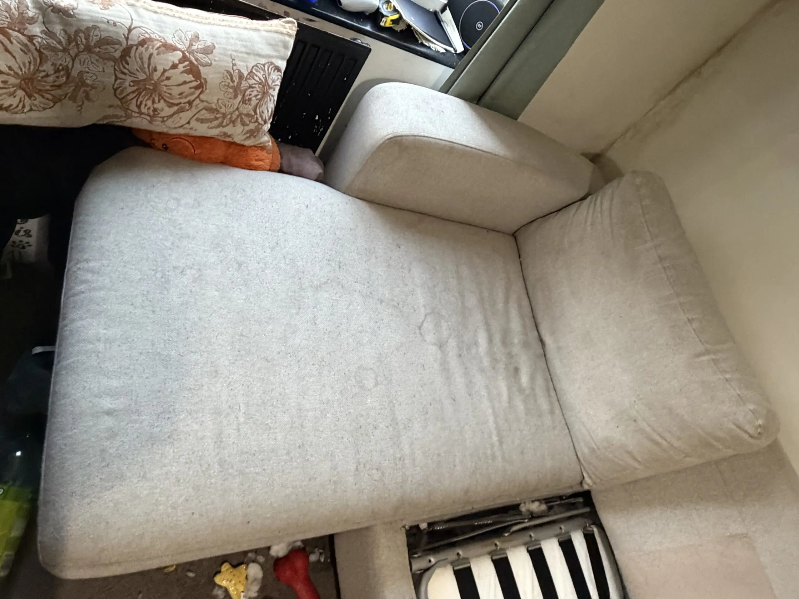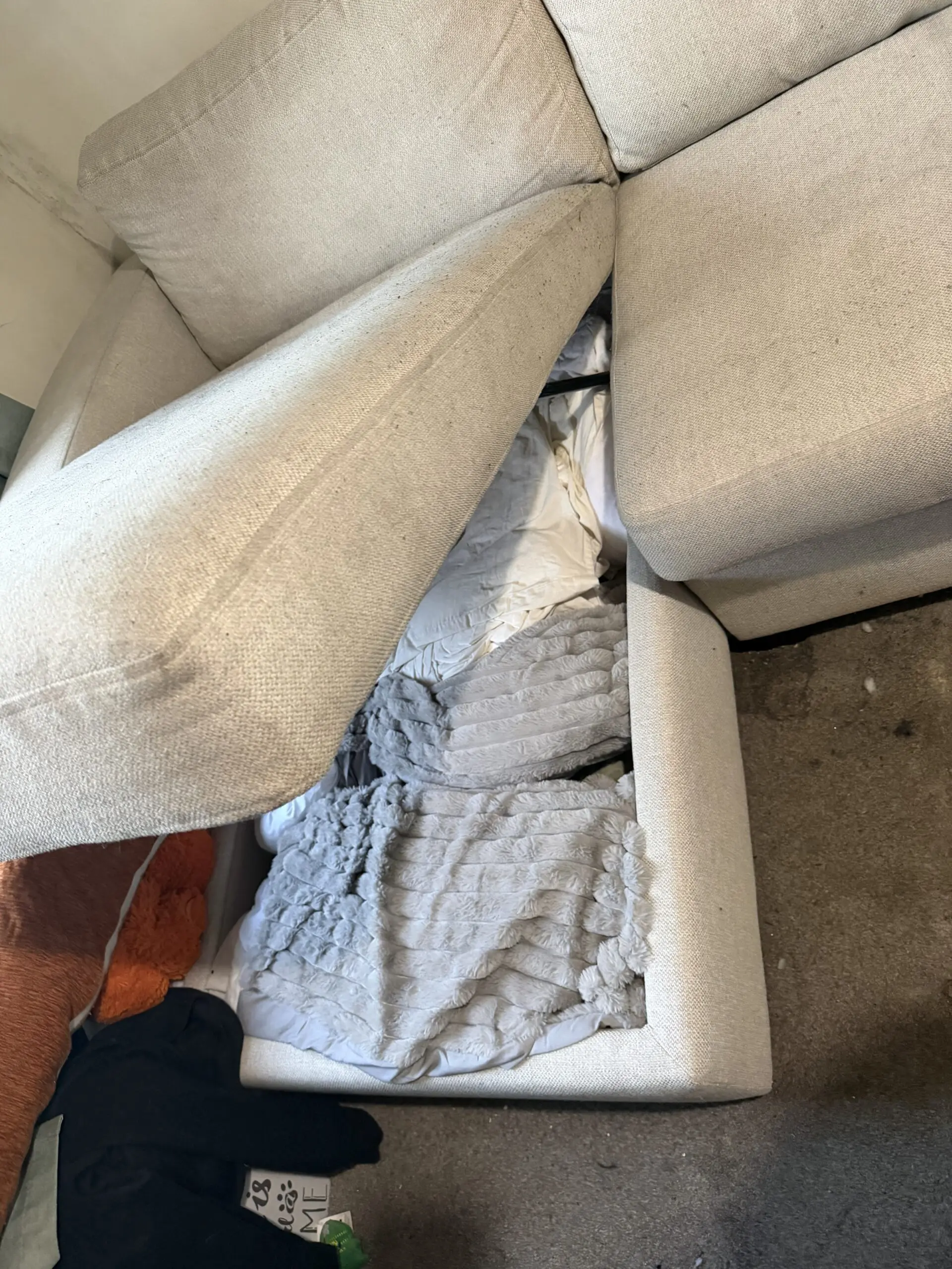 Used, has and will be deep cleaned before collection for satisfaction, does not come with mattress, the fabric that lays over the sofa bed has been cut off but is not needed, has storage