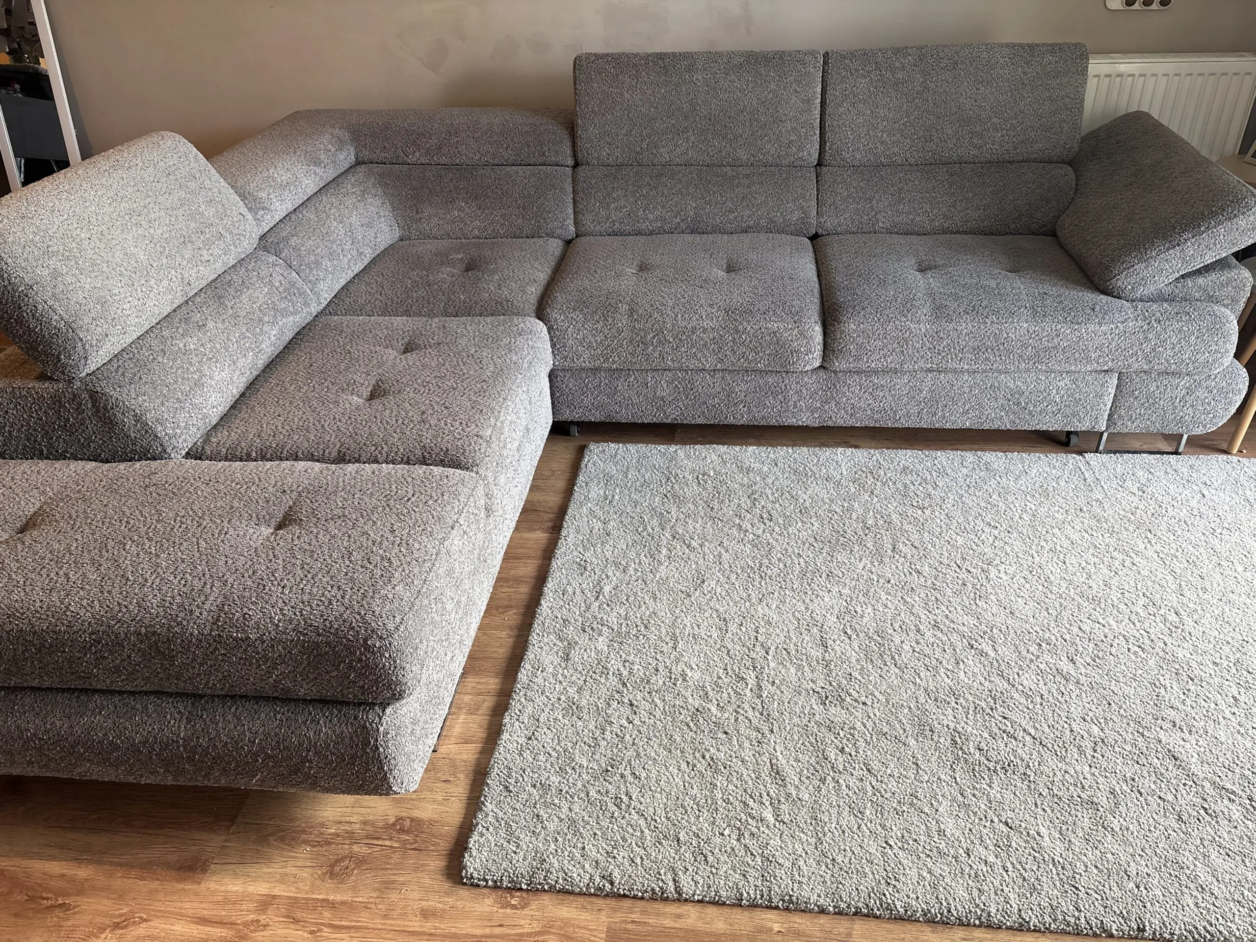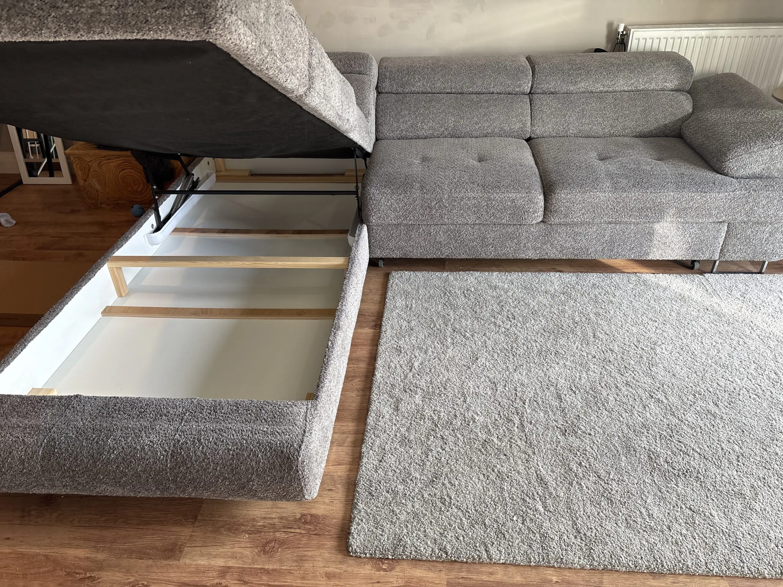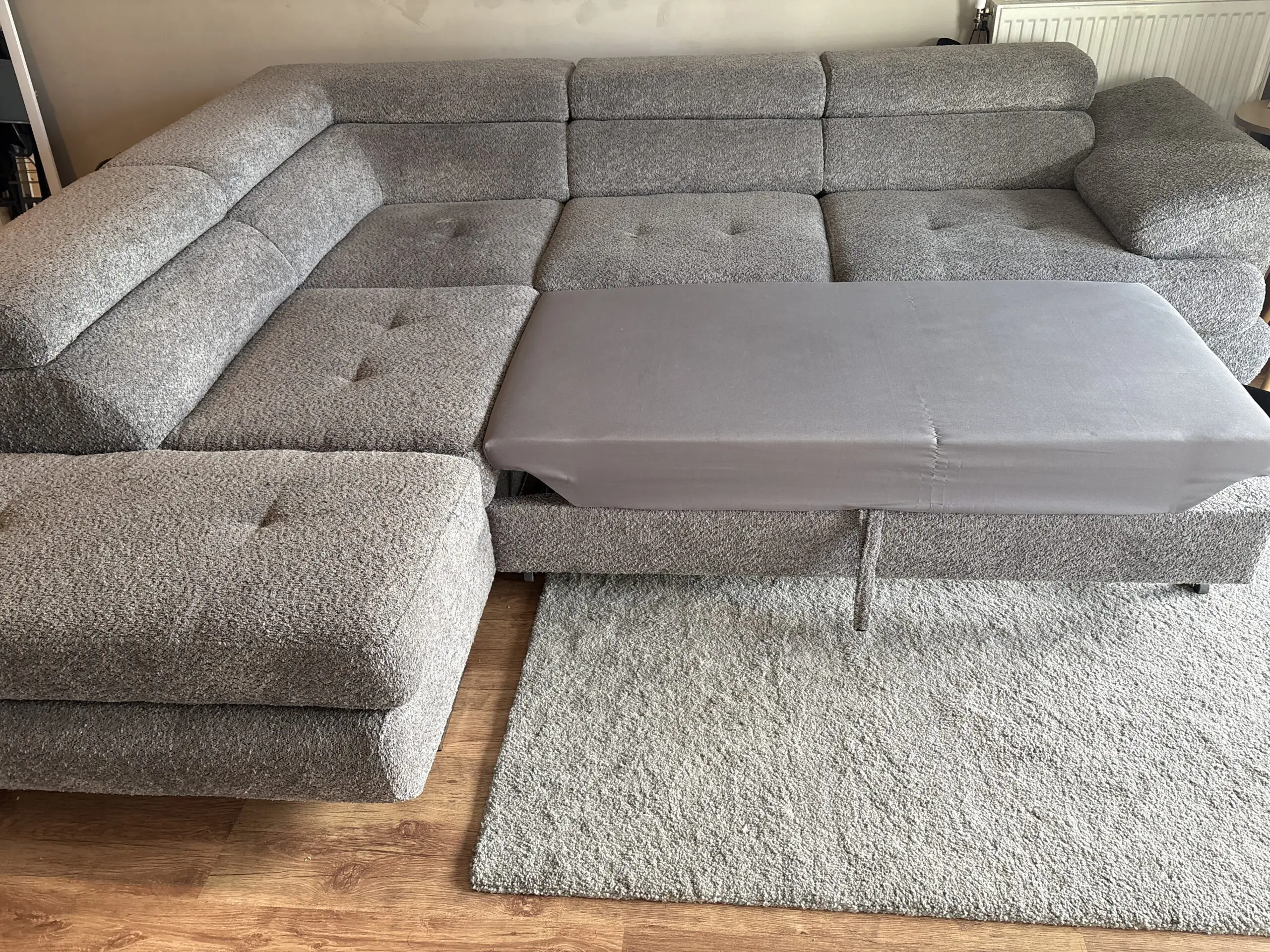 Only a year old grey corner sofa with pull out sofa bed, storage inside sofa and head/back rests that are adjustable .In great condition.