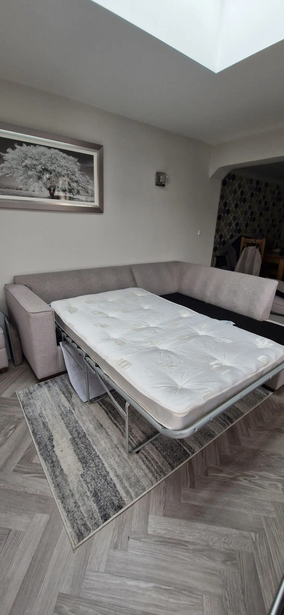 Large corner sofa, with pull out bed. Bed has premium range mattress, and is very easy to pull out and put back (approx 15 seconds) Very good condition from smoke and pet free home. Approx 4 years old.