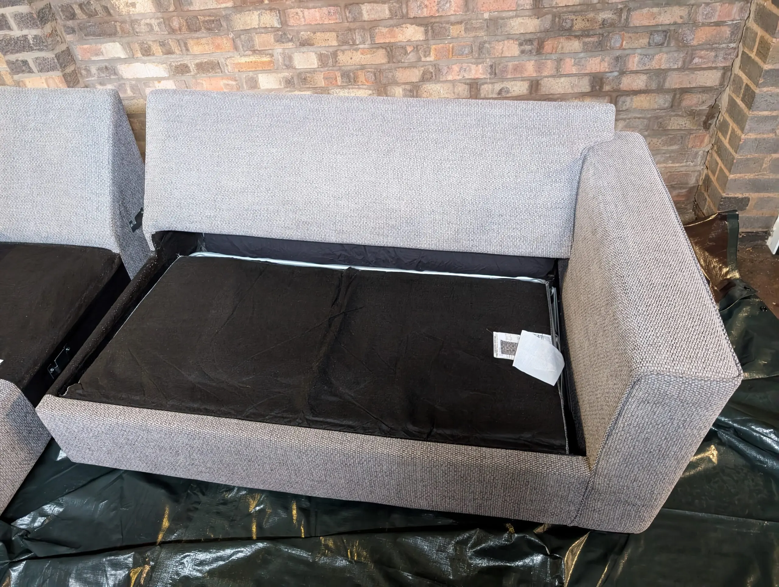 The sofa separates into two sections, the sofa bed with two-seats being one section, and the chaise lounge being another.