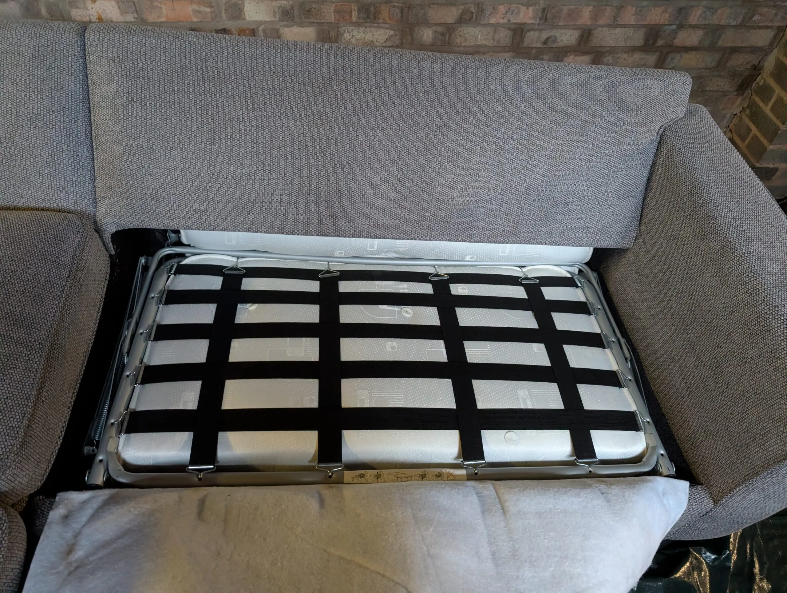 This L-shaped corner sofa bed from Furniture Village with Chaise Lounge was purchased in 2022 at an RRP of £1,700. Featuring a lift-out bed with mattress.