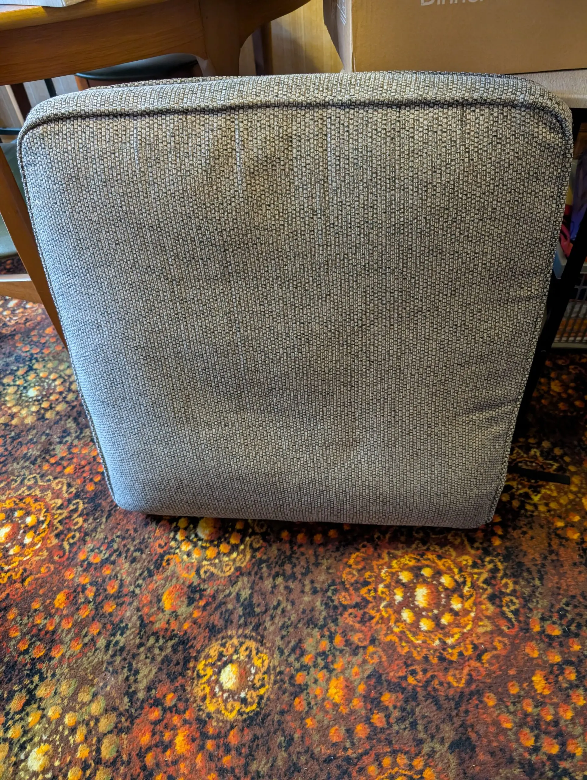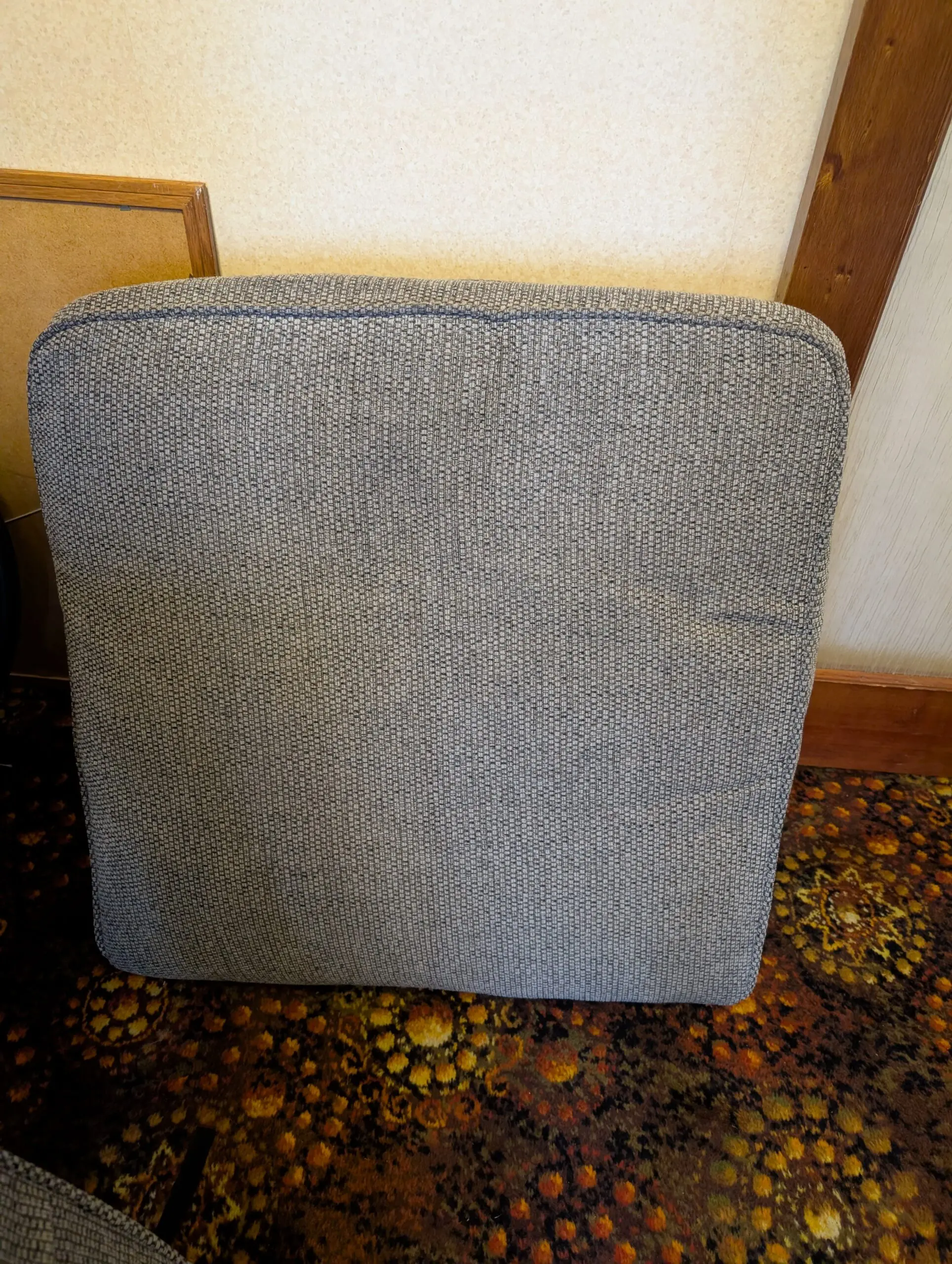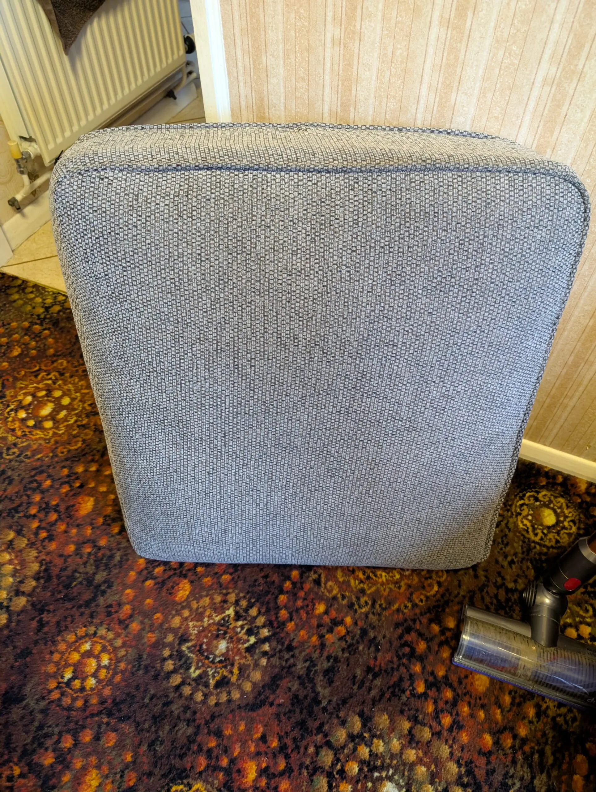 The sofa itself is in a good condition, the primary signs of wear are at the front of the base cushions where people’s legs have rubbed against the textured pattern of the uphosltery, but there are no holes or tears through the fabric.