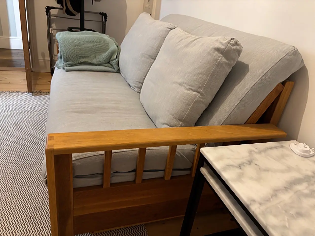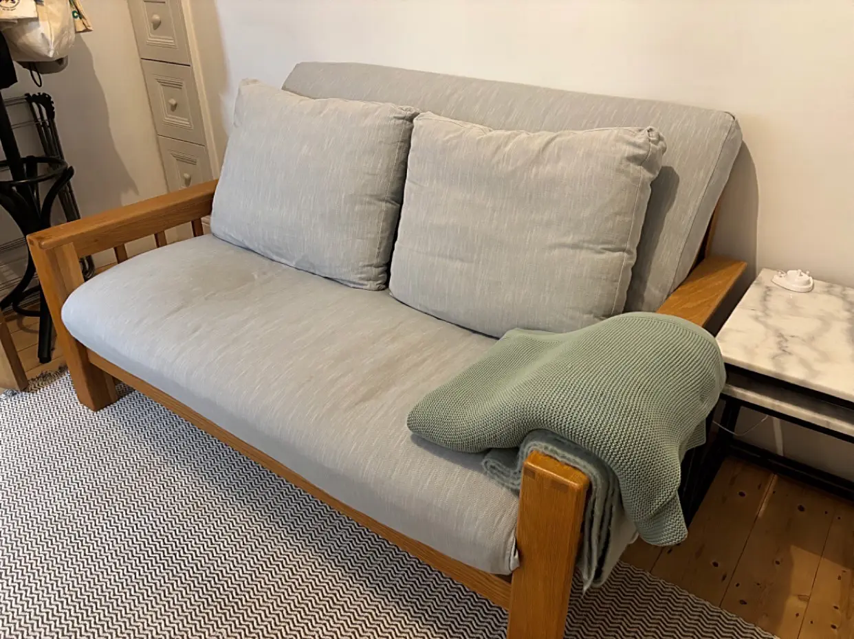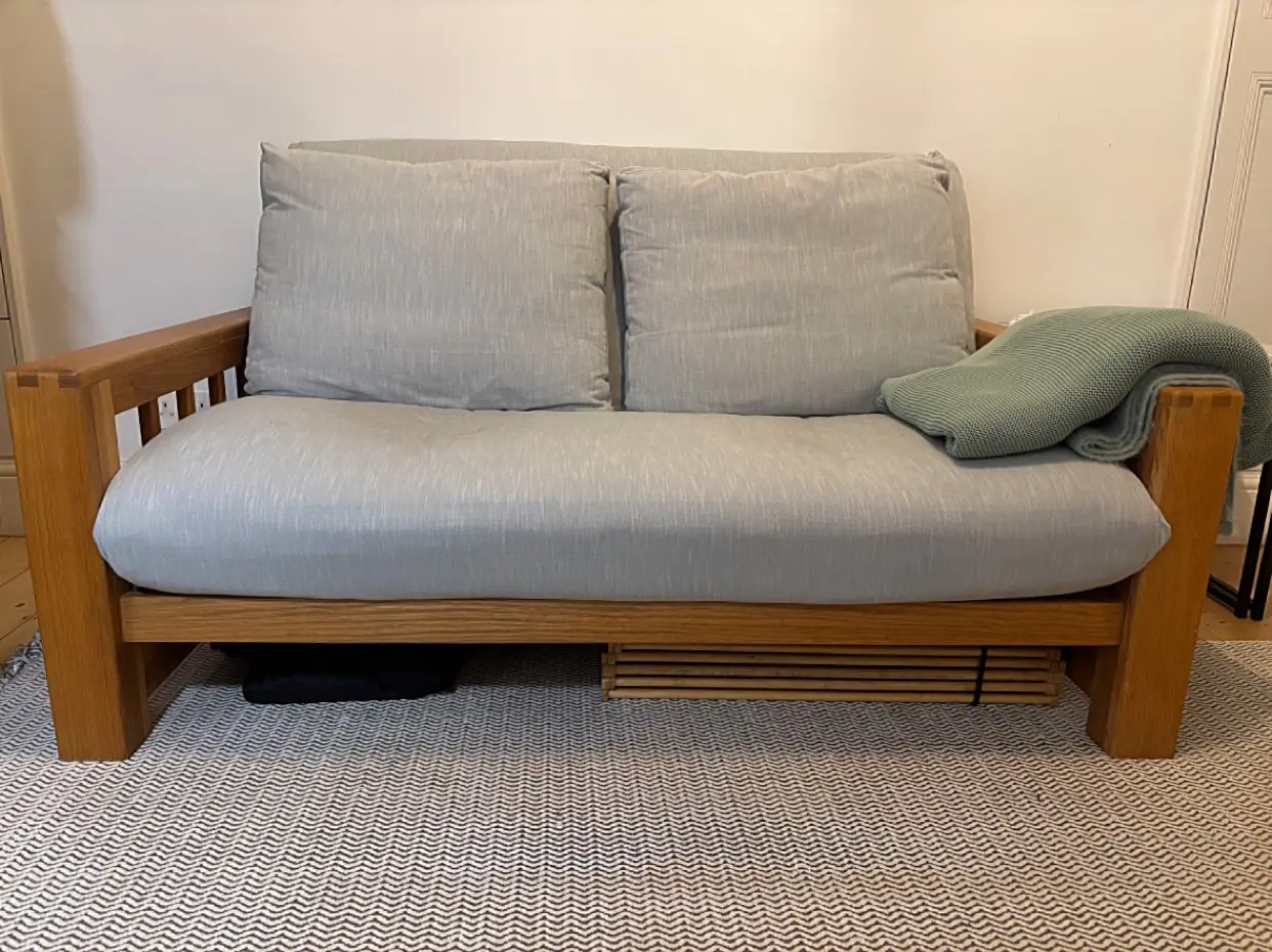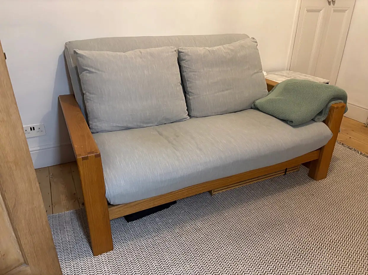 Vienna 2 seater solid oak double sofa bed. Pale blue/green colour with 2 back cushions.
