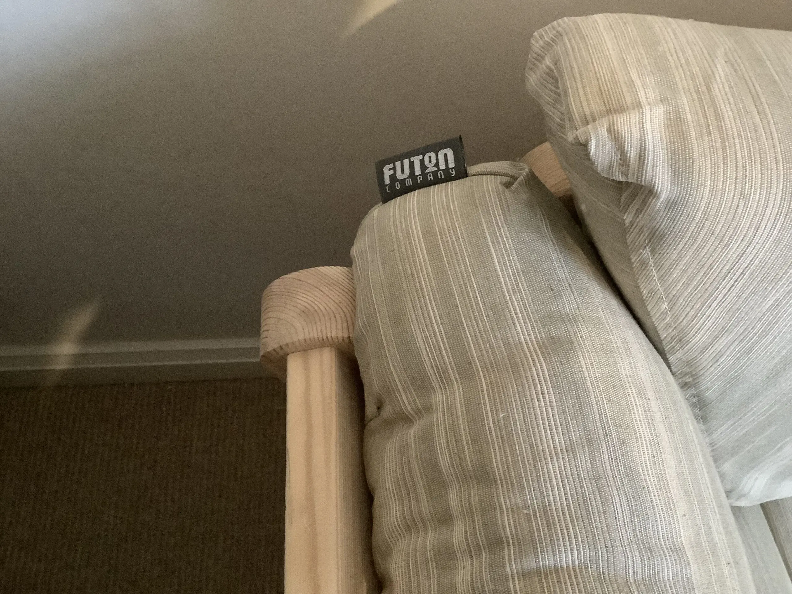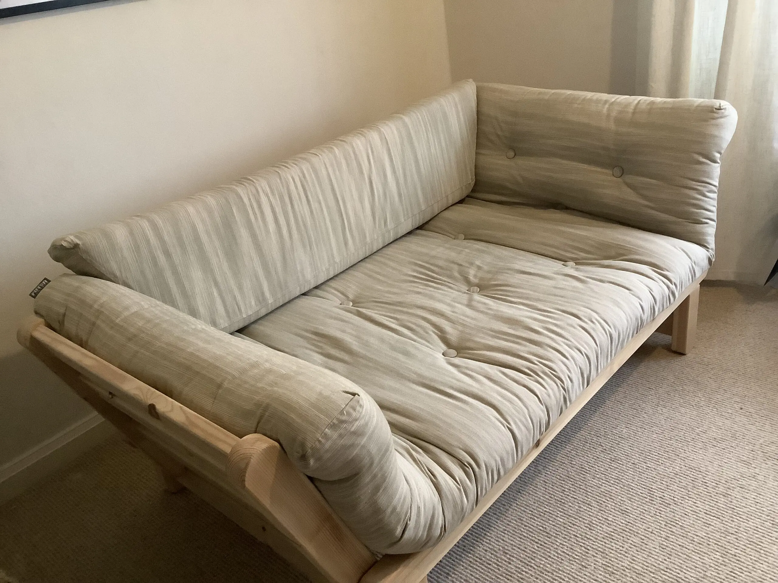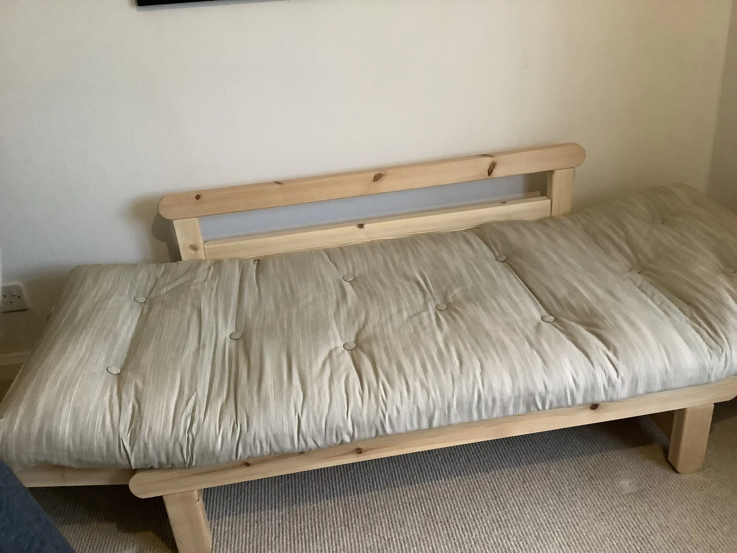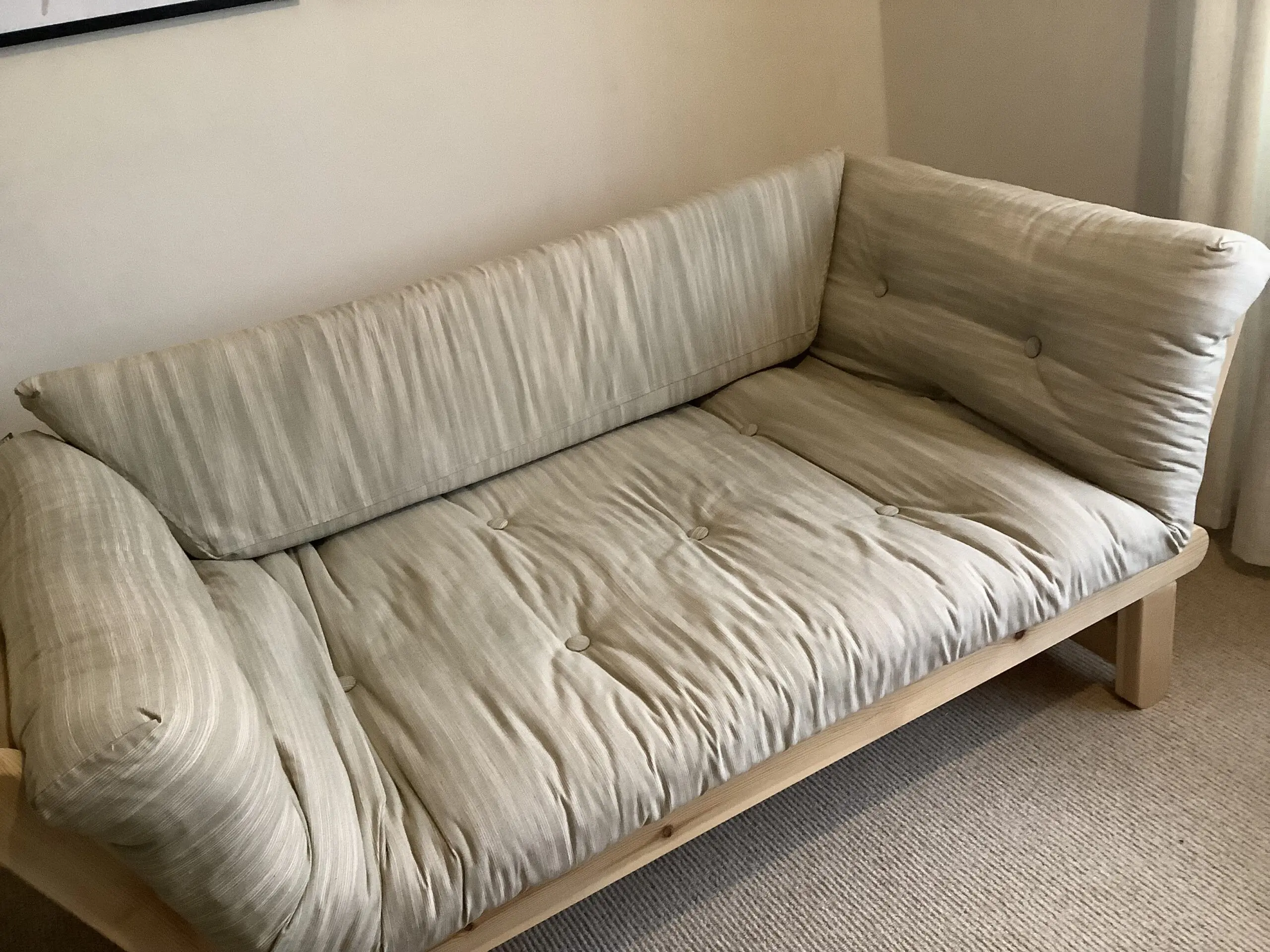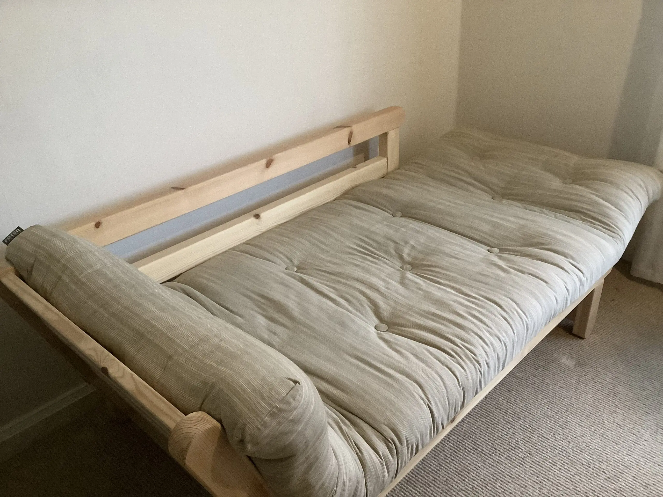 Futon Company Twingle Day bed/sofa bed with fibre filled mattress and shaped back cushions, removable fabric. Care instructions: cover – dry clean only, two seater. 100% cotton hand loom fabric. Colour: Natural with stripes running through. Material: Solid pine. The sofa bed has had a blanket over it for protection, free from dust. Used as chair rather than a sofa bed a couple of times. Excellent condition and well looked after.