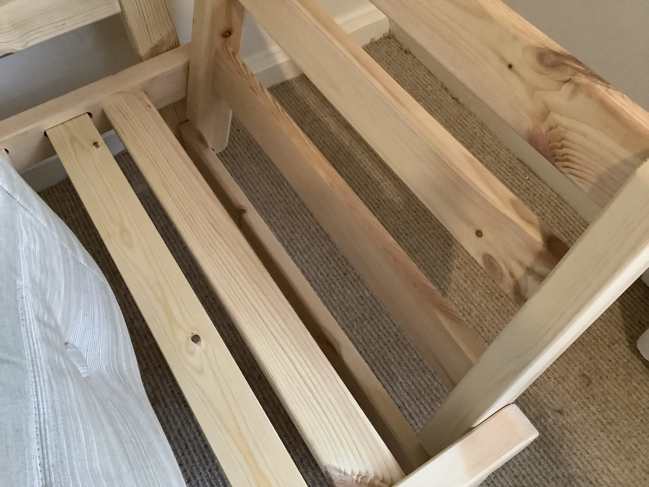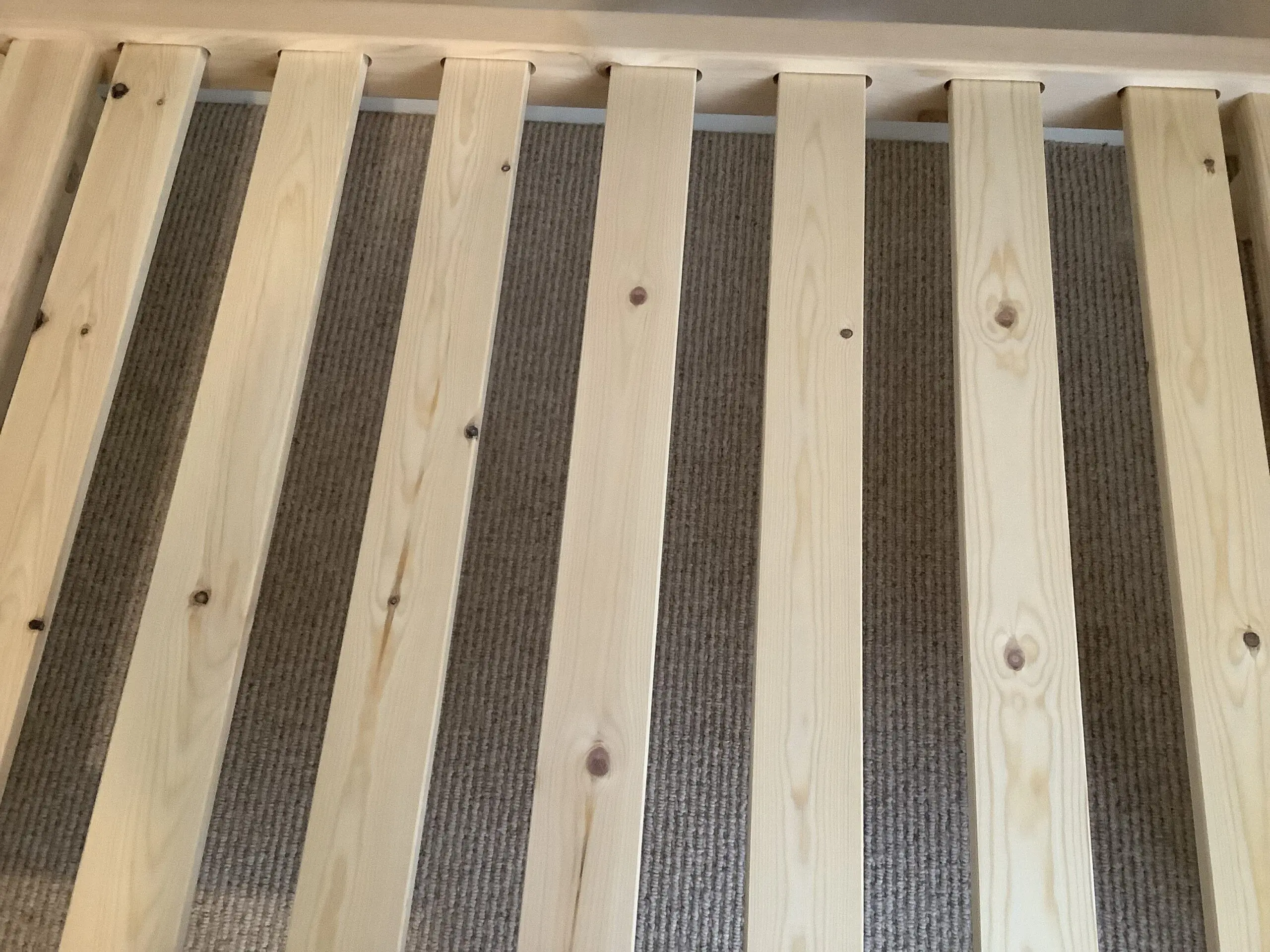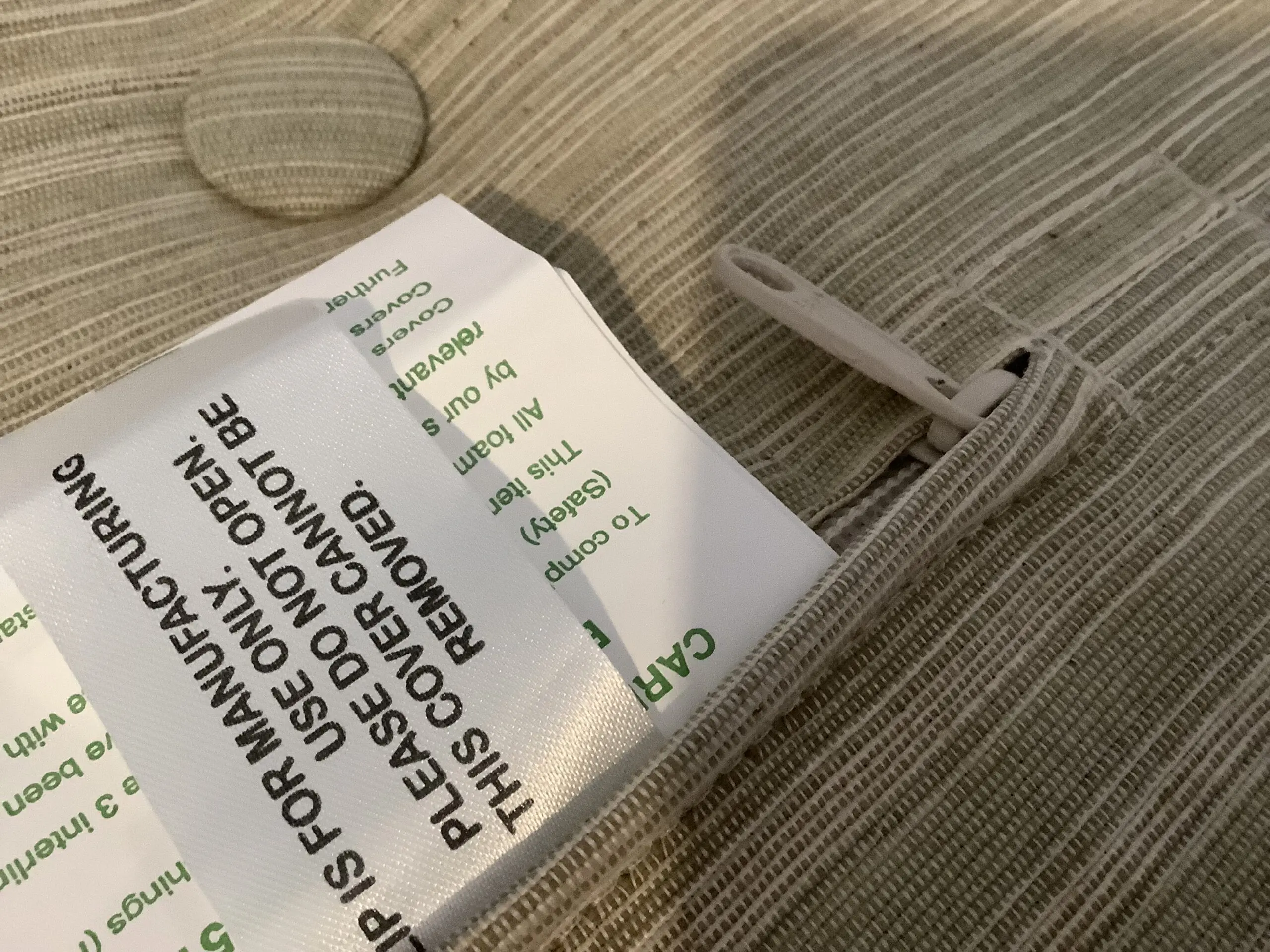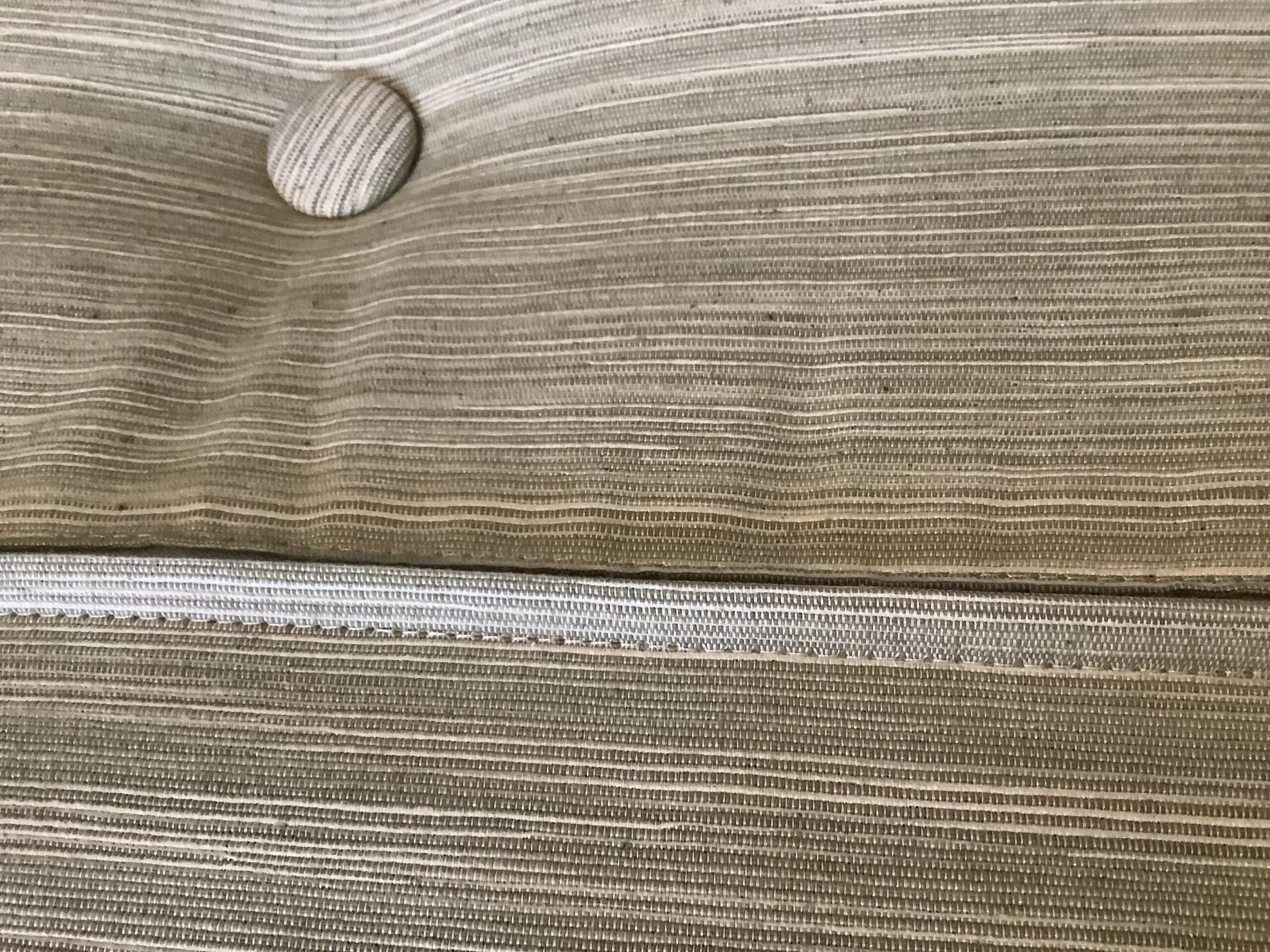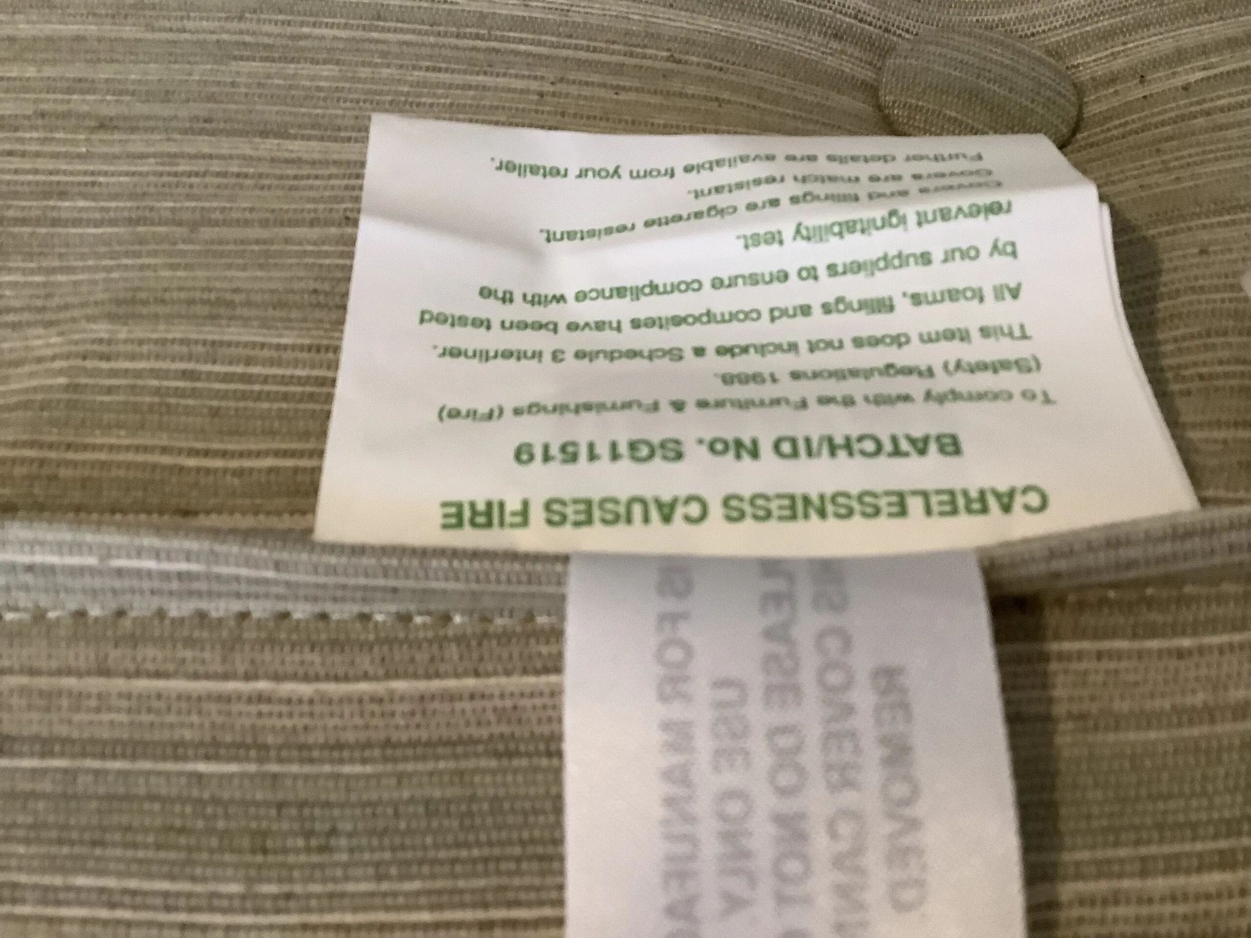 Futon Company Twingle Day bed/sofa bed with fibre filled mattress and shaped back cushions, removable fabric. Care instructions: cover – dry clean only, two seater. 100% cotton hand loom fabric. Colour: Natural with stripes running through. Material: Solid pine. The sofa bed has had a blanket over it for protection, free from dust. Used as chair rather than a sofa bed a couple of times. Excellent condition and well looked after.