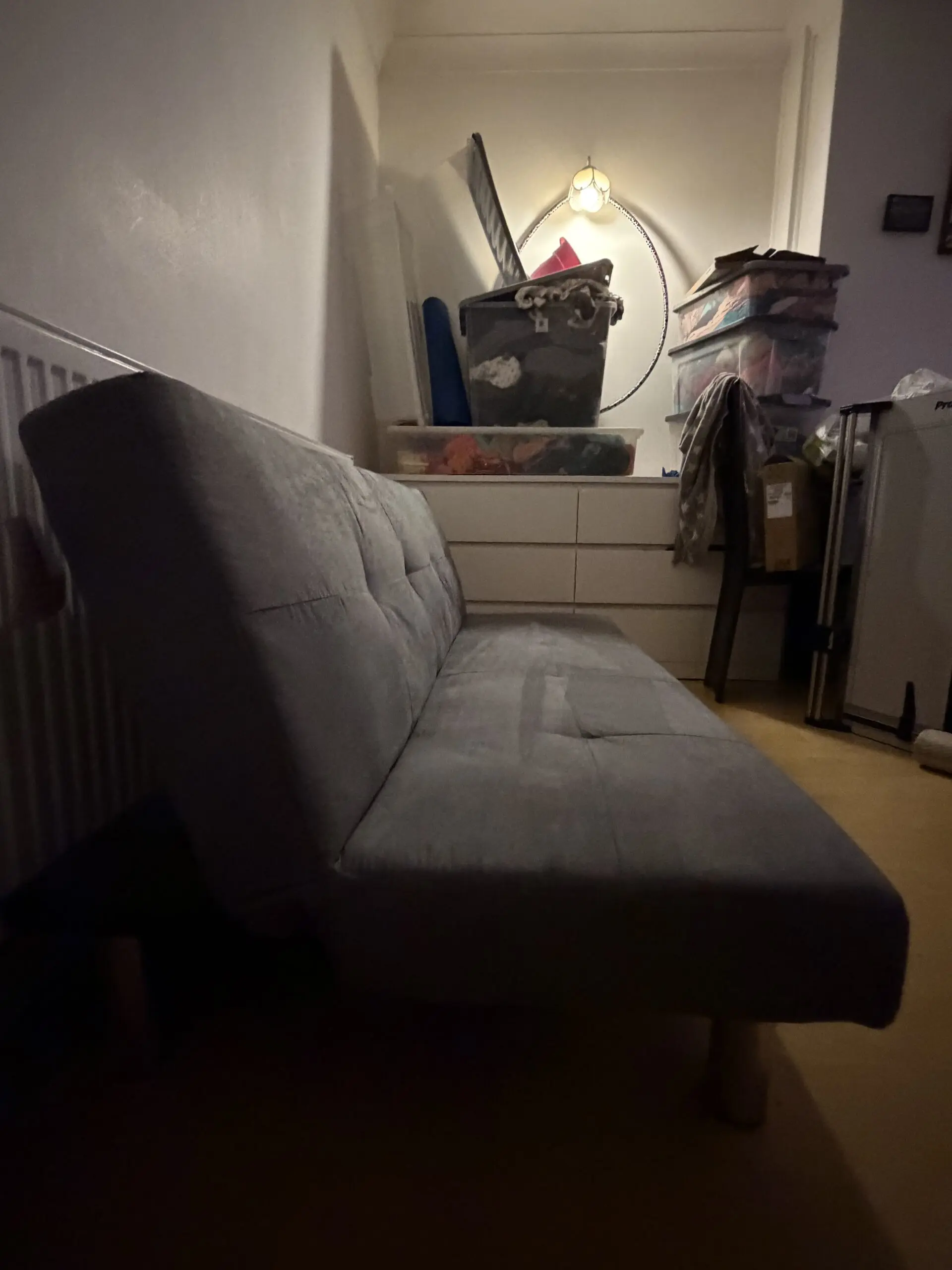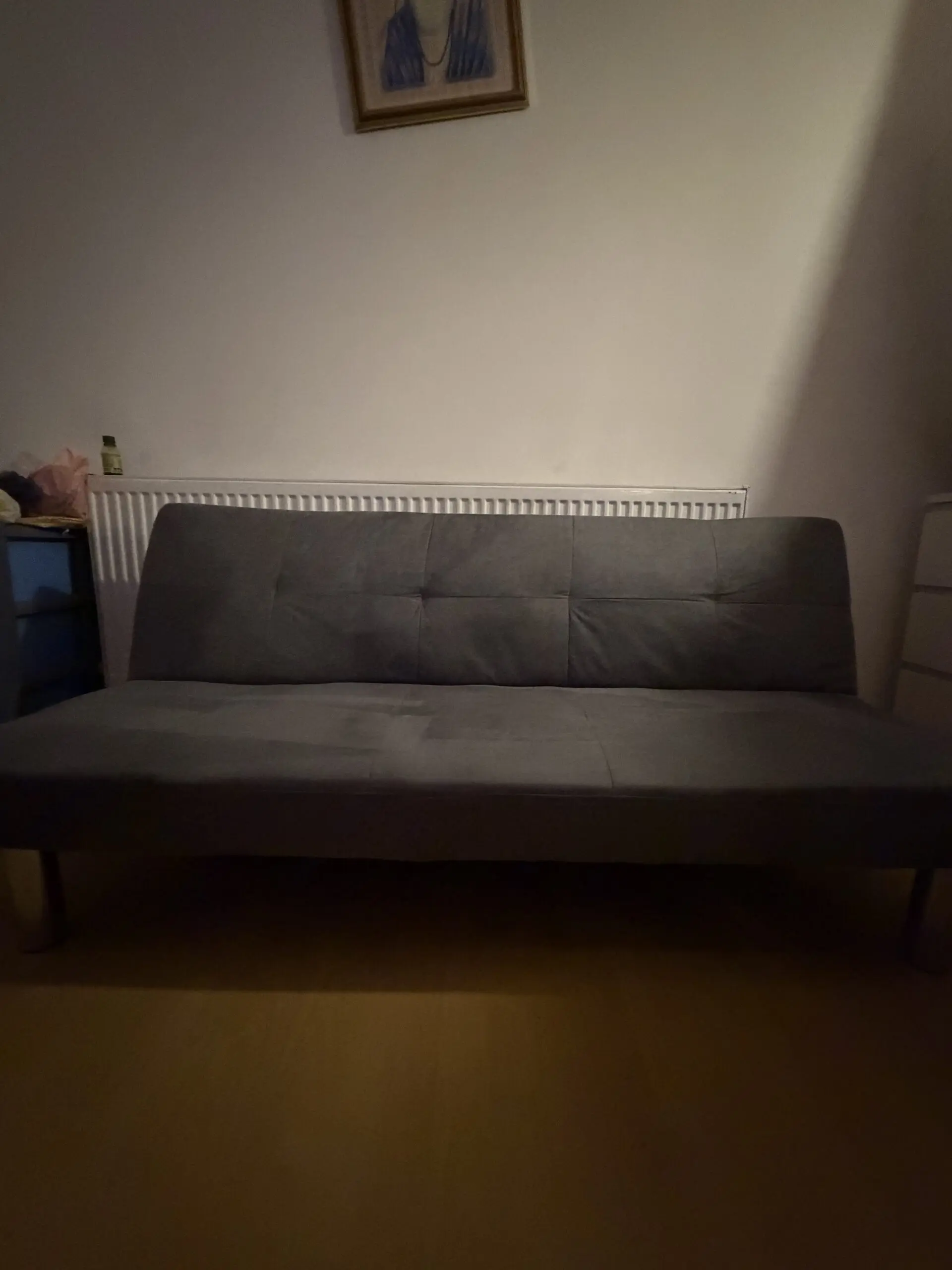 Grey 3 seater fabric sofa bed in very good condition. Originally purchased online (brand unknown). It has barely been used and has mostly been kept in the corner, not used as an everyday sofa or bed.