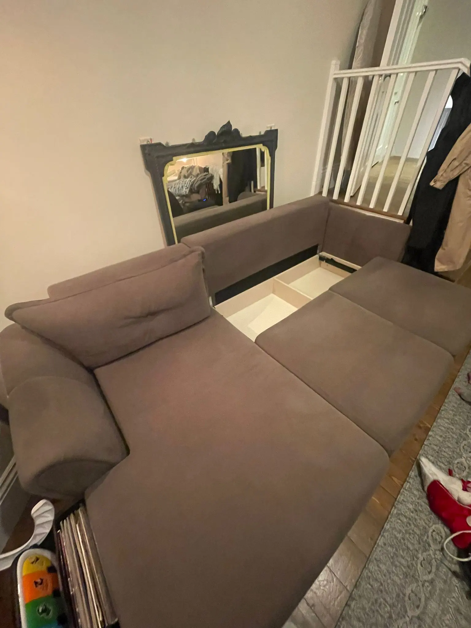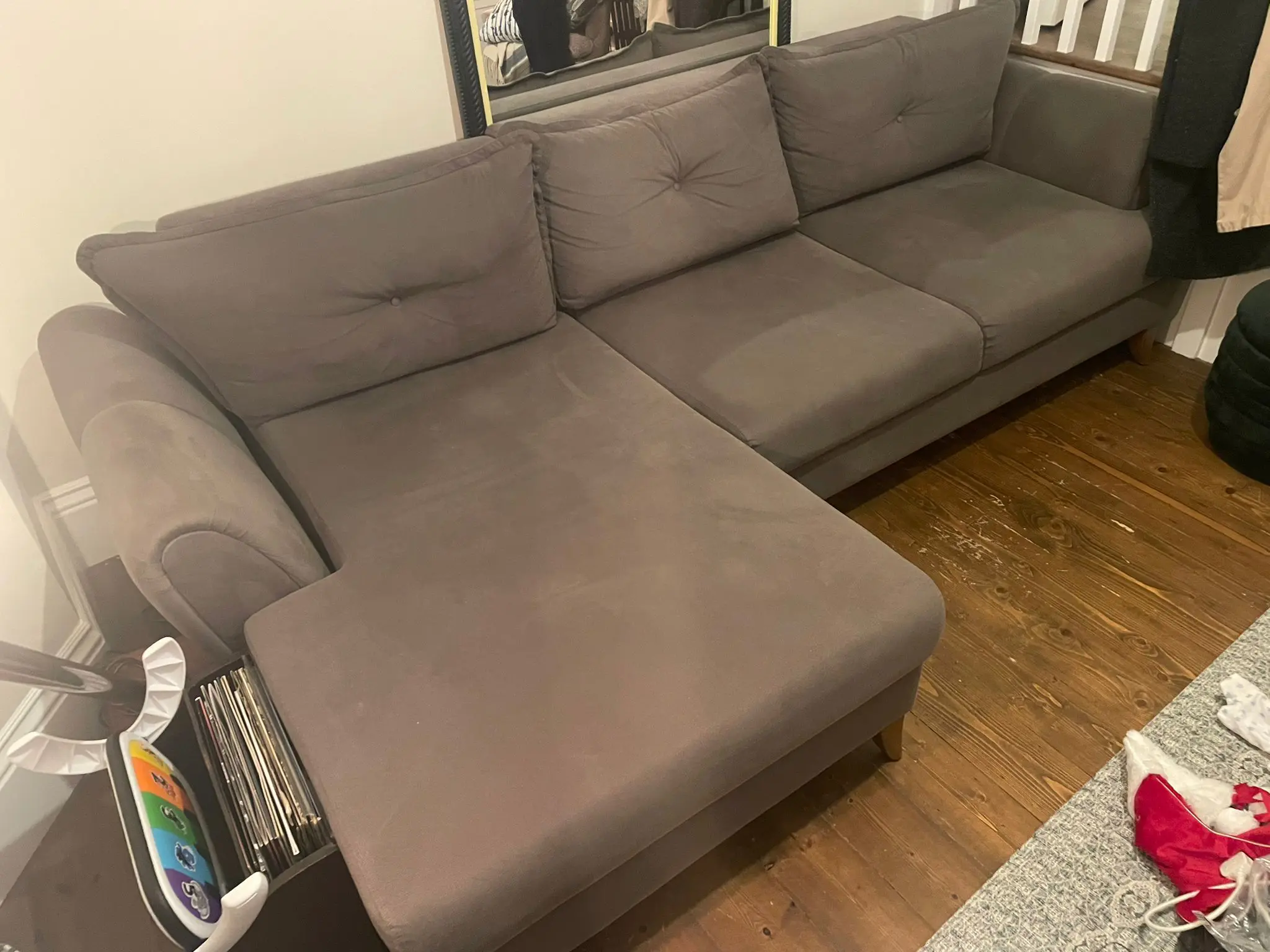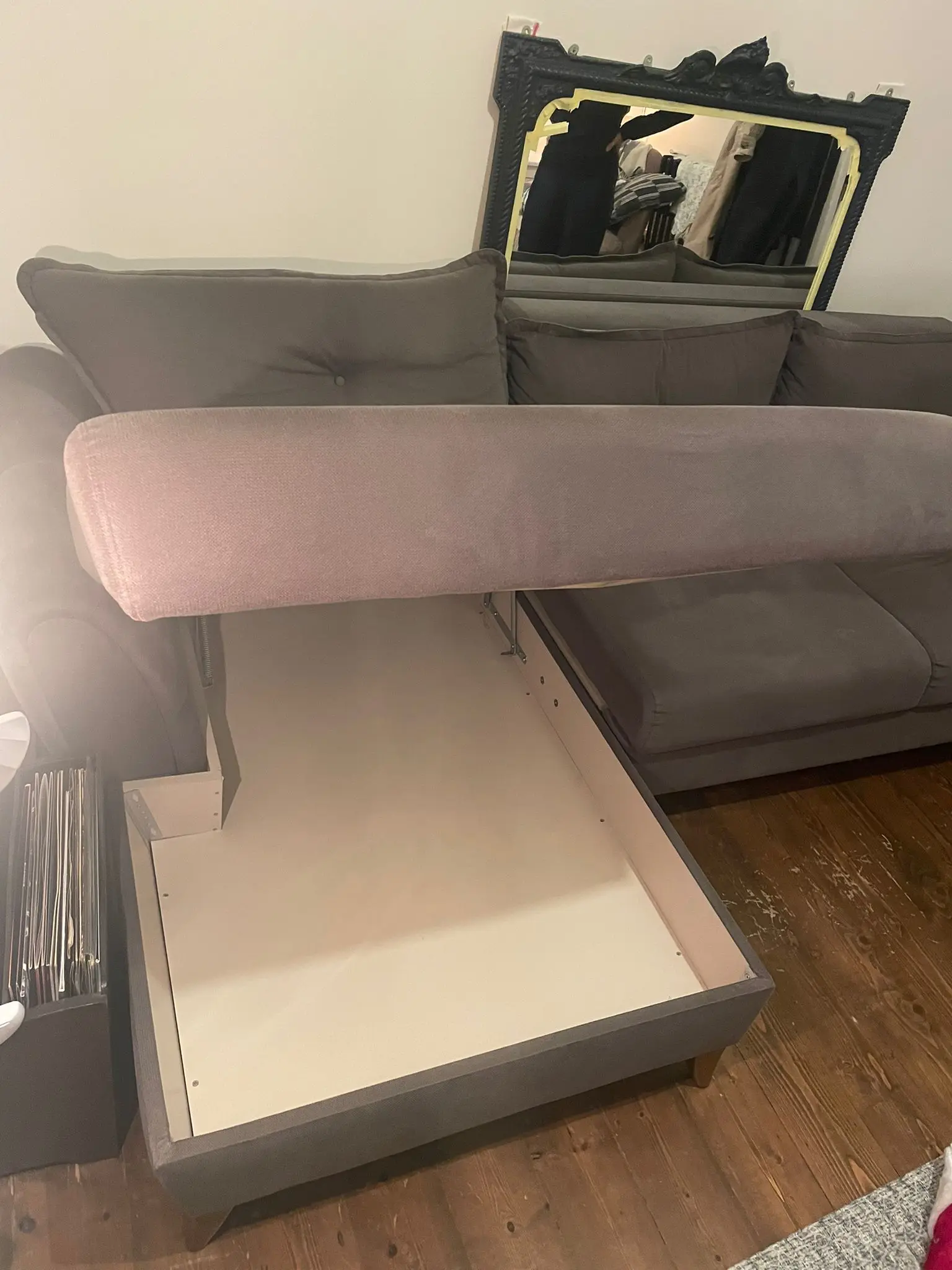 Gray L shaped sofa bed. In very good condition apart from a mark (pictured).