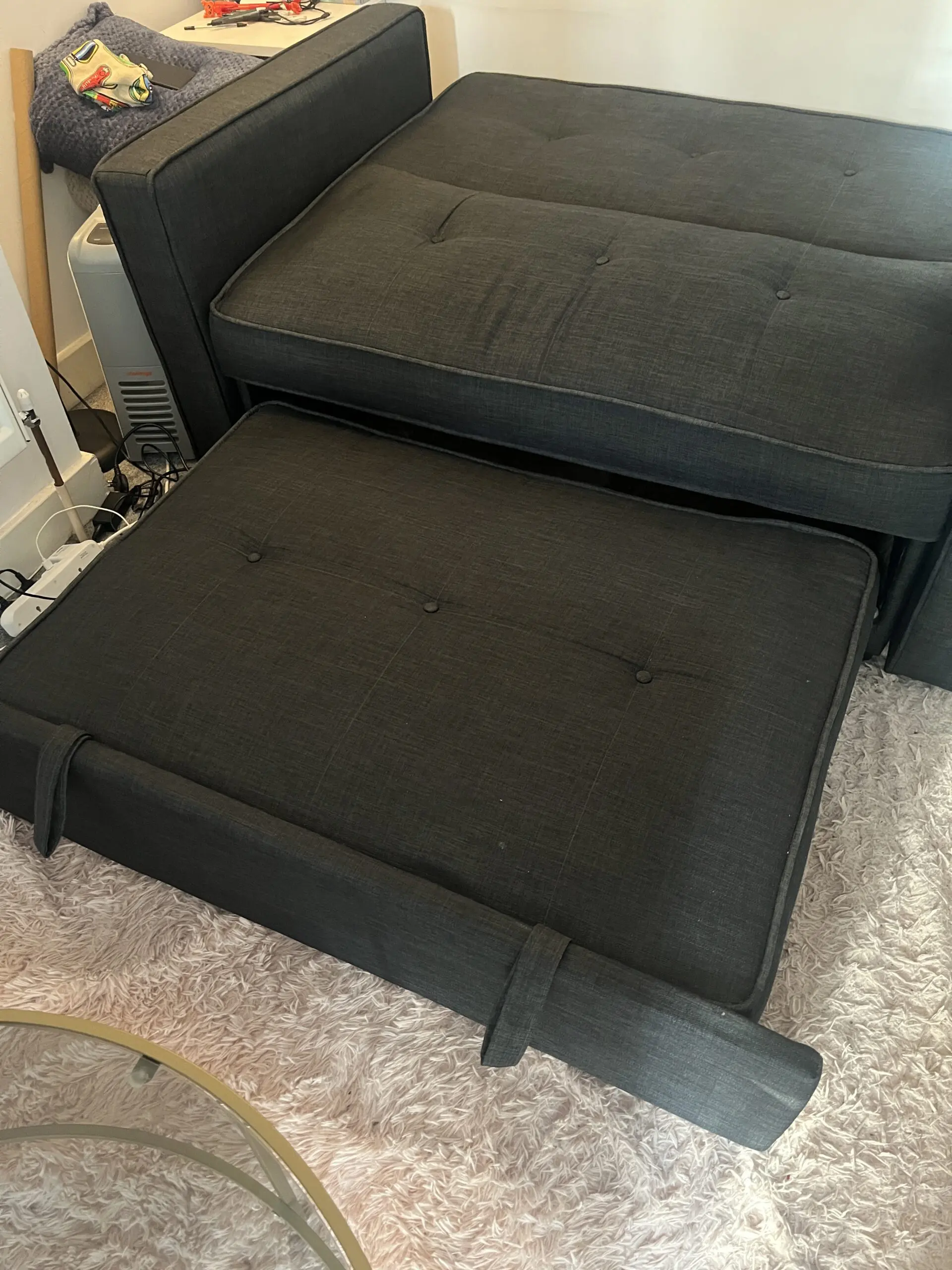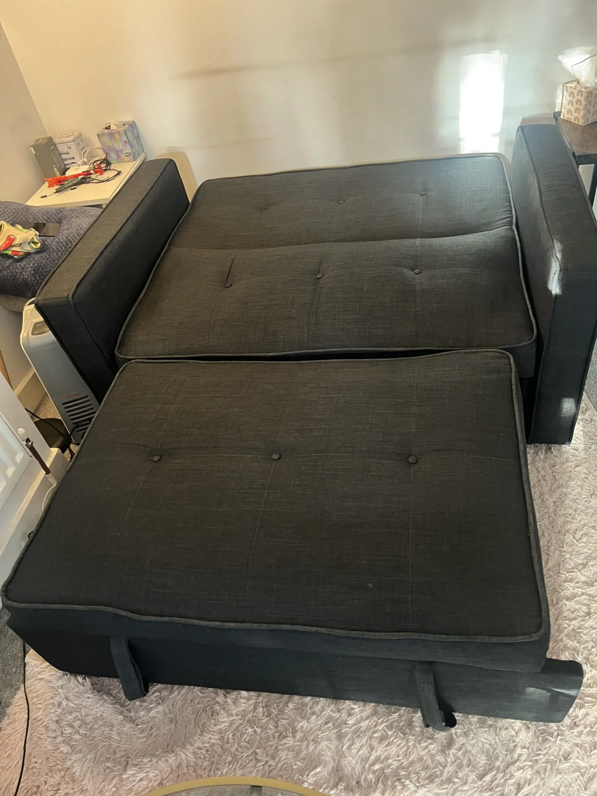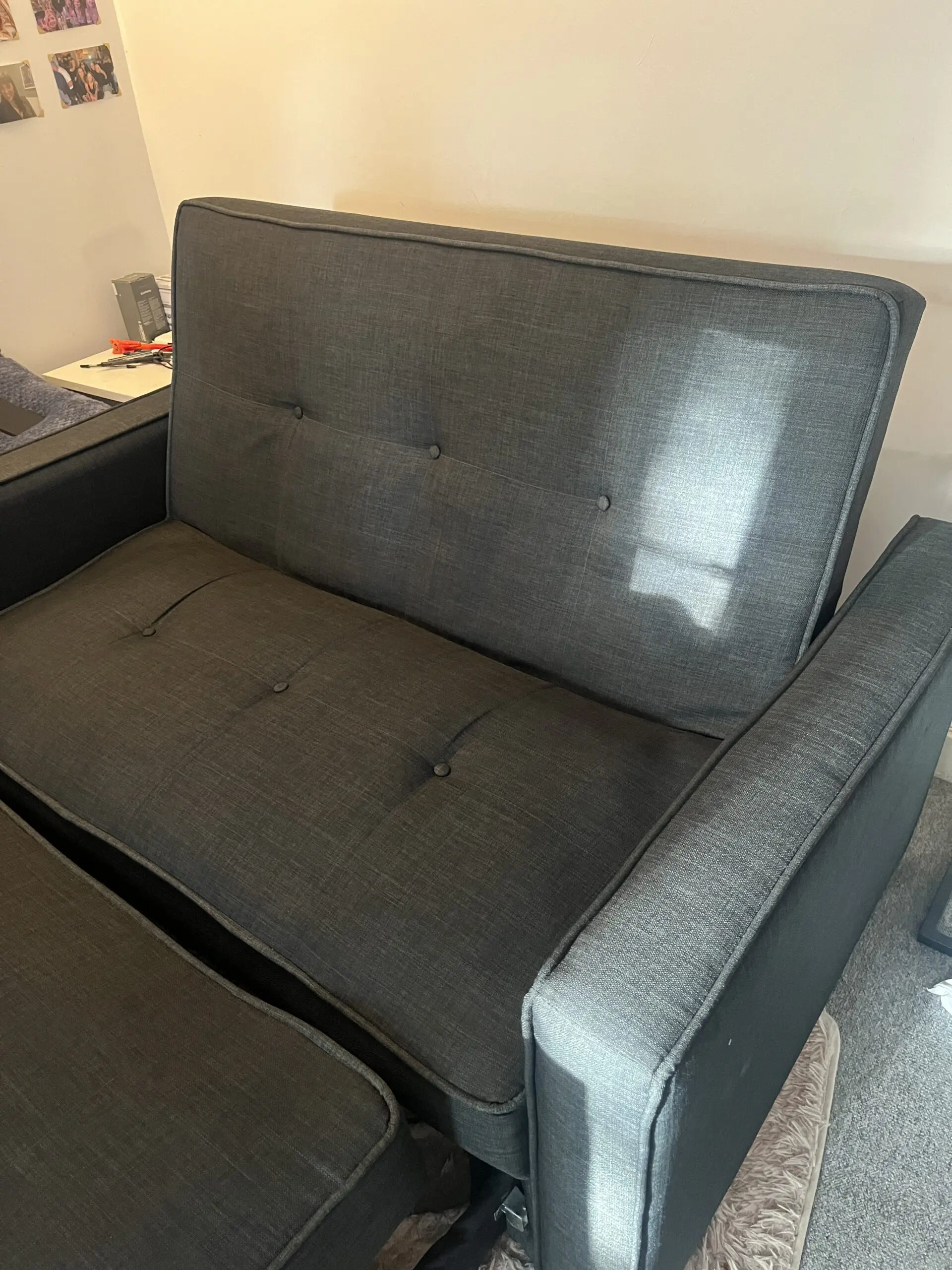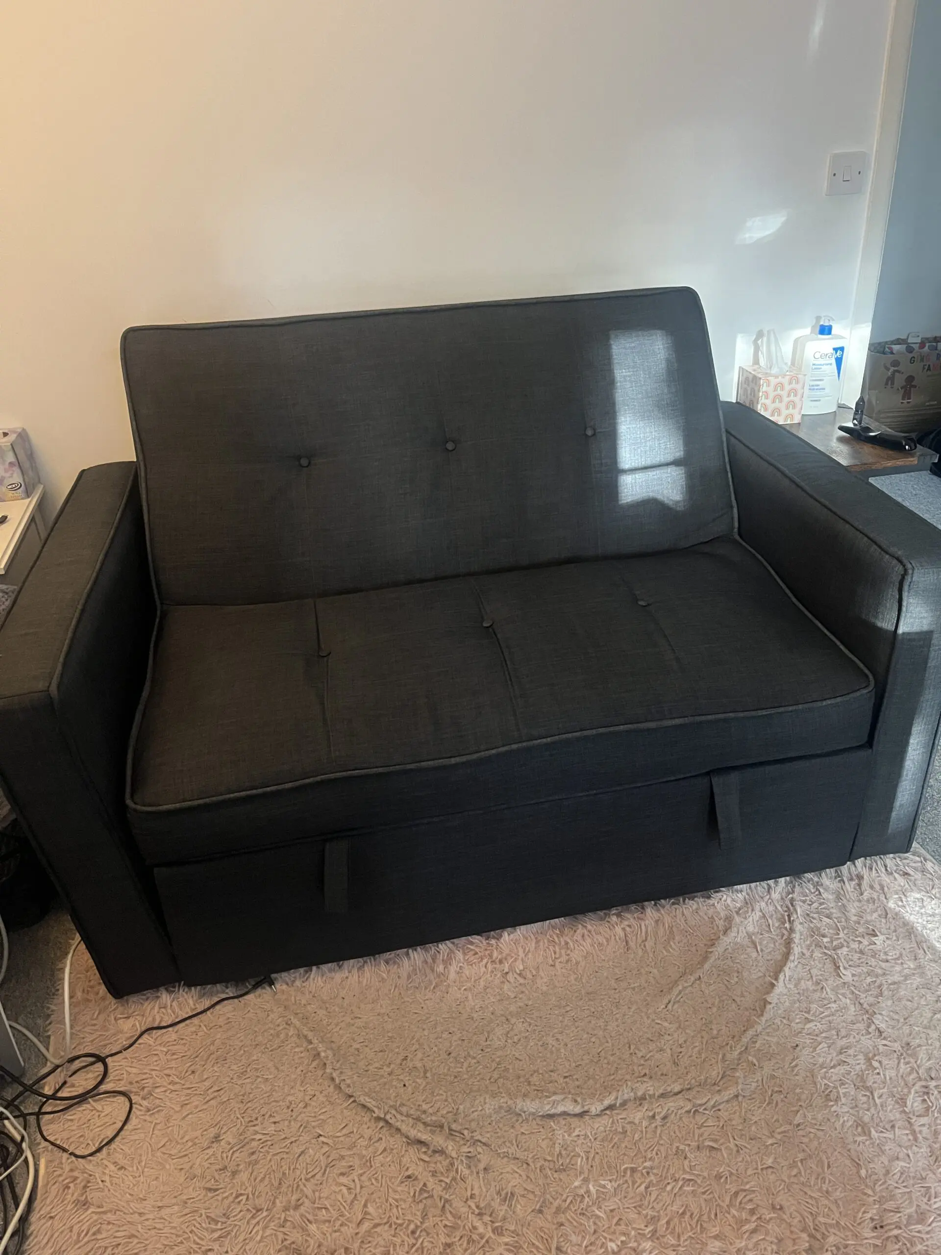 Second hand sofa bed in good used condition. Pulls out to extend to 200cm long bed. Easy to quickly move from sofa to bed with minimal effort. I bought from a friend who had kept it in their spare room for guests so it was hardly used. I have used it as a sofa for the last year so it does have some signs of use but is still in very good condition
