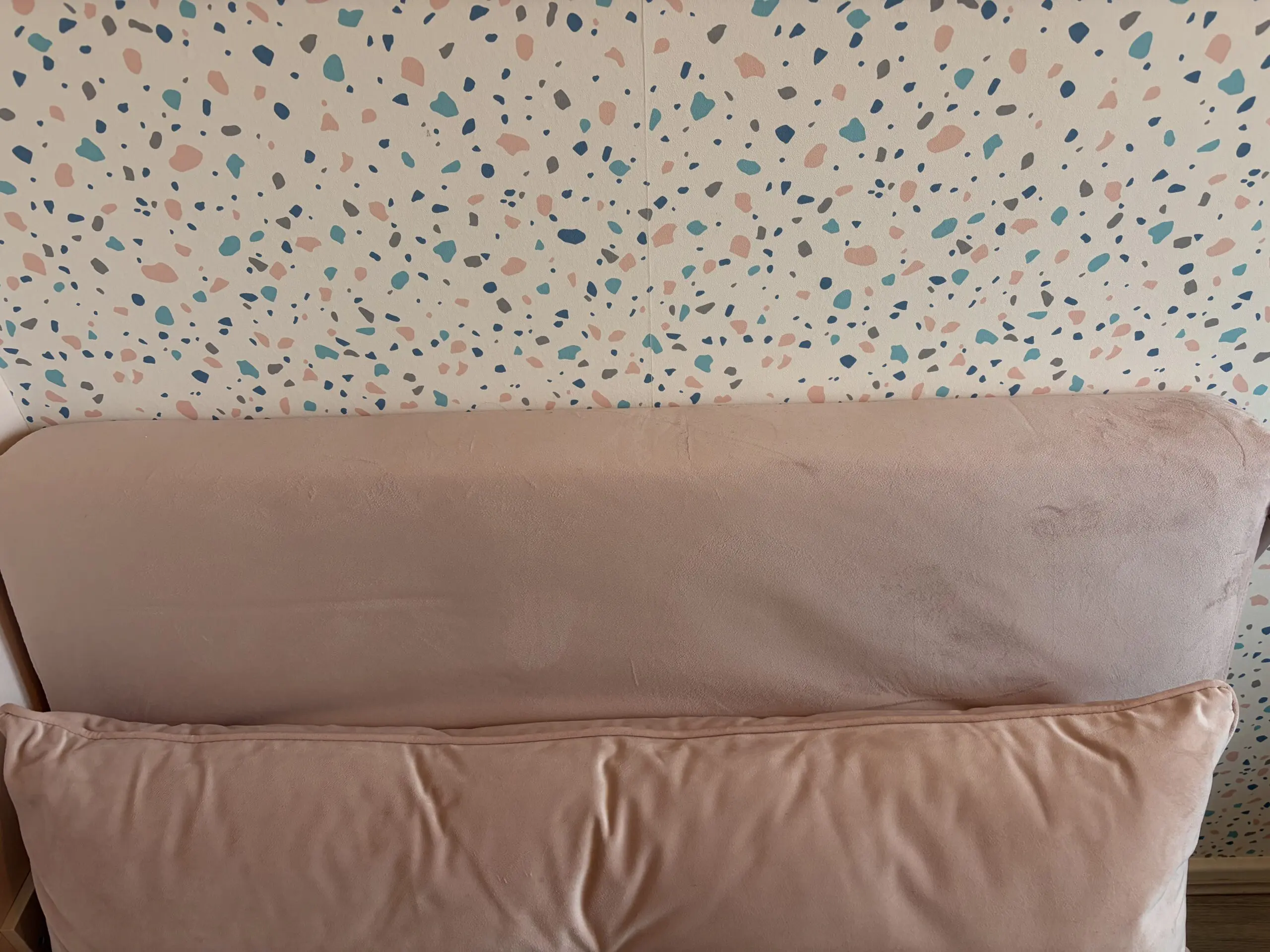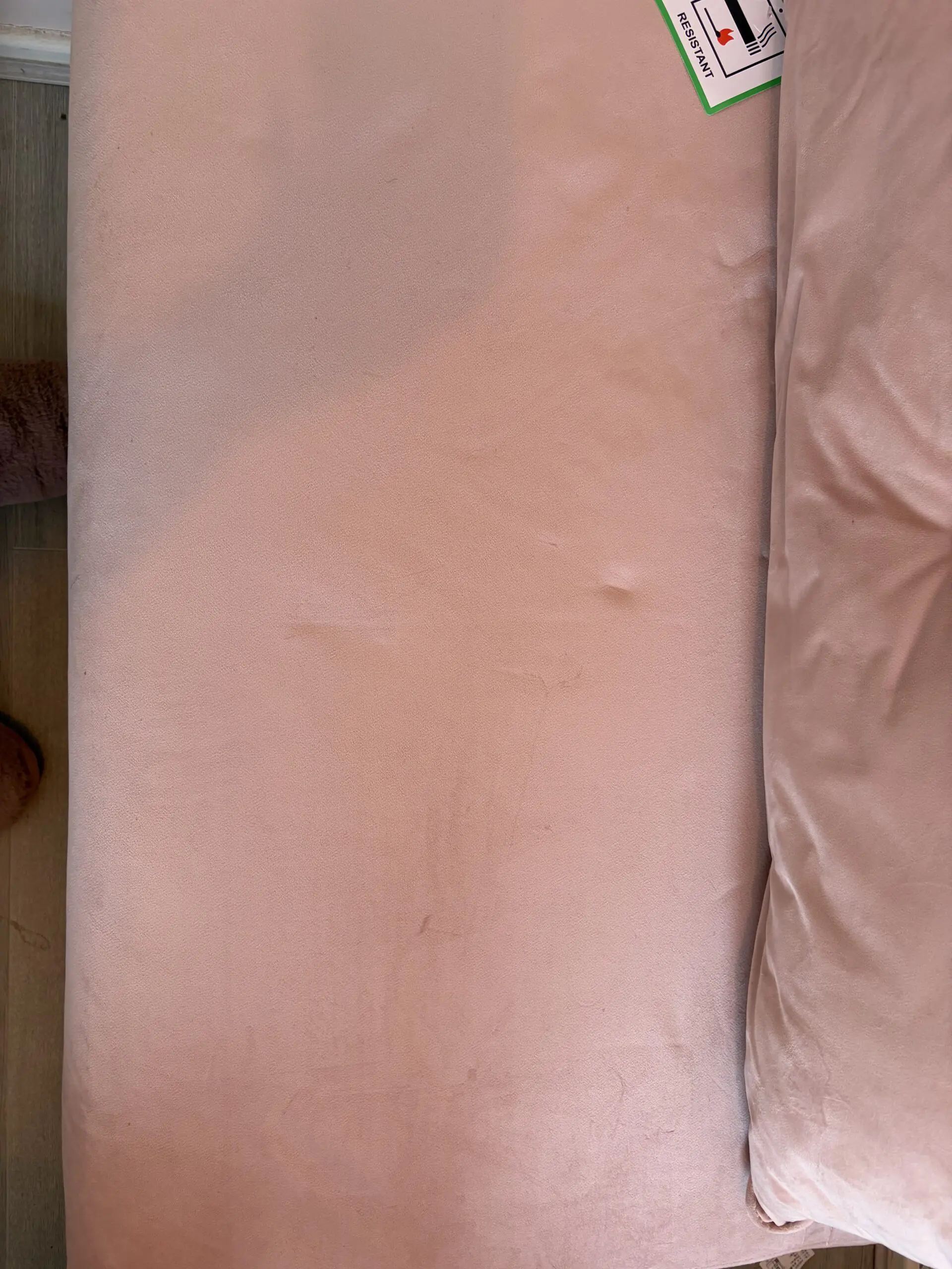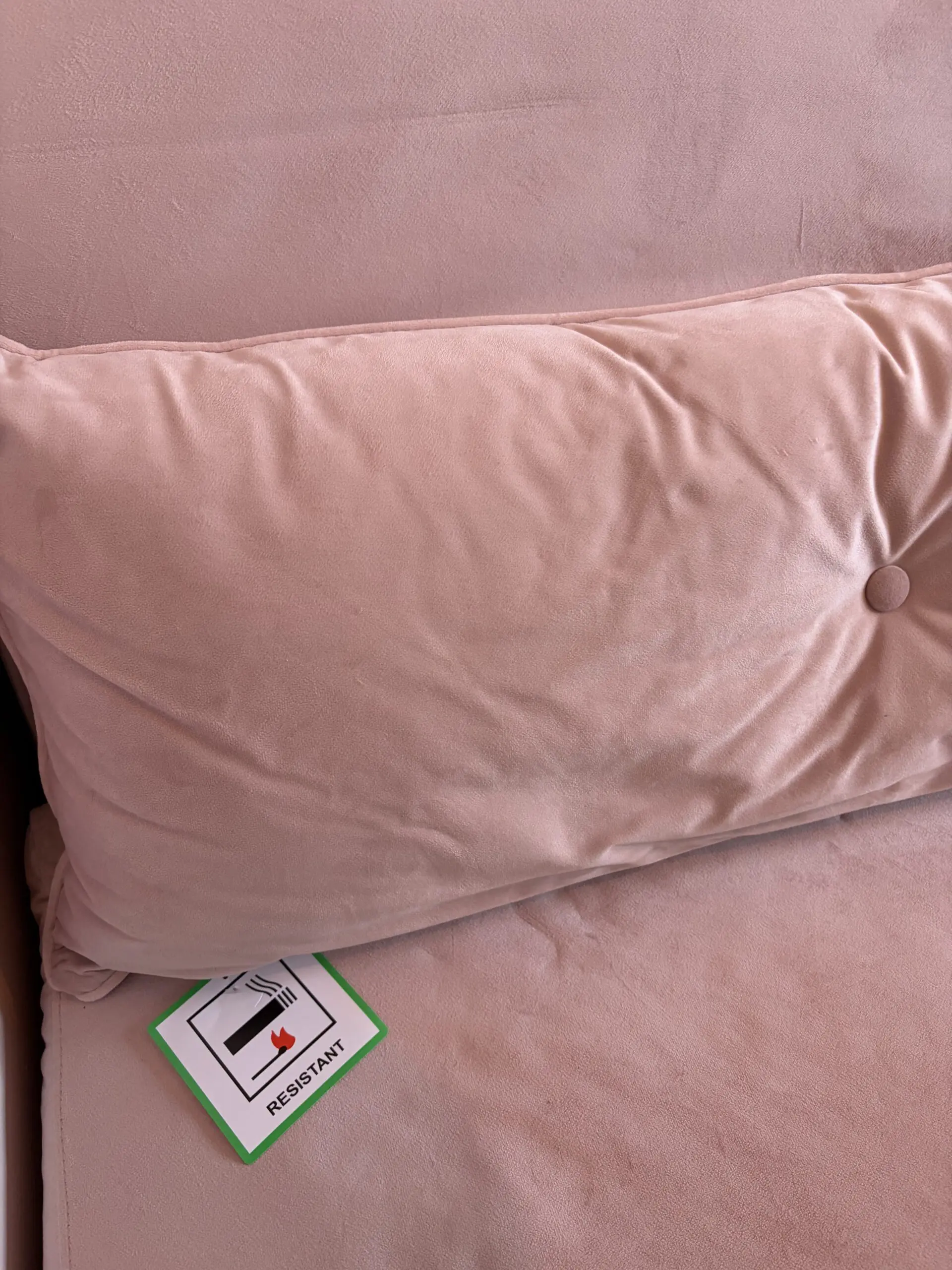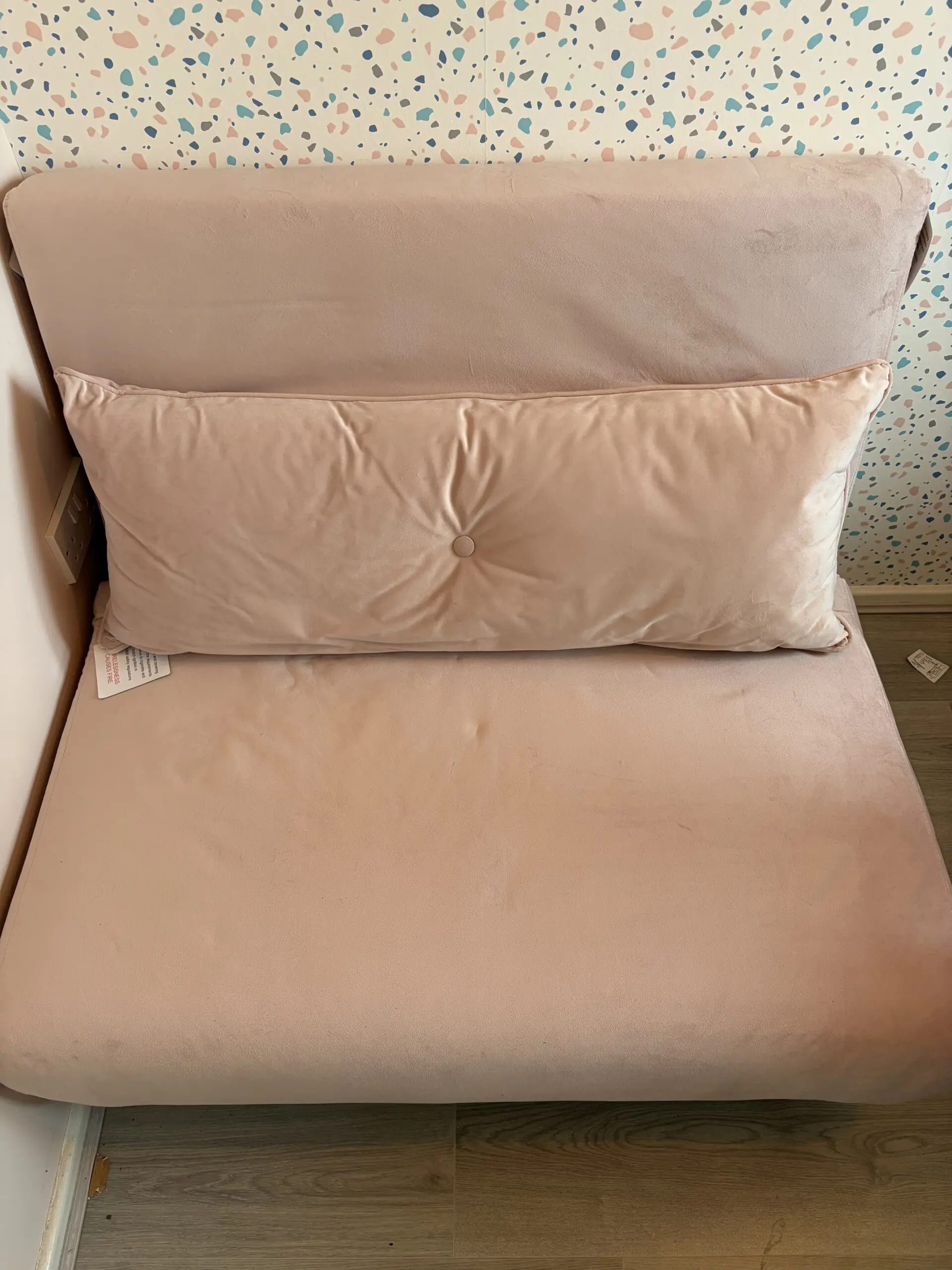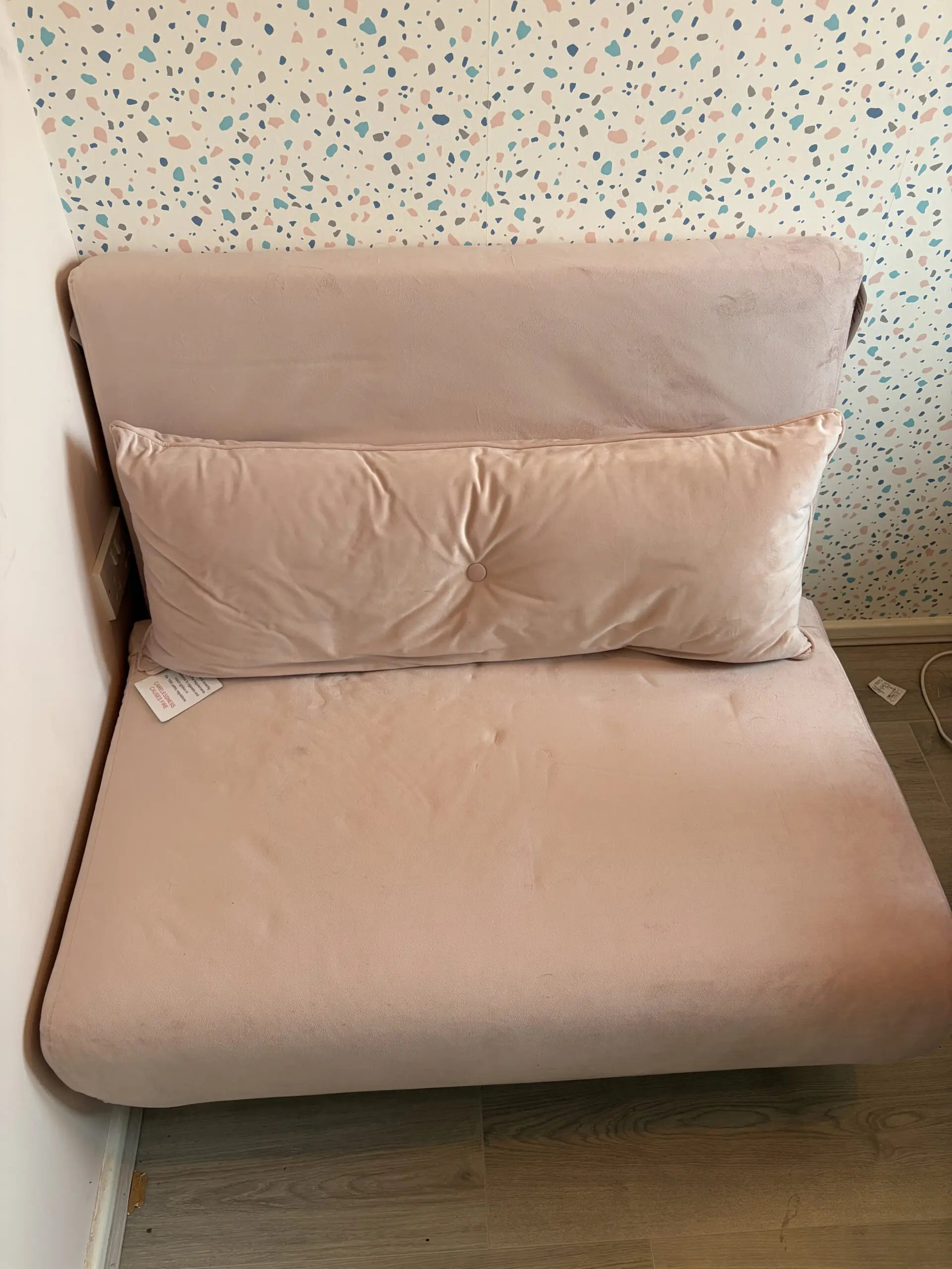 Slightly pinker than is coming out on pictures. Never slept on and rarely used. Velvet texture. Some indenting on seat from items left on it over time as can be seen in the picture. Sofa bed length when in bed formation is 190cm