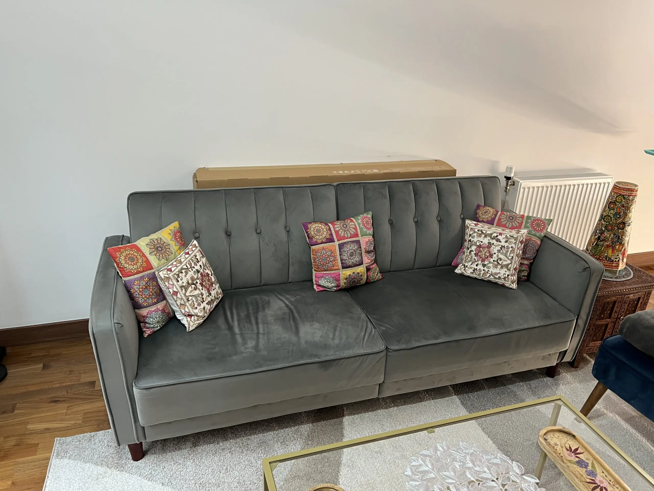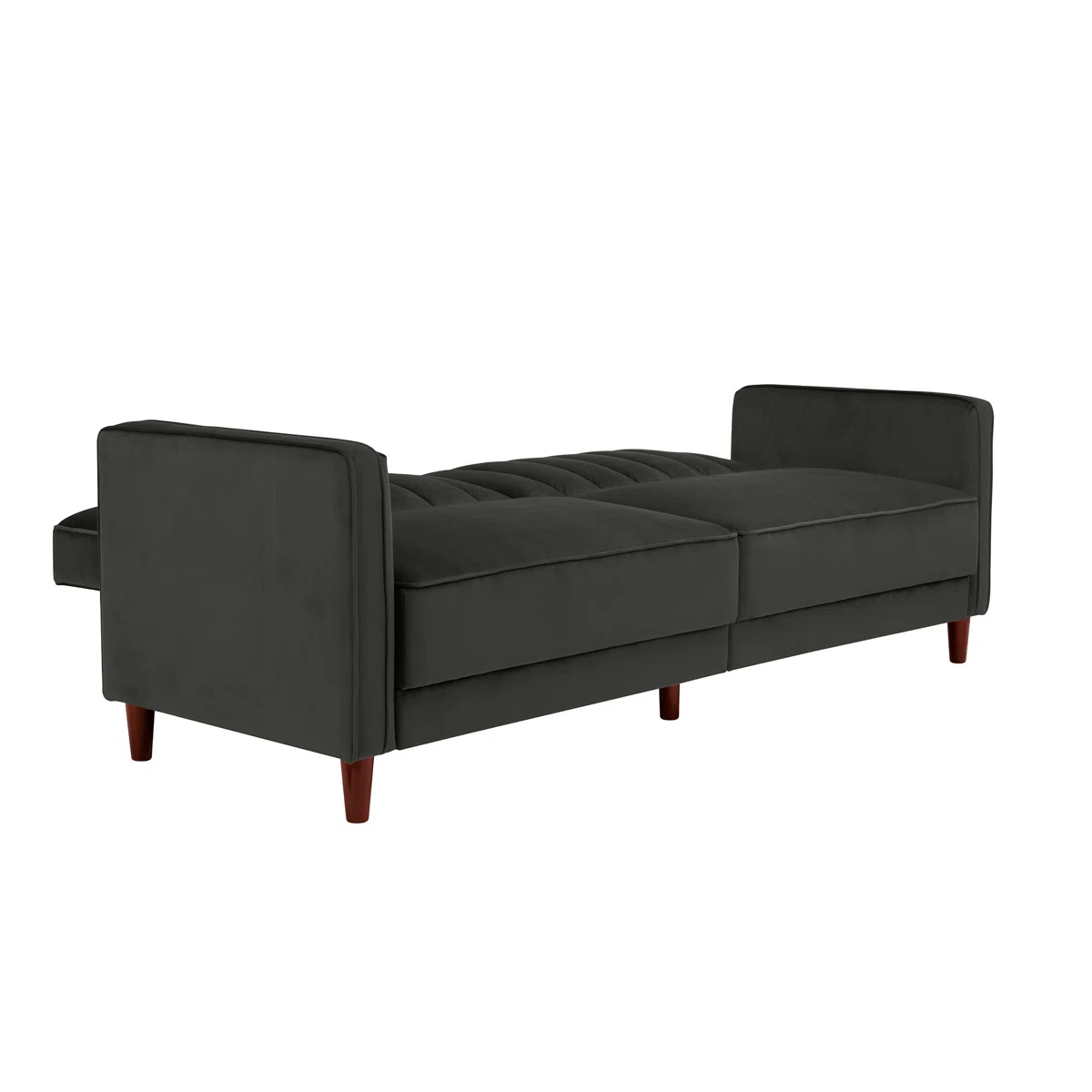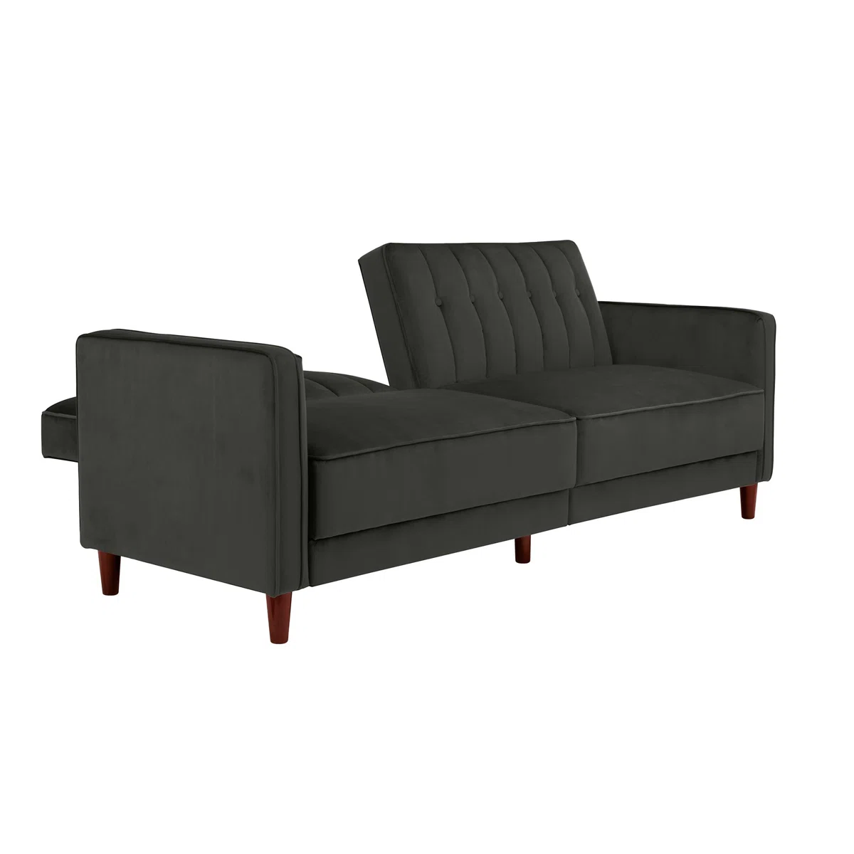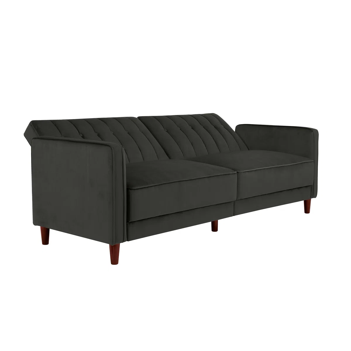 This sofa bed features a striking vintage-inspired design with soft velvet upholstery, square arms and back, vertical stitching, and button-tufted detailing. Tapered wooden legs and a clean, structured silhouette give it a modern yet classic look. It converts easily into a small double sofa bed using a manual Clic-Clac mechanism, making it practical for overnight guests.