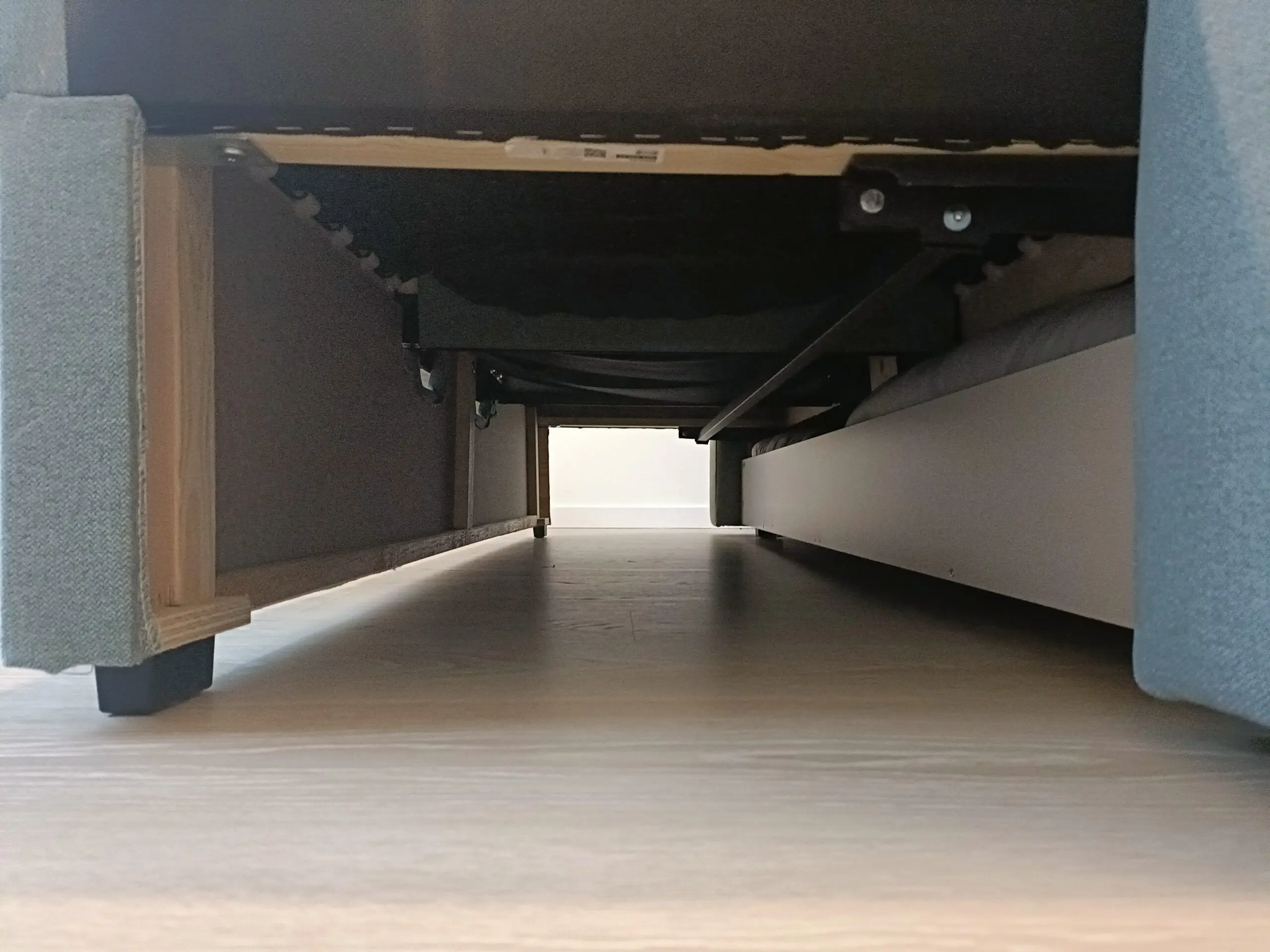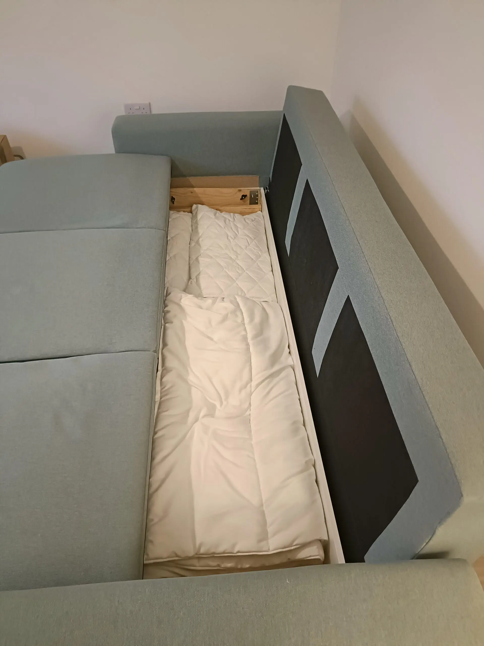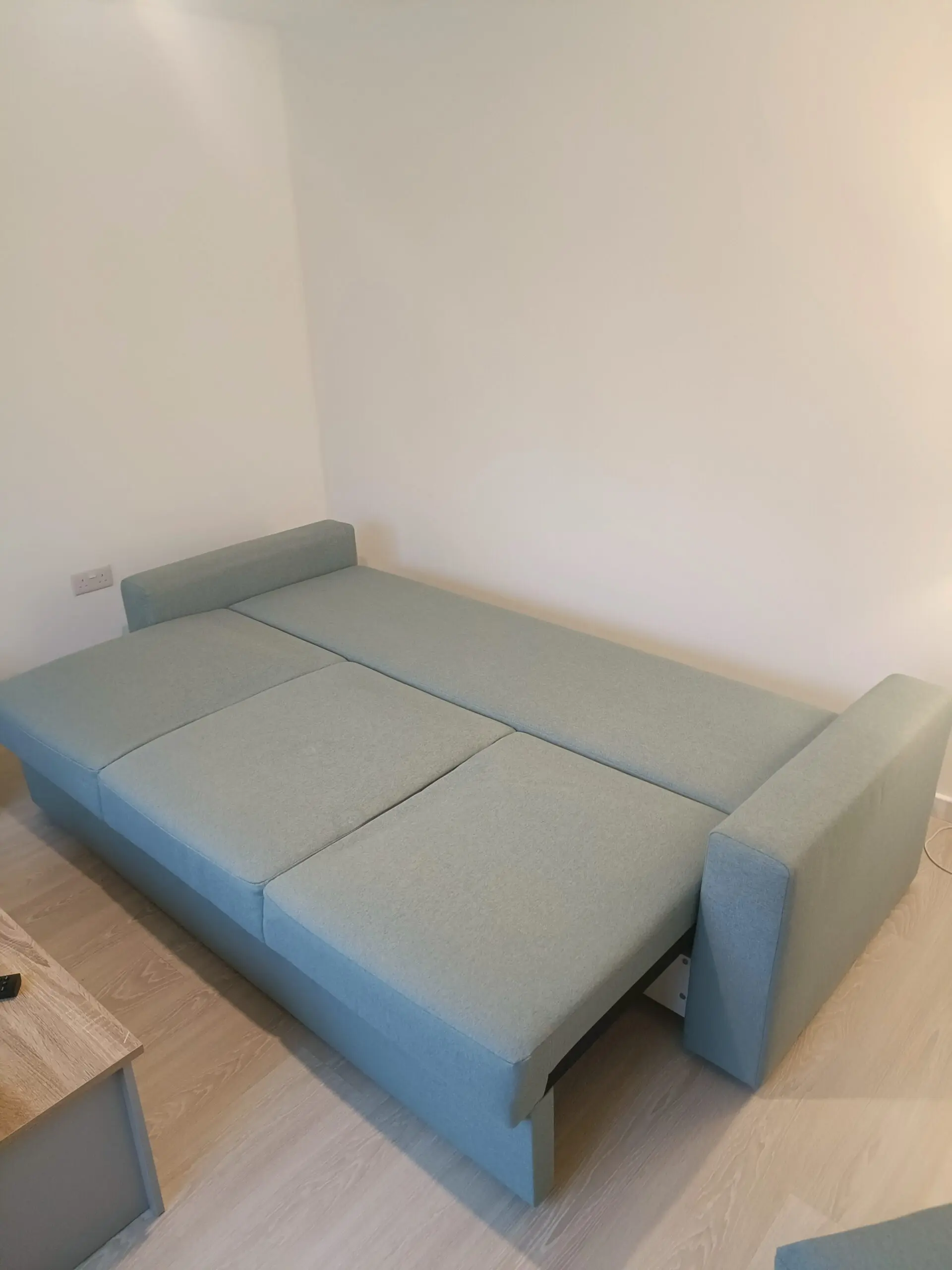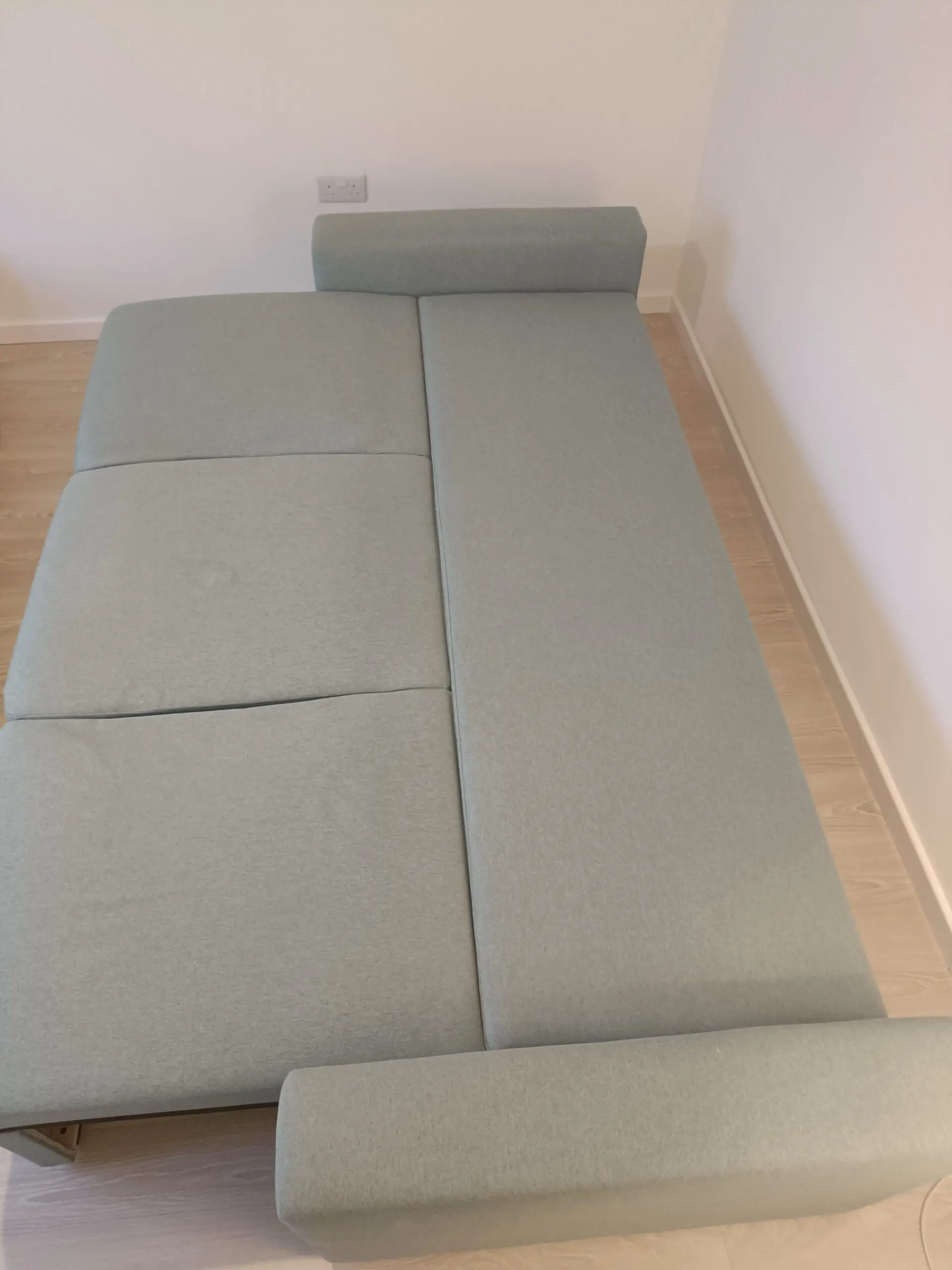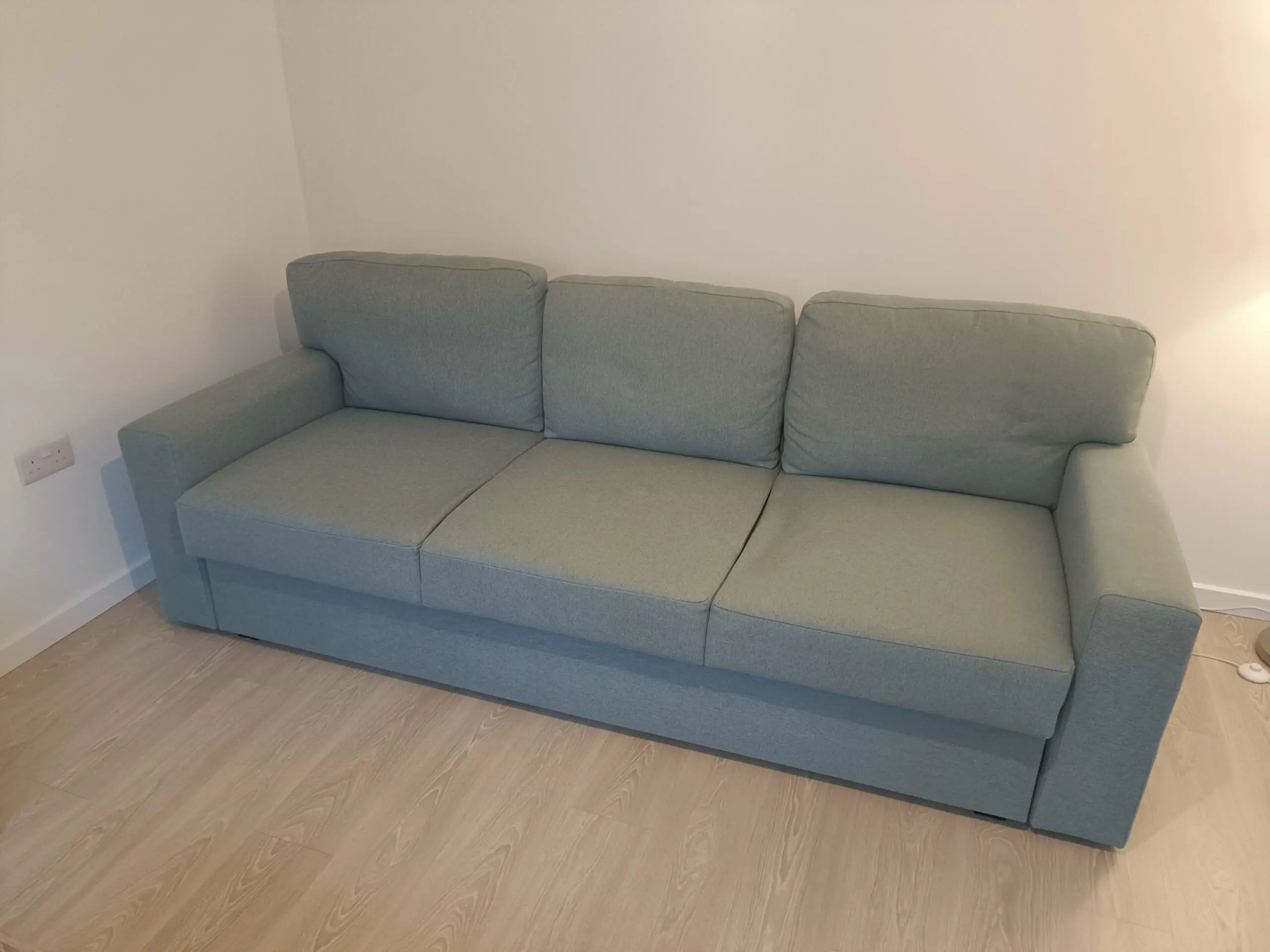 3-seat sofa-bed, Tibbleby light grey-turquoise. Seats come forward and backrest down to become sofa bed.