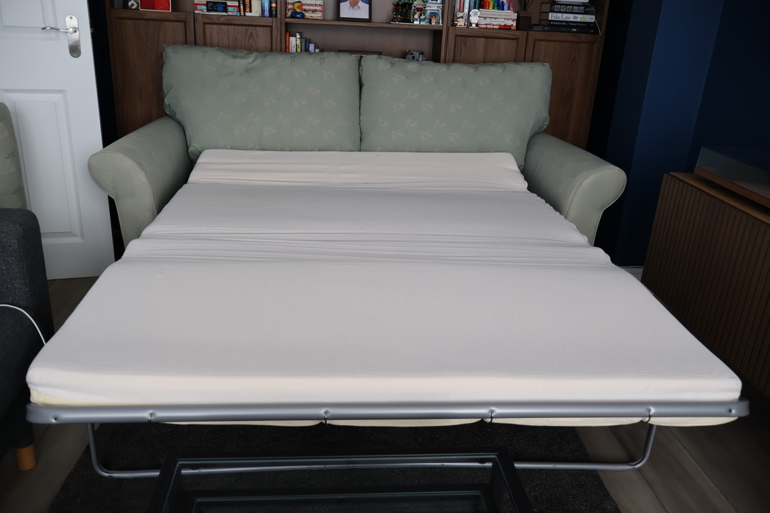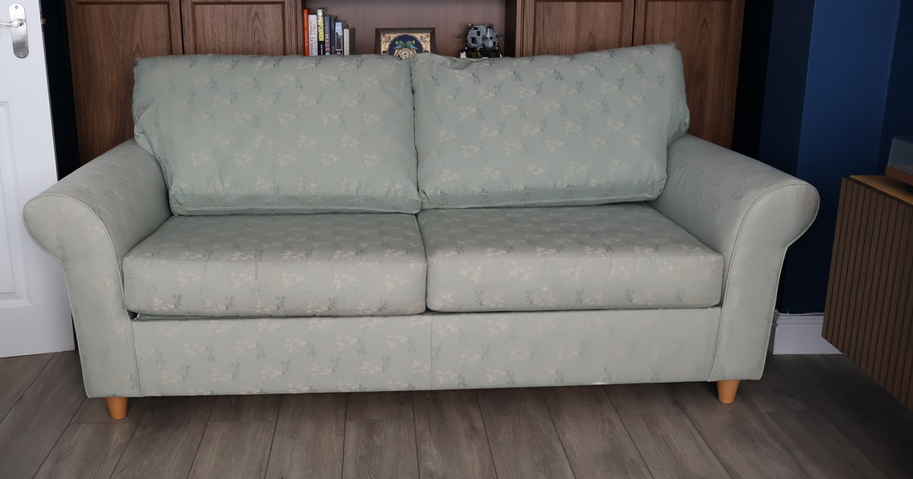 John Lewis 3-seater sofa bed in Duck Egg, and floral jacquard.