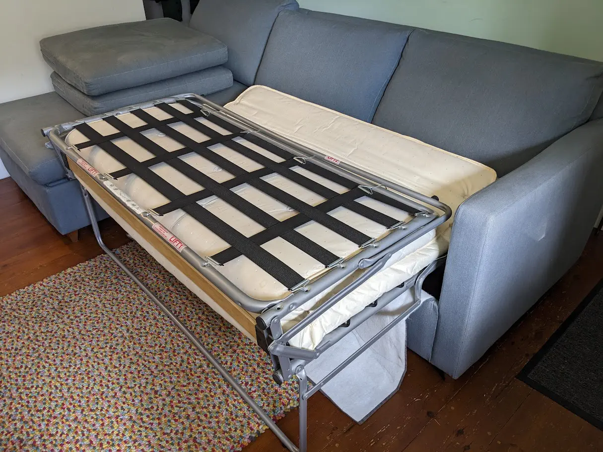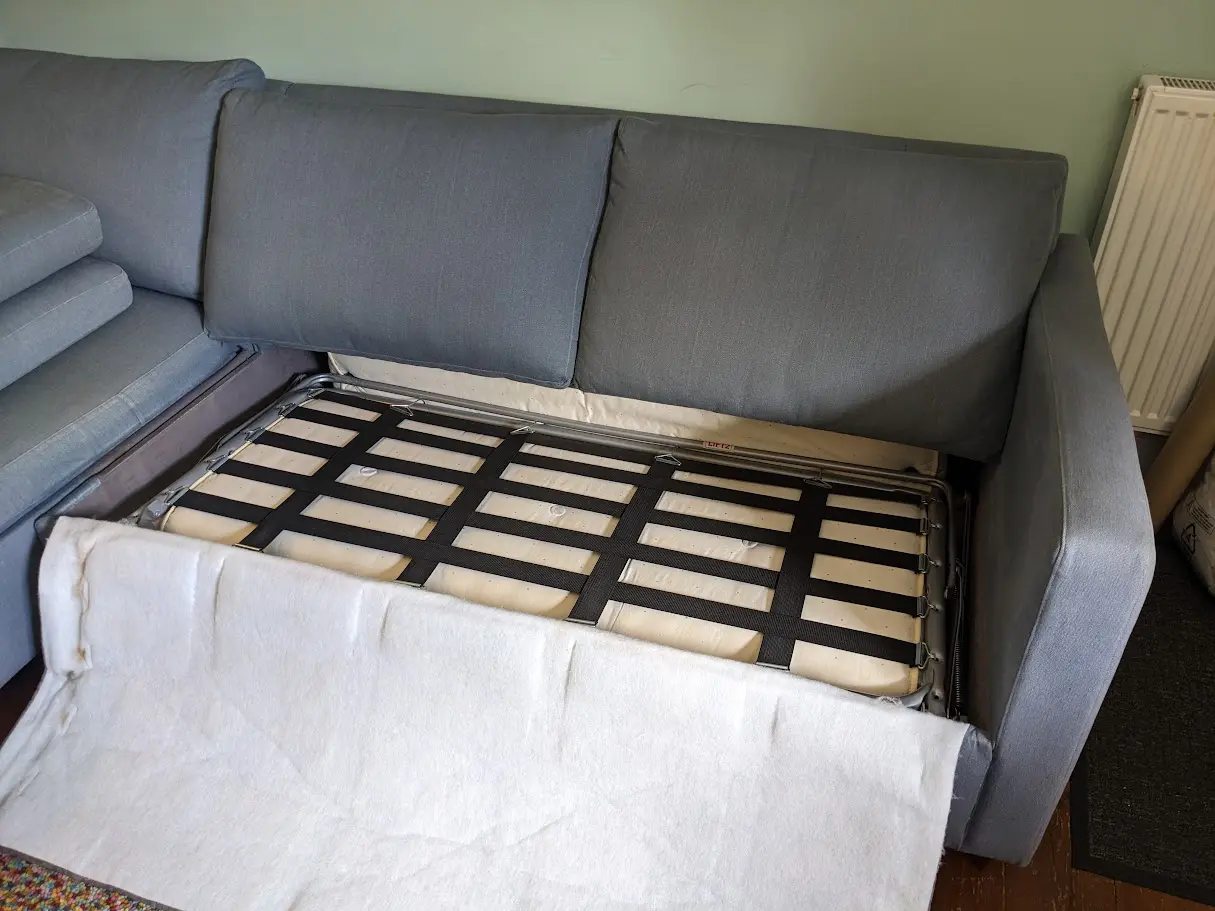 Lefthand facing L-shaped sofa with pull-out metal-framed double-width bed.