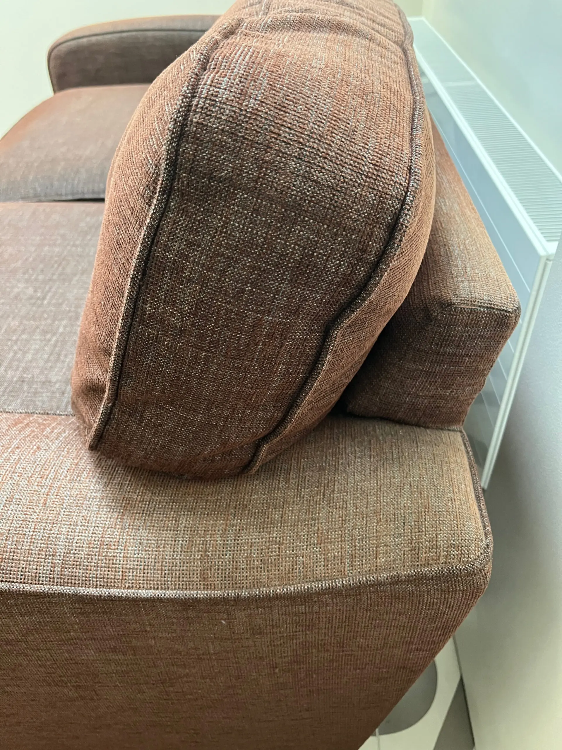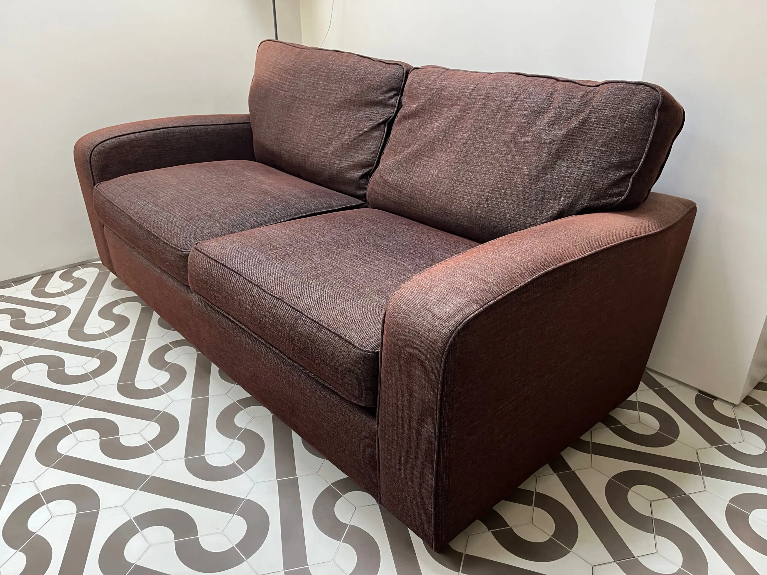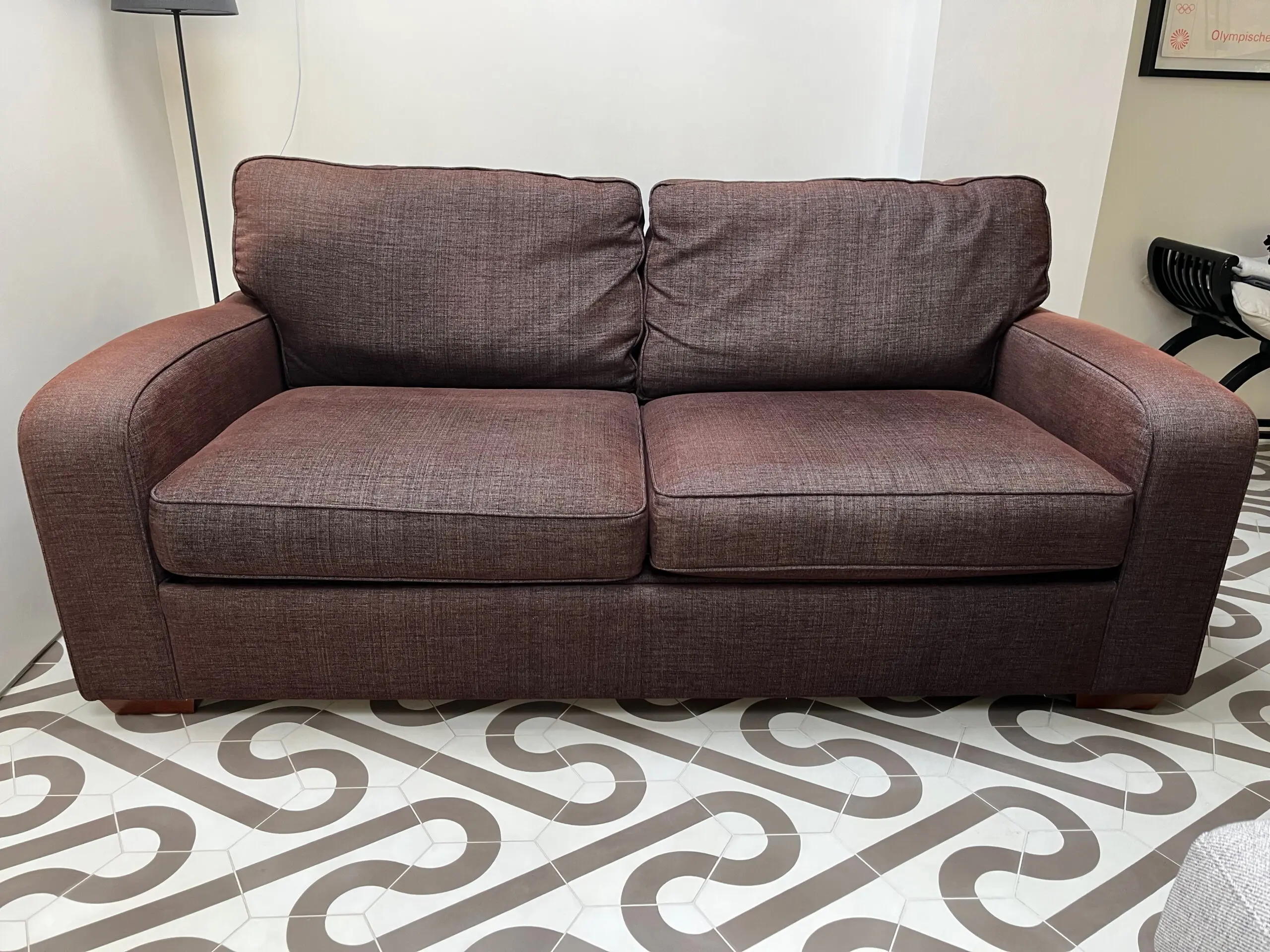 Very solid, great quality, John Lewis Roxy sofa bed. In woven brown material that can be cleaned. The colour has faded from the sun on the back of the arms because of the position in the room. The sofa is very clean. Sofa is very comfortable to sit on and has retained its shape well. The sofa is 186cm wide, 90cm high, 93cm from the front to the widest part of the back, note the back has a slight angle to it. The seat height is 45cm from the ground, and 63cm from the front seat cushion to the back cushion.