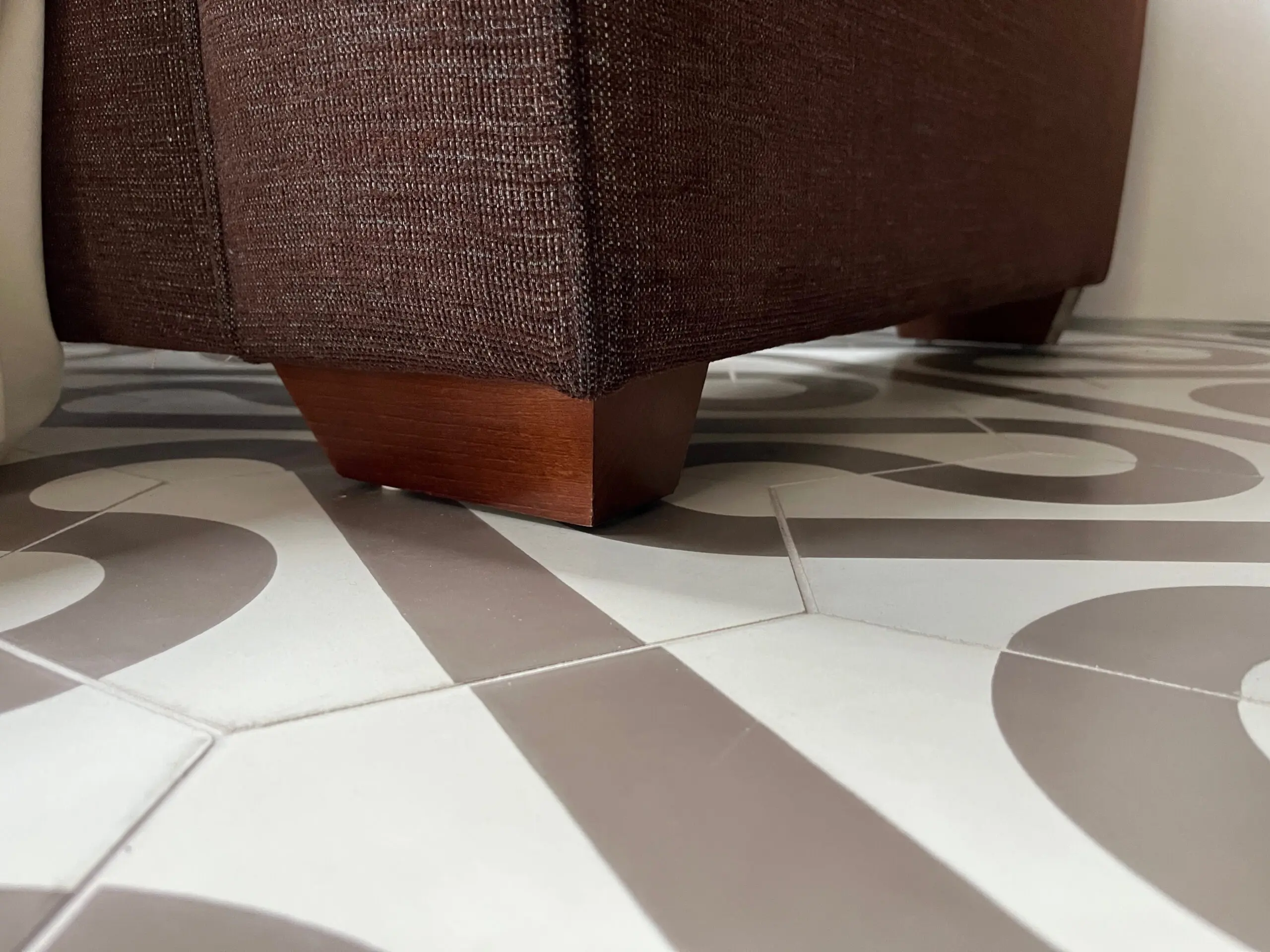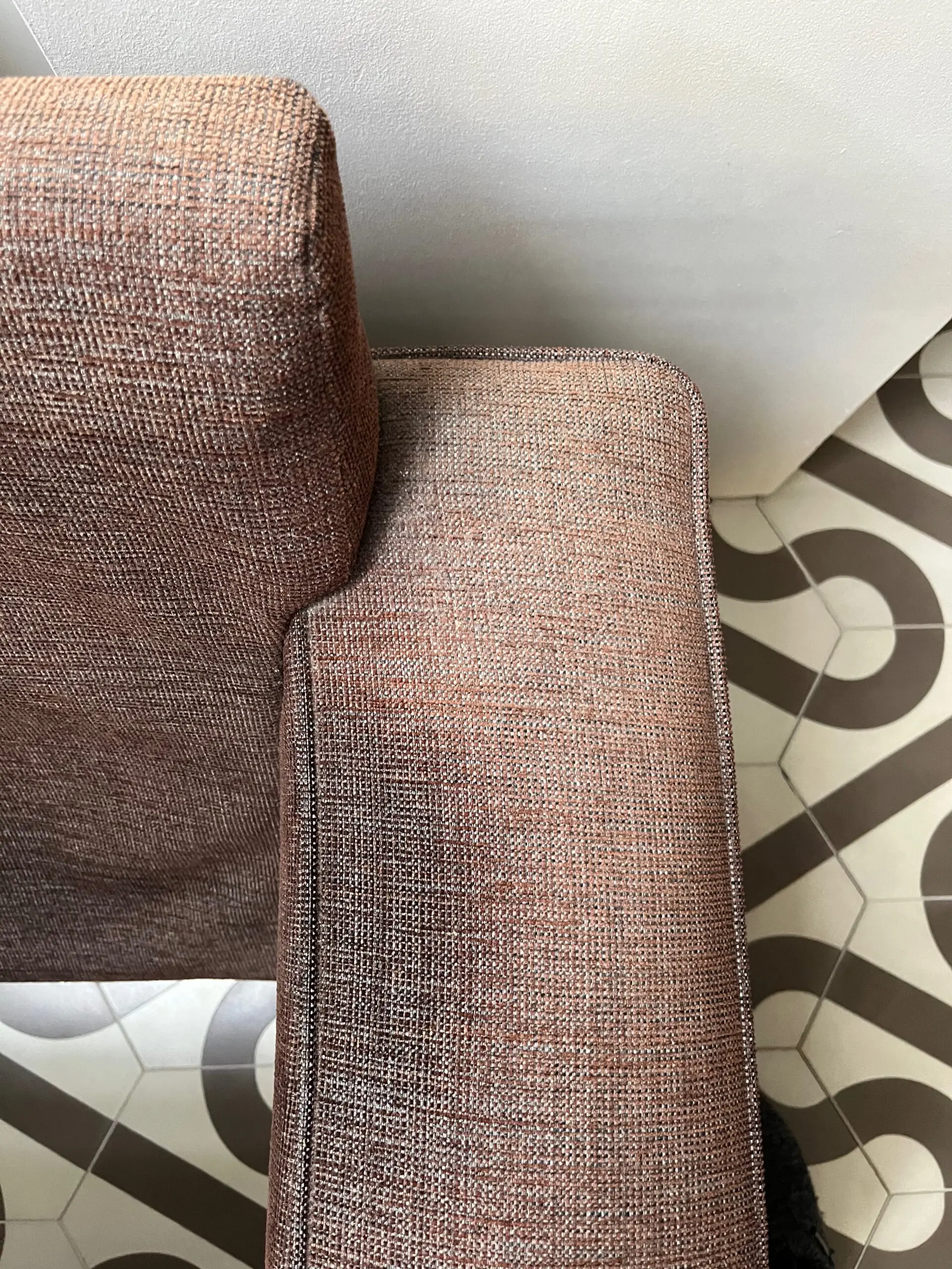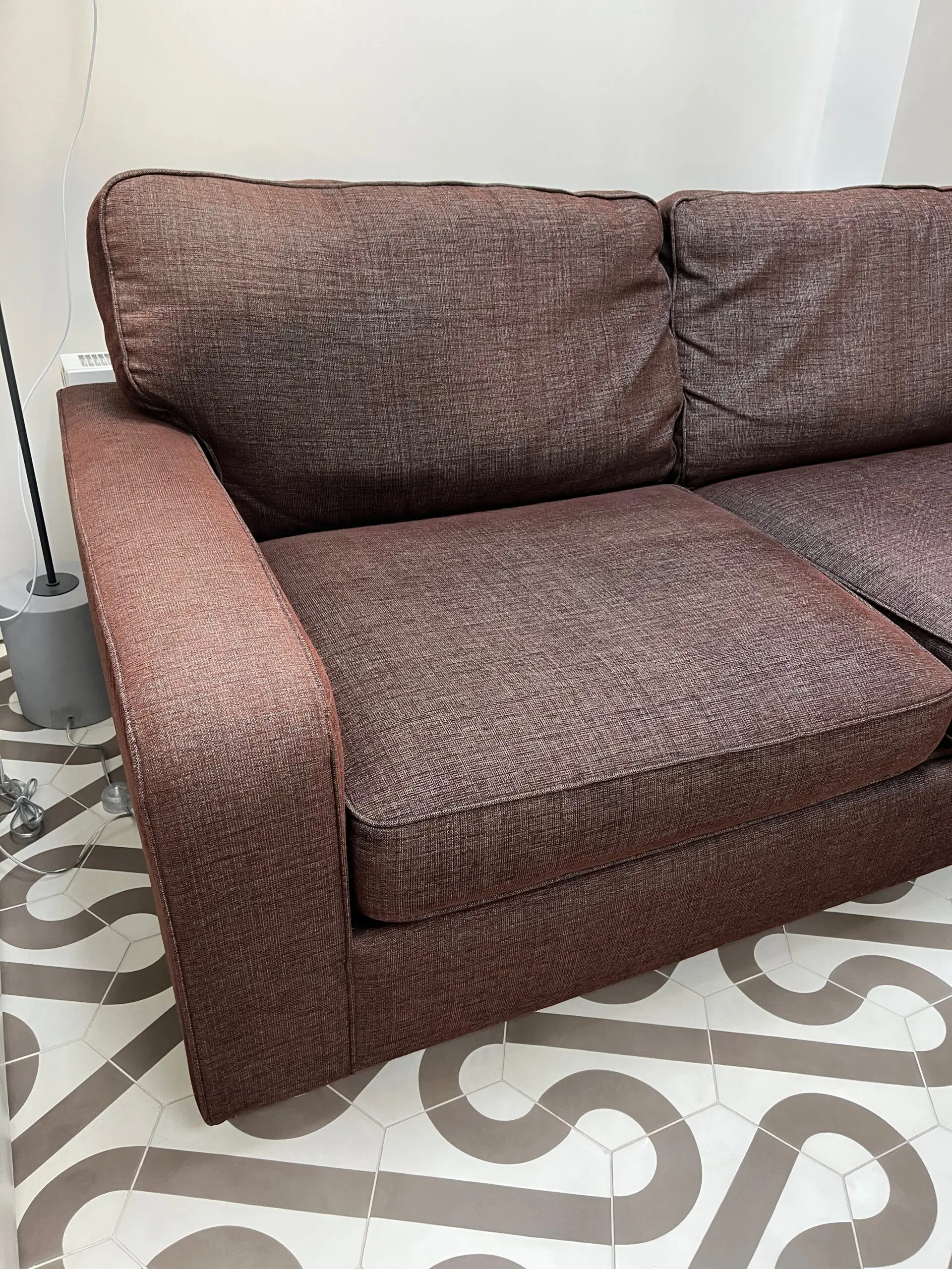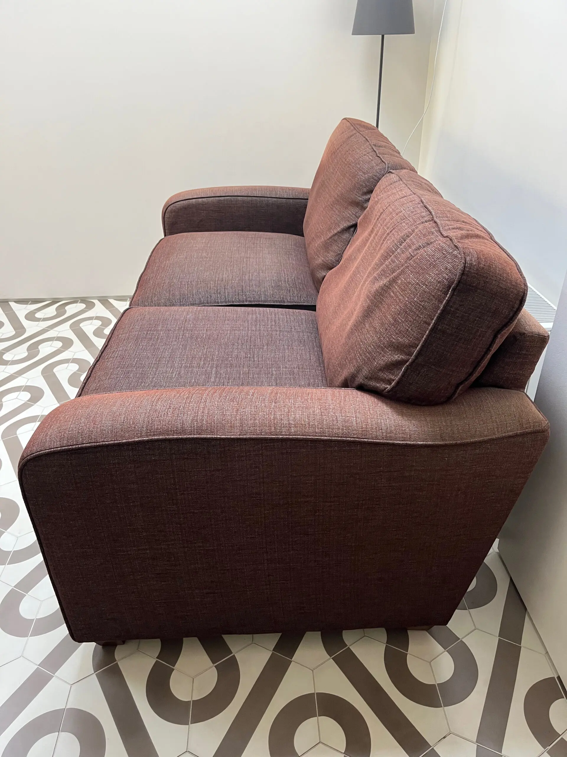 Very solid, great quality, John Lewis Roxy sofa bed. In woven brown material that can be cleaned. The colour has faded from the sun on the back of the arms because of the position in the room. The sofa is very clean. Sofa is very comfortable to sit on and has retained its shape well. The sofa is 186cm wide, 90cm high, 93cm from the front to the widest part of the back, note the back has a slight angle to it. The seat height is 45cm from the ground, and 63cm from the front seat cushion to the back cushion.