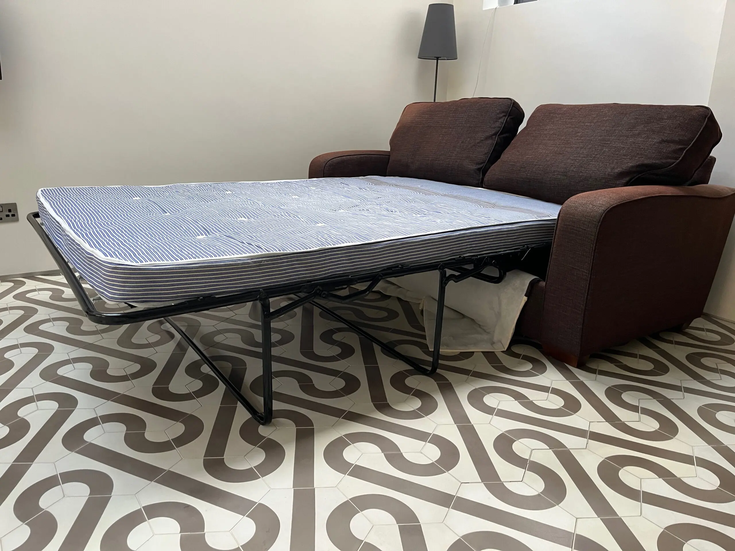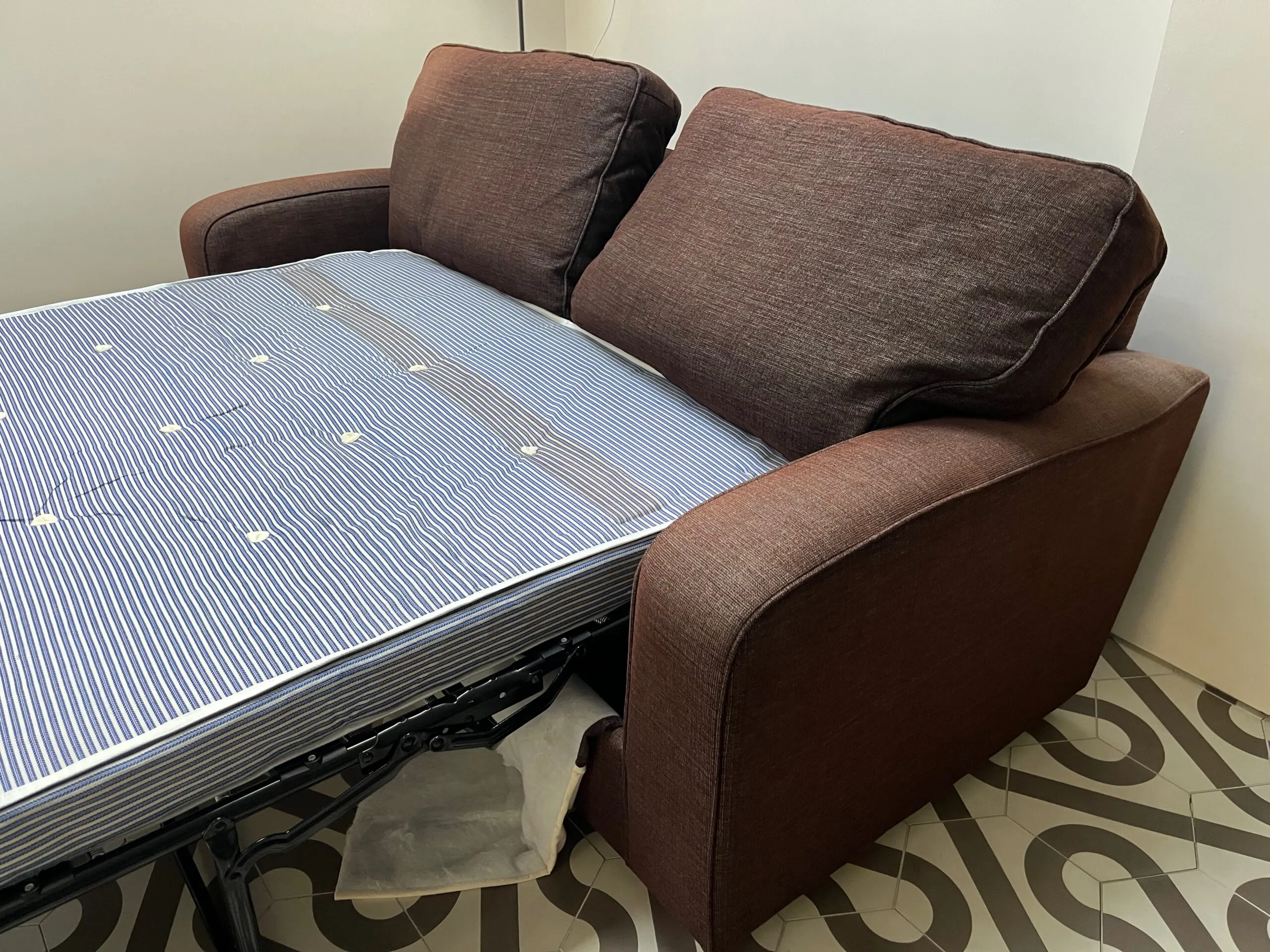 The mattress has marks from the mechanism as it hasn’t been used very often, so stays in sofa set up for years. Mattress size 177cm wide, 134cm long, and 10cm deep.
