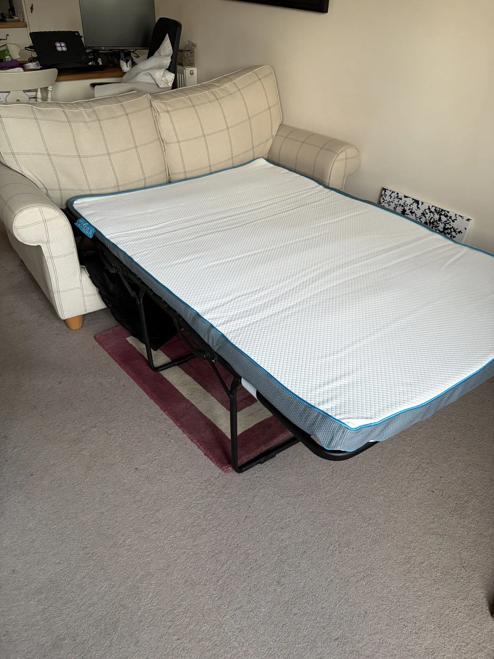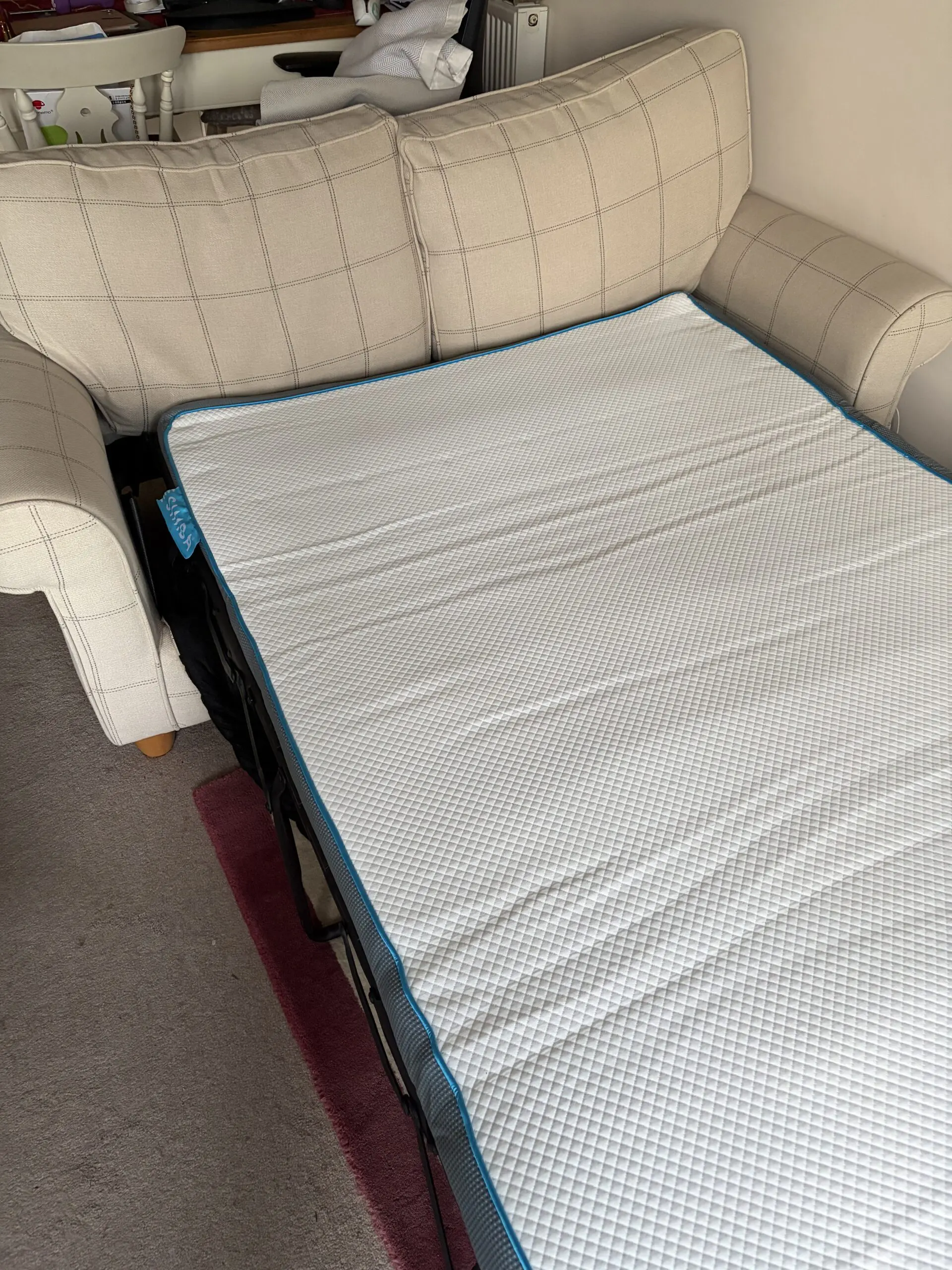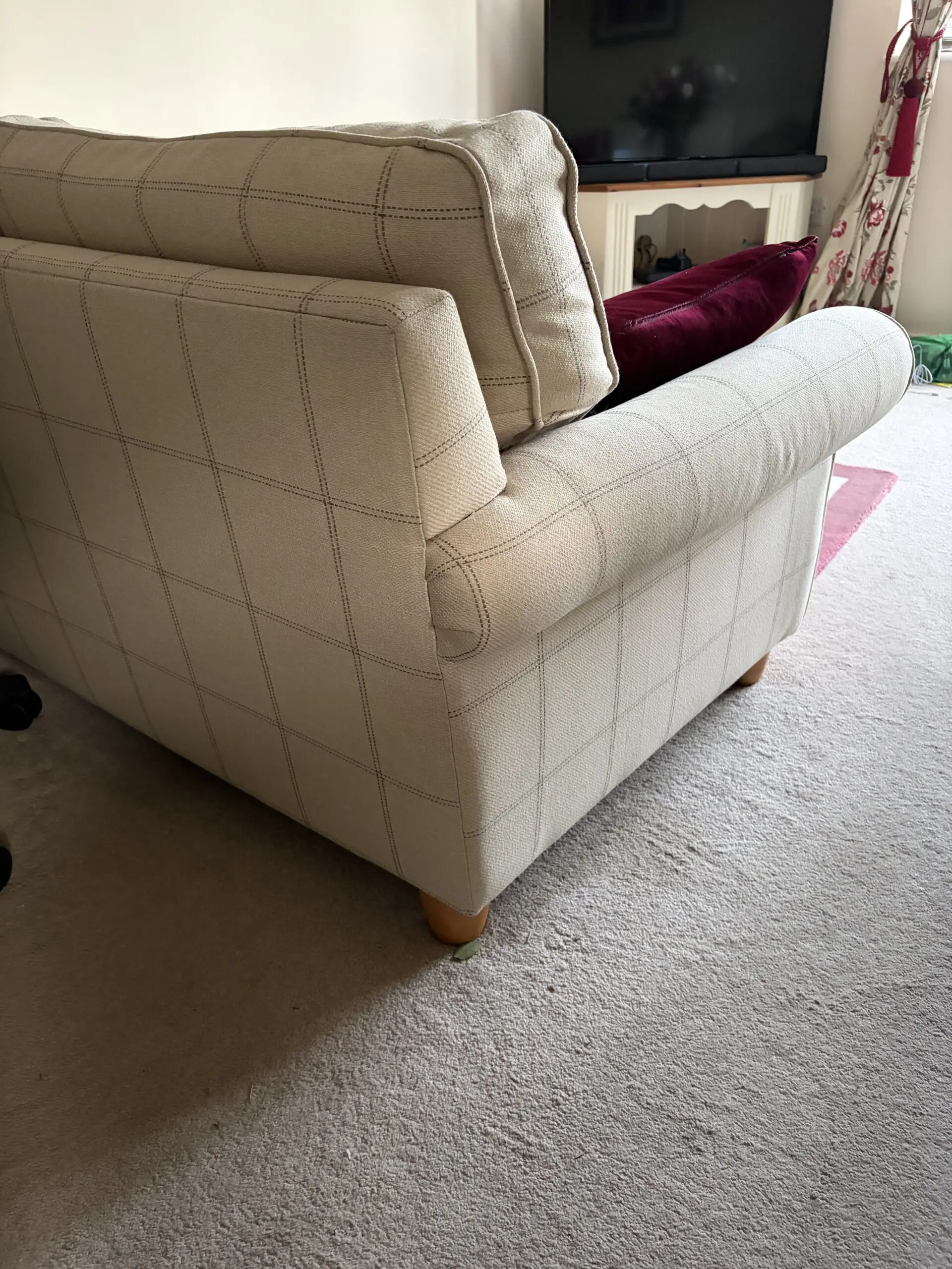 Lovely beige/oatmeal sofabed with large light grey large checked pattern. Clean Simba mattress included. Small stain on one seat