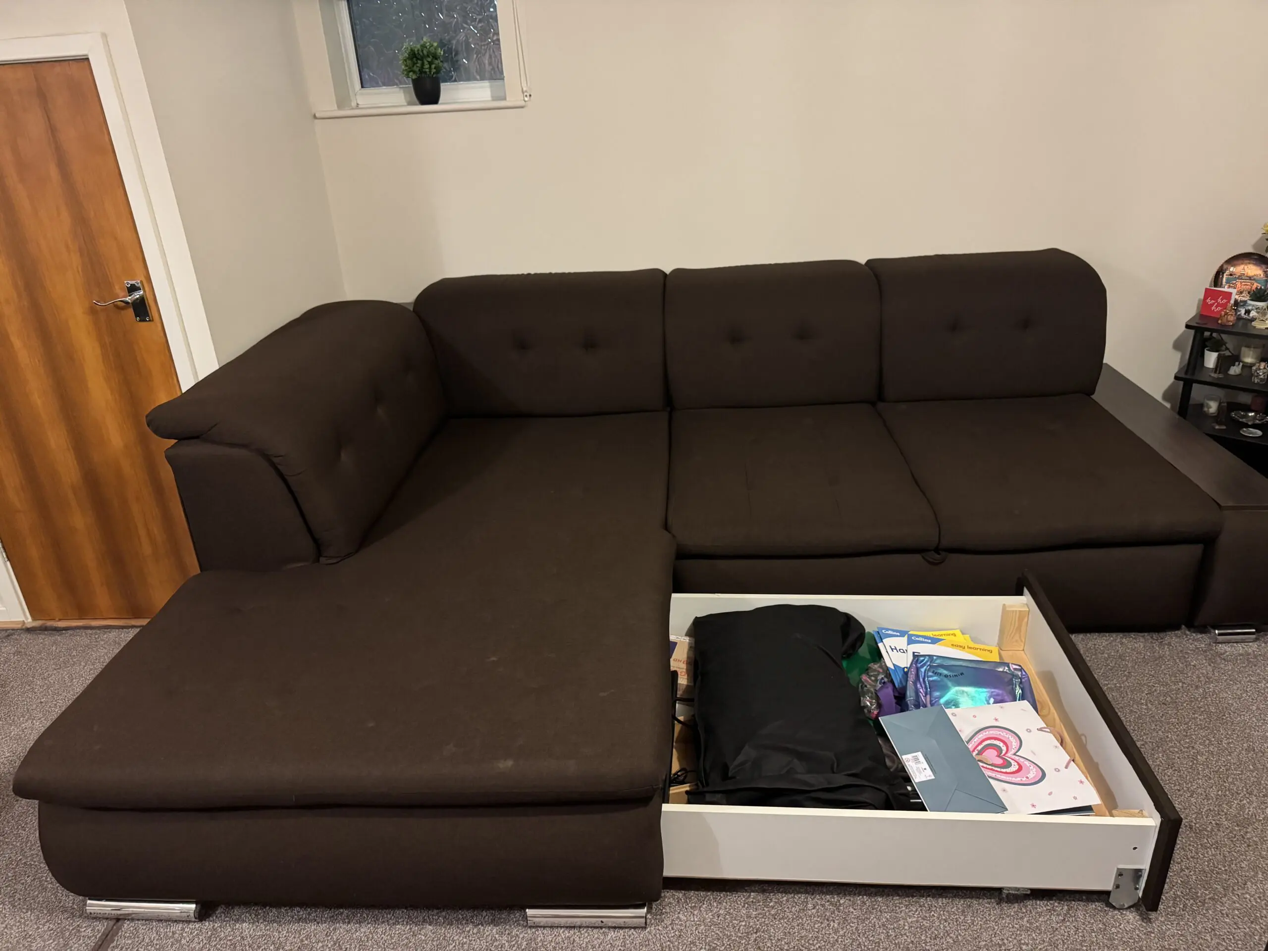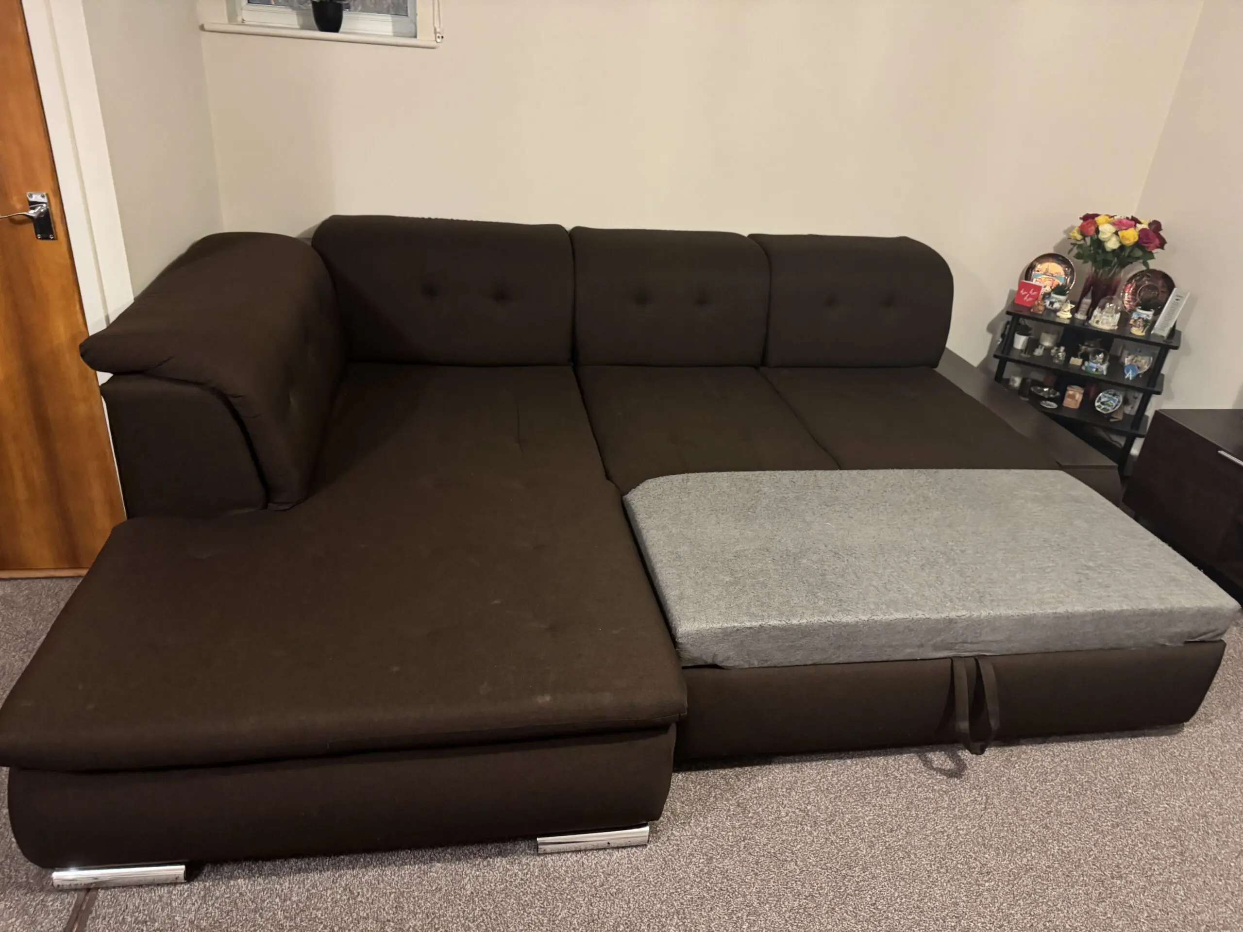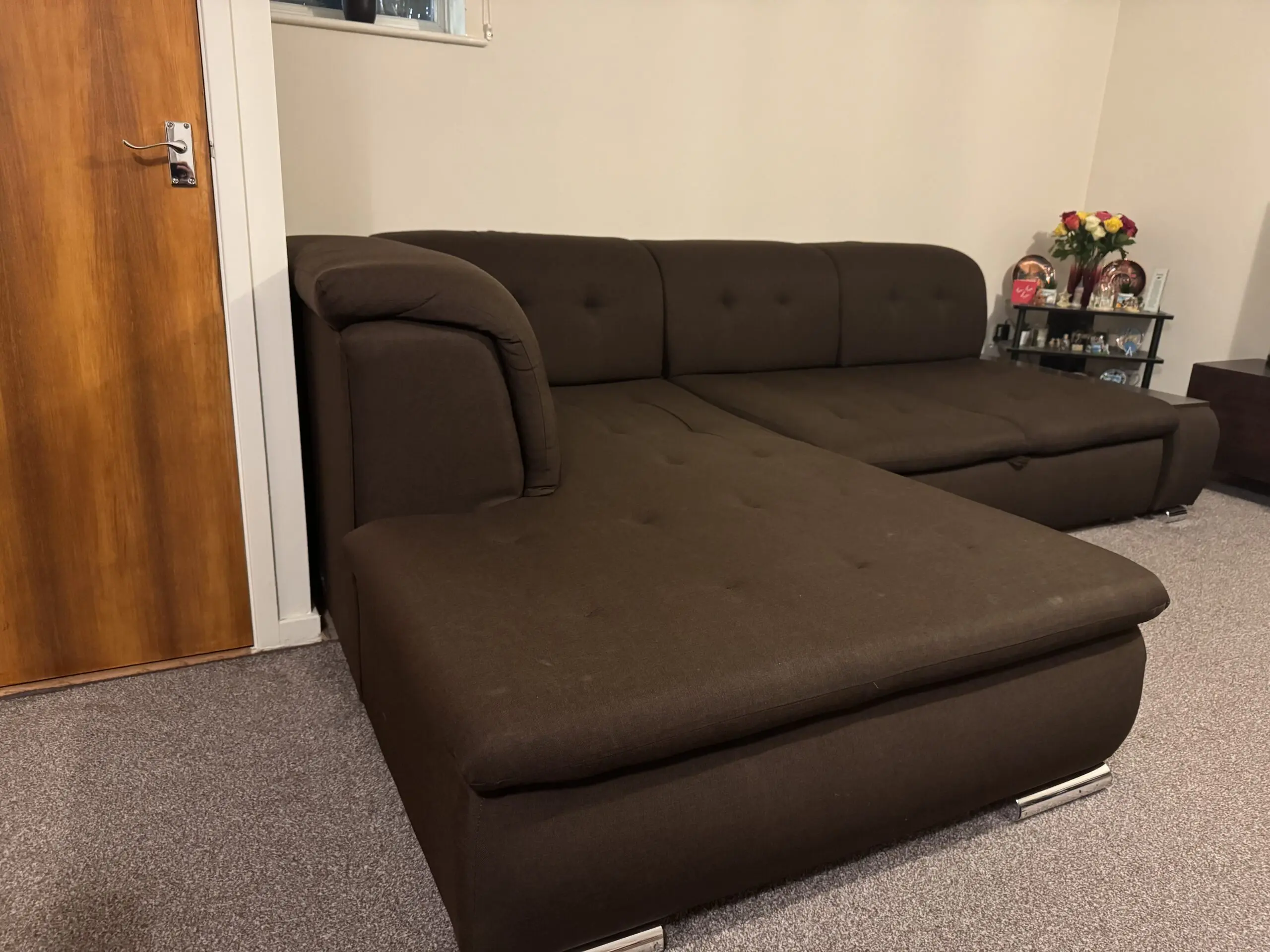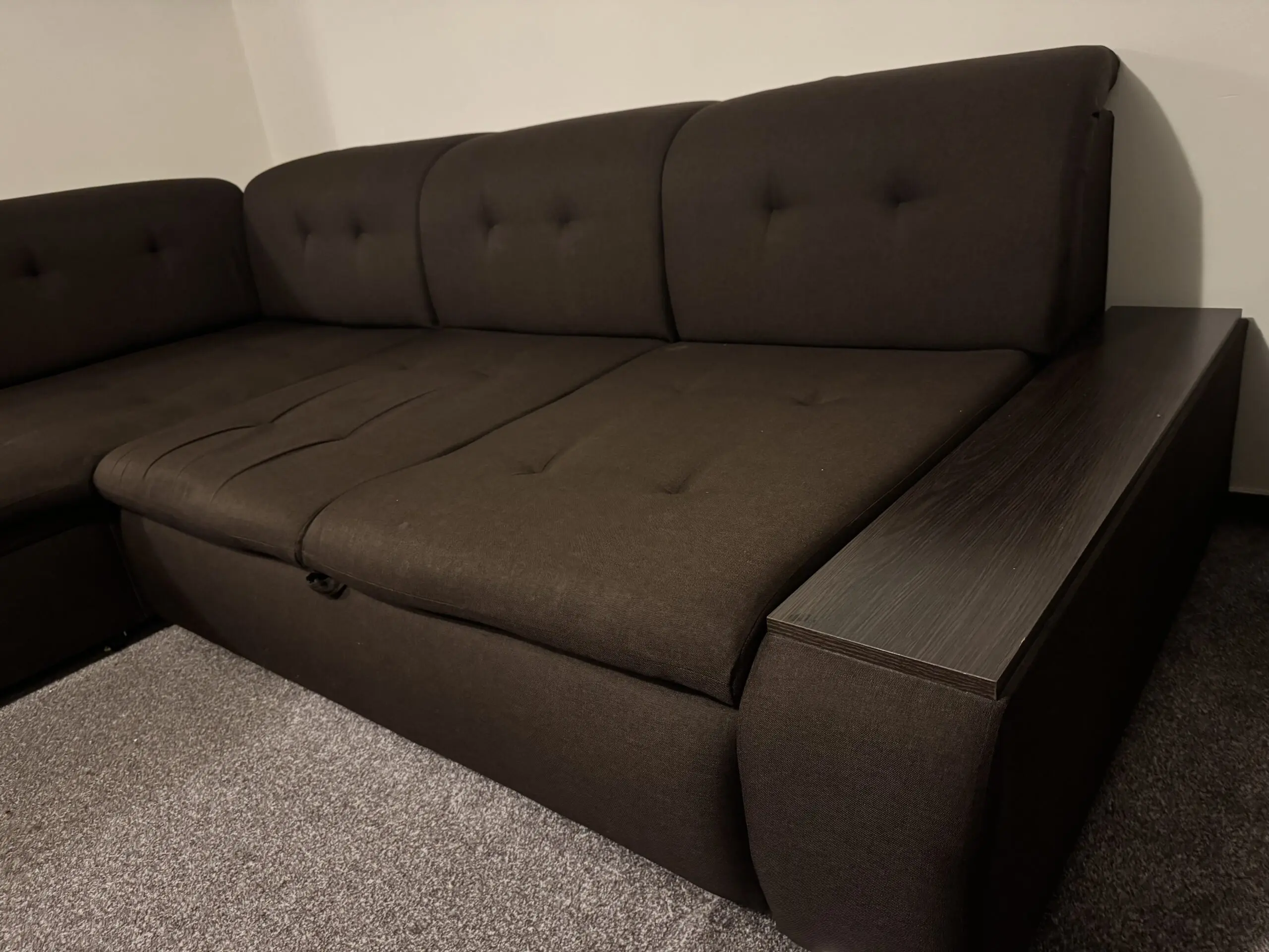 Brilliant Corner Sofa Bed with storage. Dark brown colour. Good condition. No tears in the fabric. No scratches in the wood. Dimensions: long arm, 270cm, short arm 206 cm, depth 80cm, height 40cm. Sleeping area: 212cm x 150cm.
