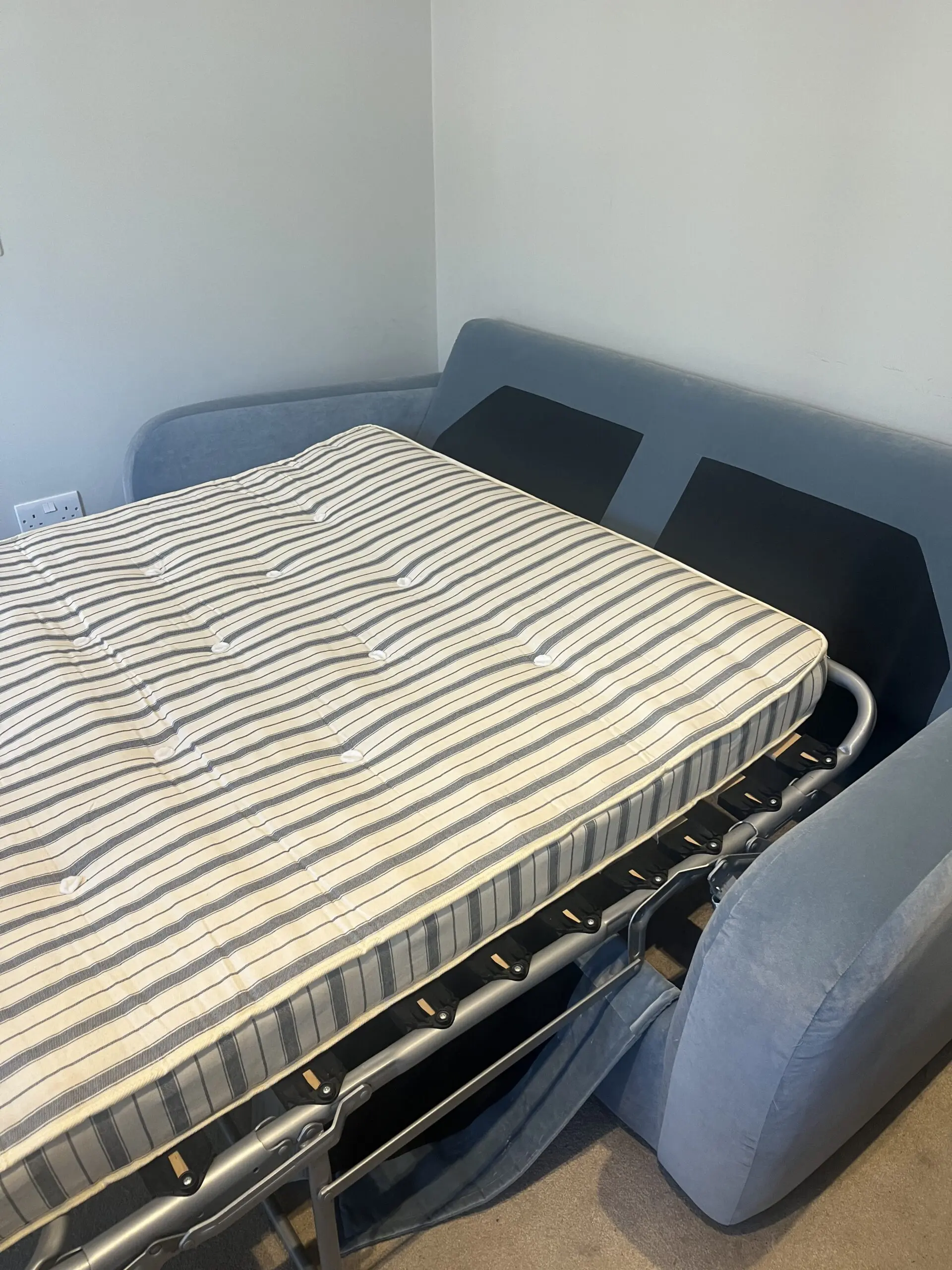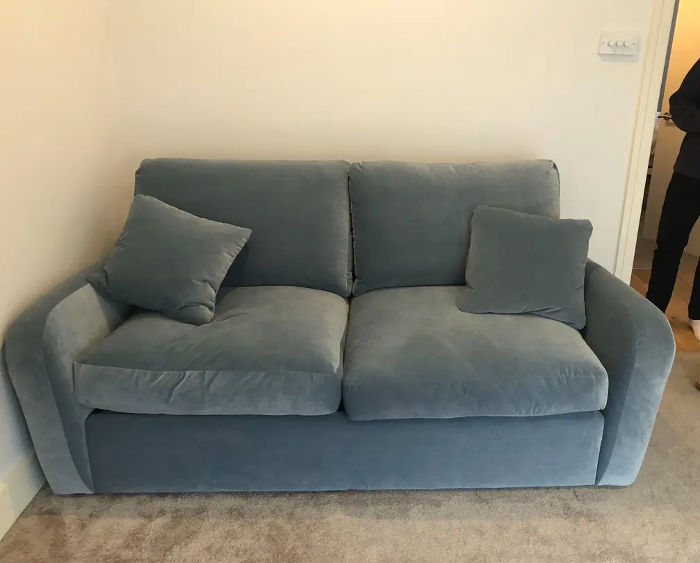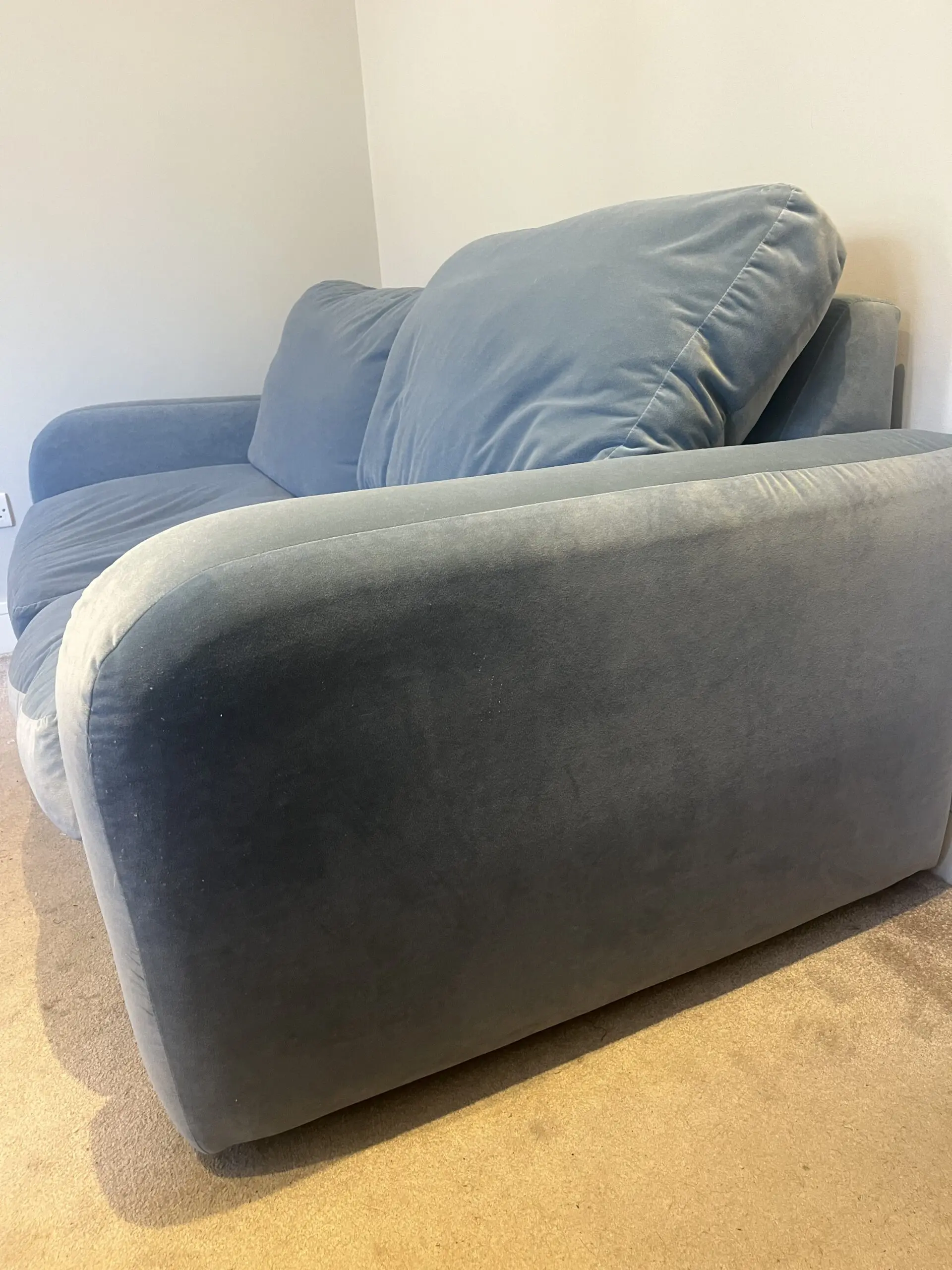 Loaf Easy Squeeze sofa bed, in a great condition. Sofa bed only used a couple of times. In a lovely blue velvet colour, in clever velvet (Loaf’s spill resistant fabric). Bought 4 years ago for £2400.
