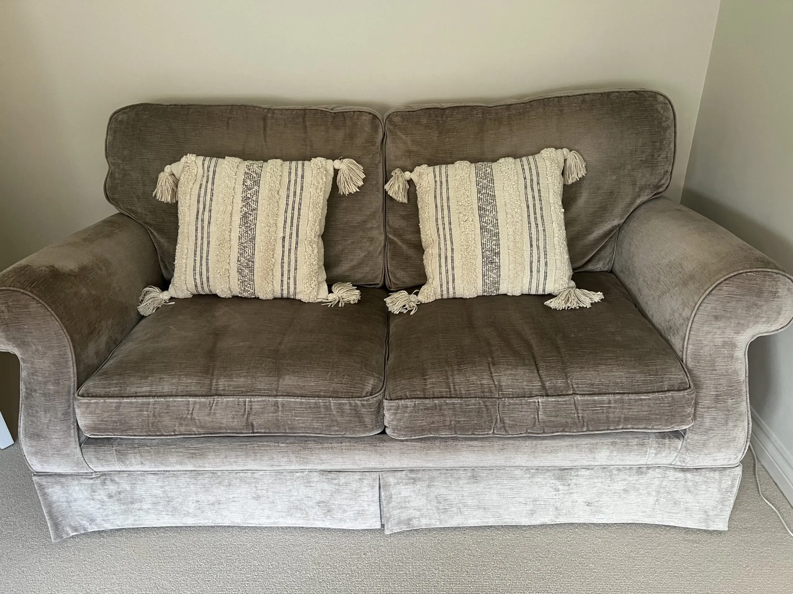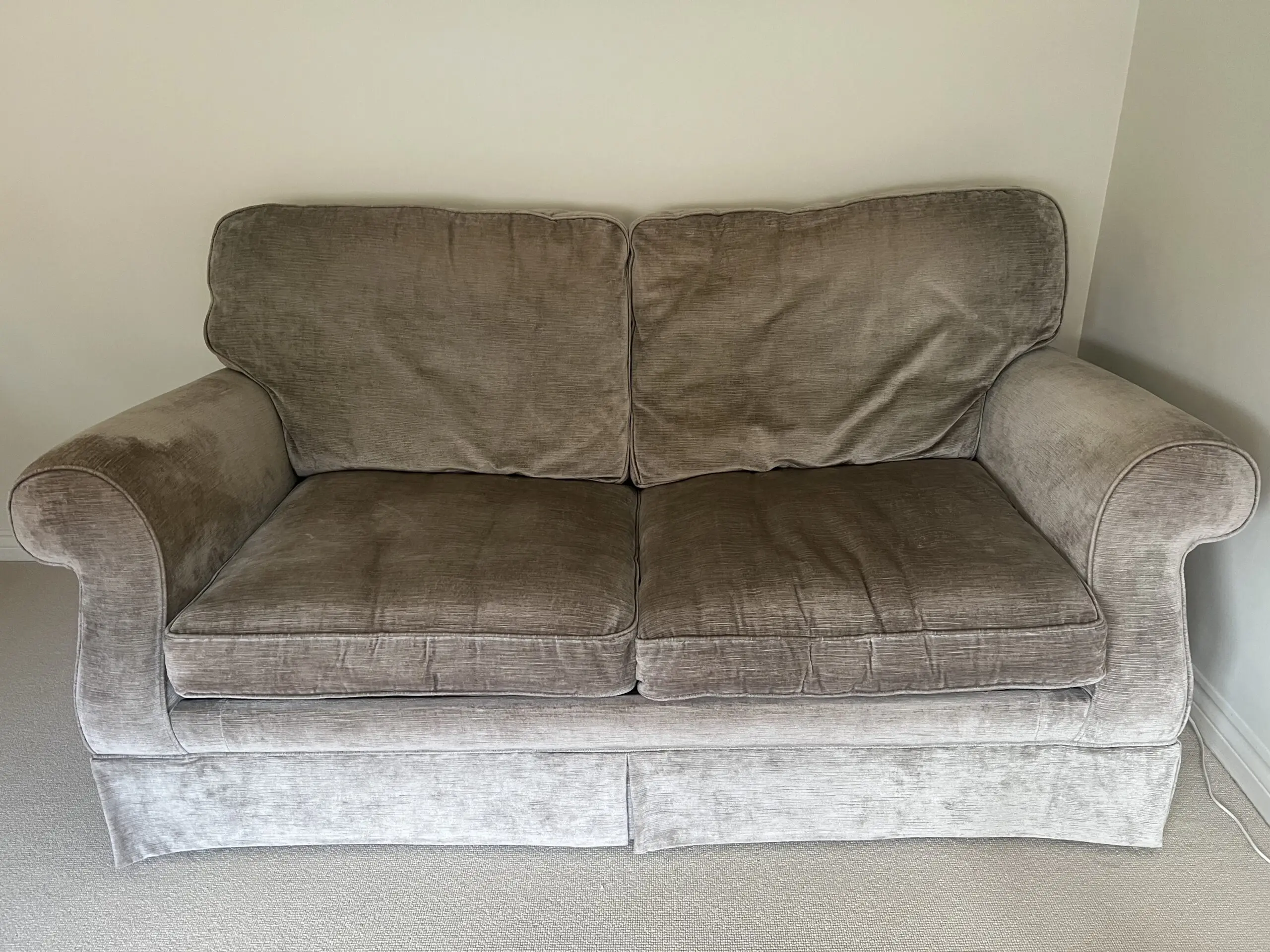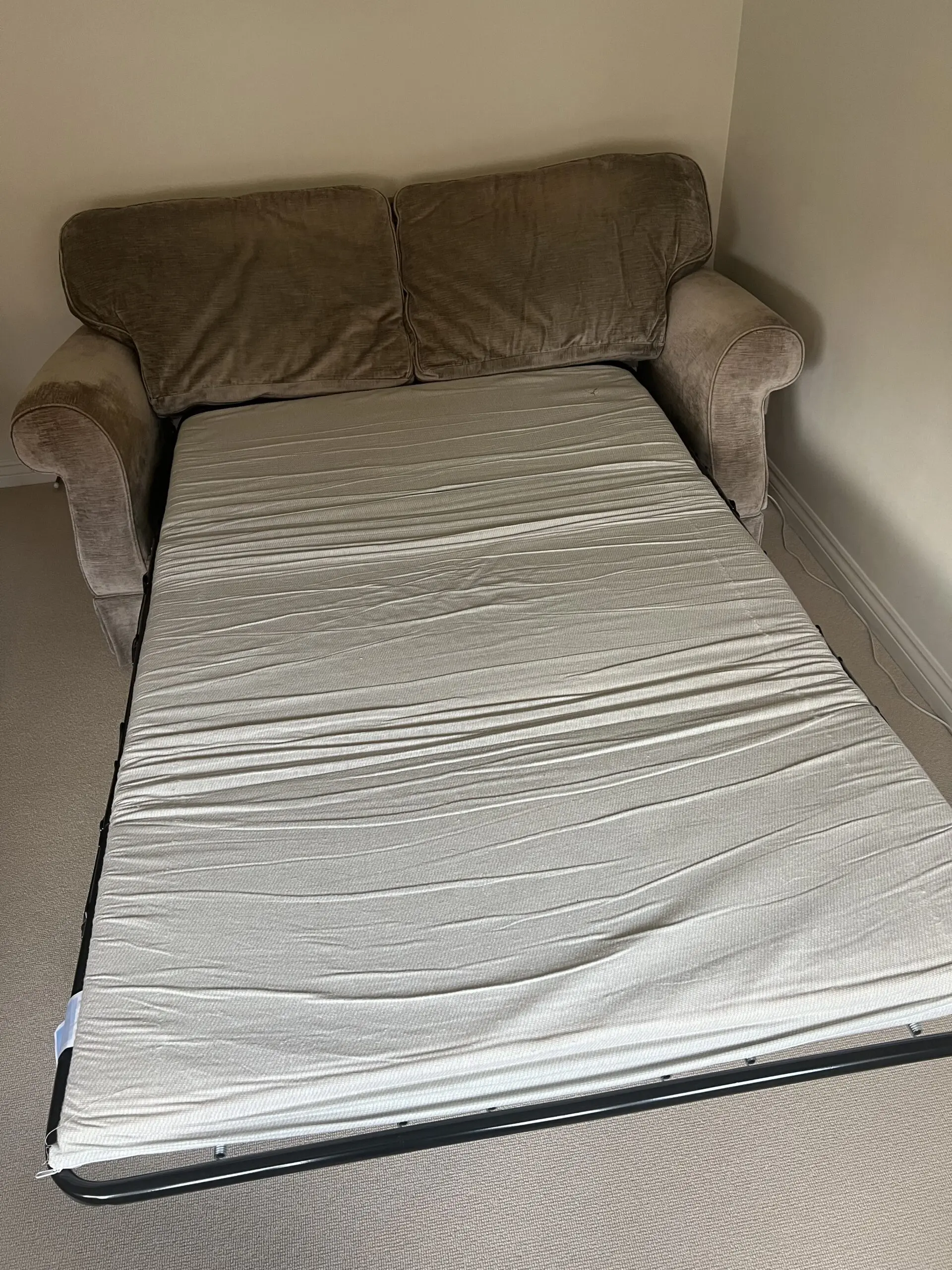 Comfortable 2 seater sofa bed that unfolds into a bed which is just less than a double bed. Good condition and mattress included with washable cover.