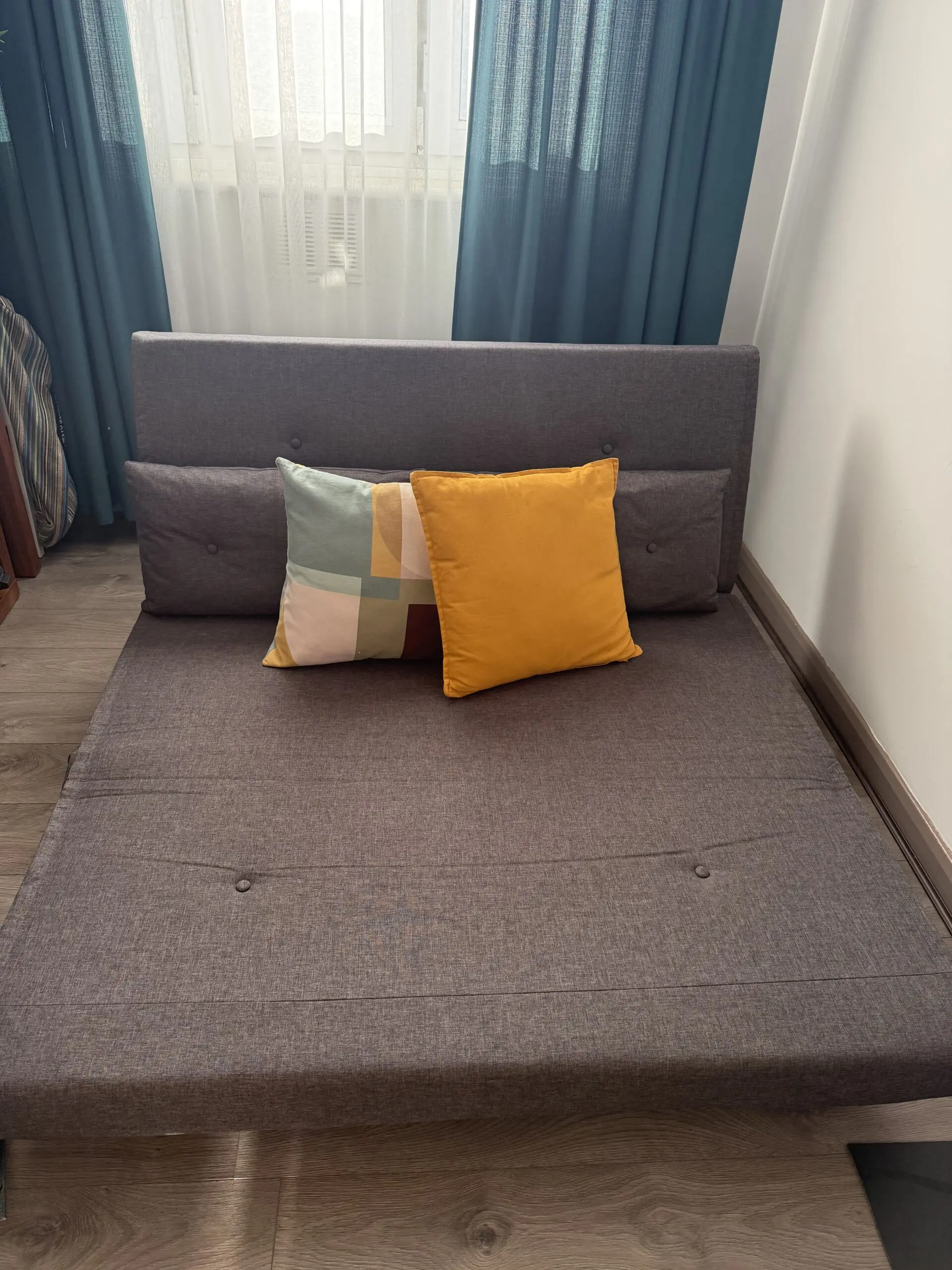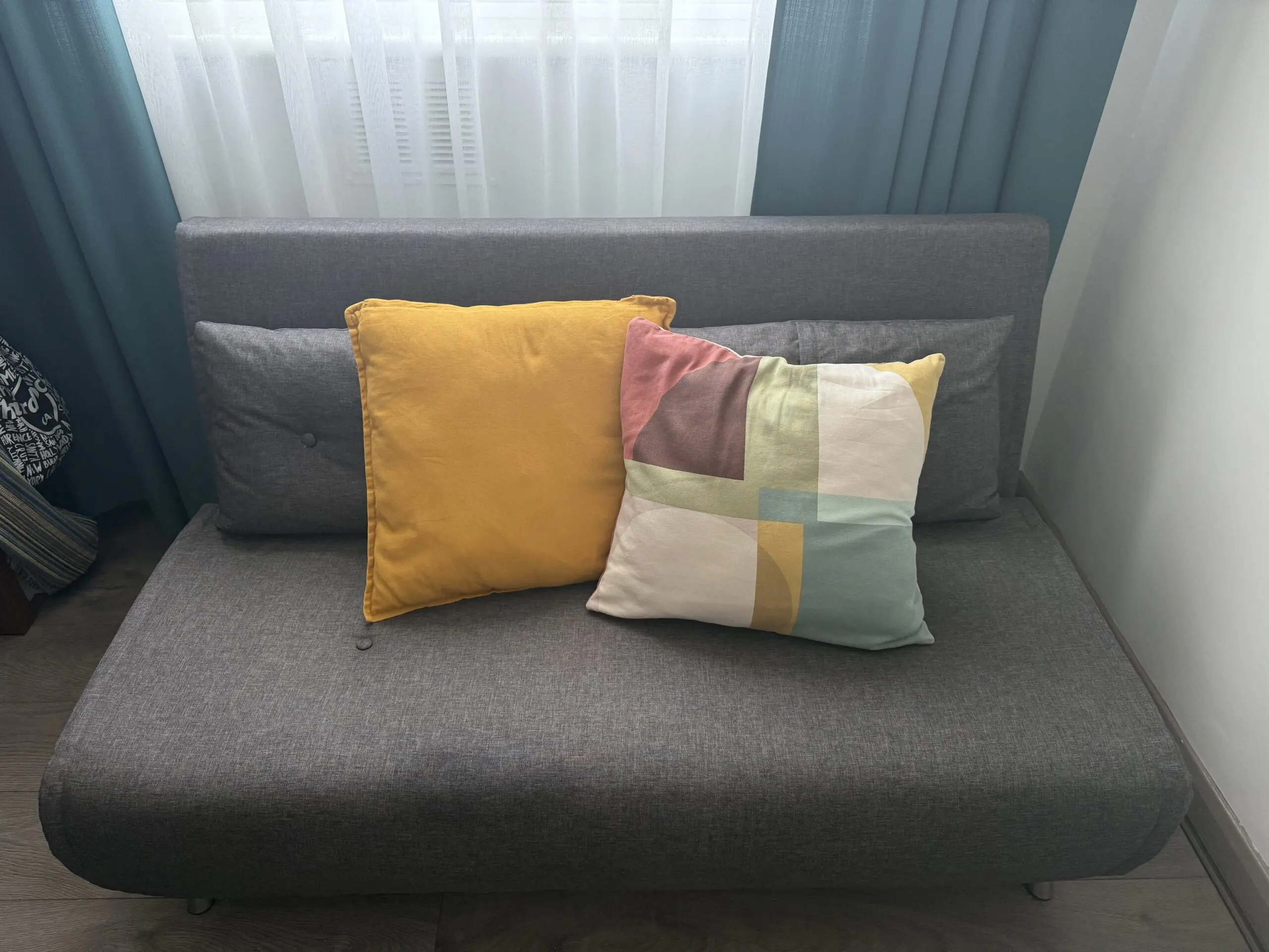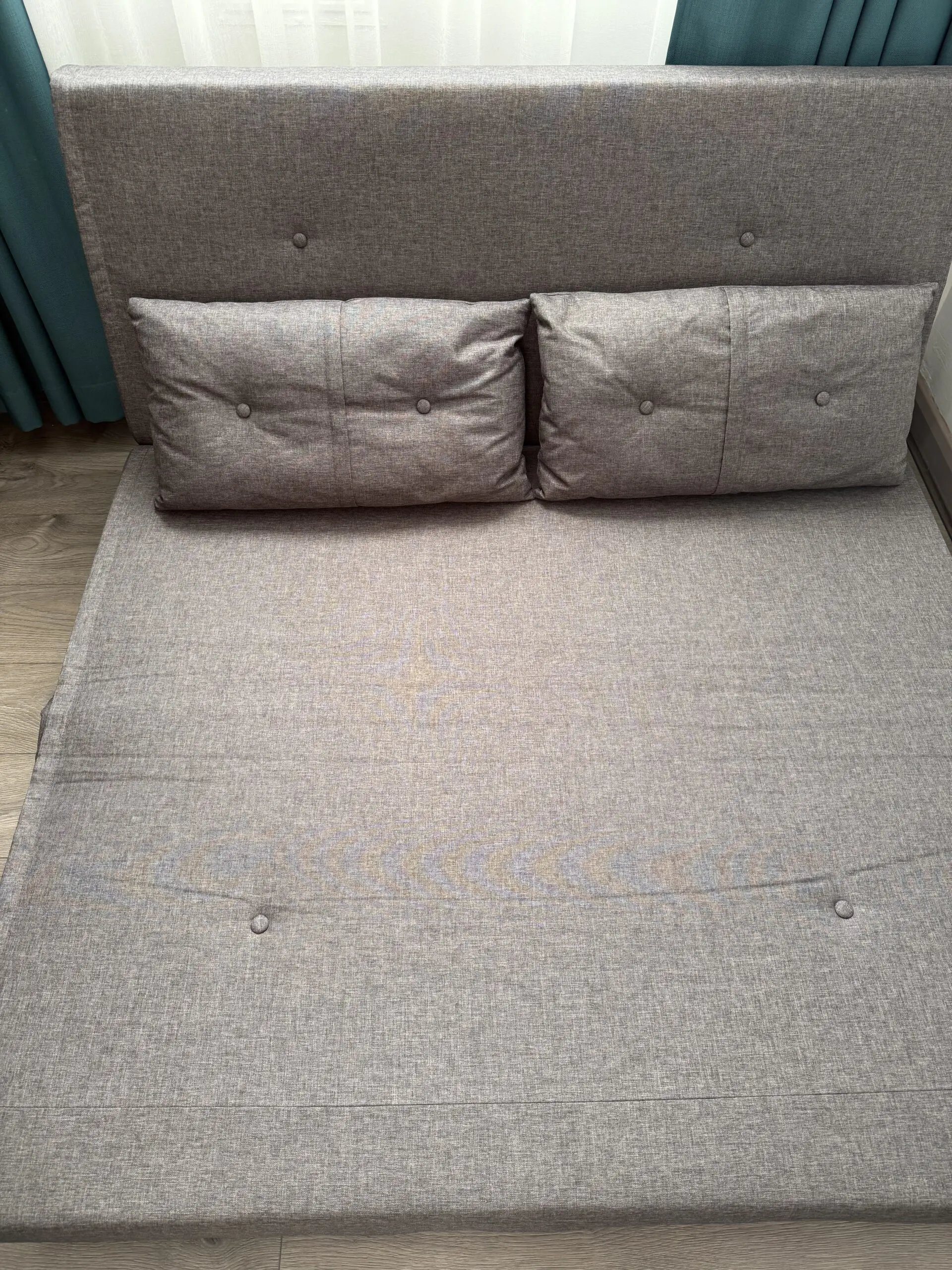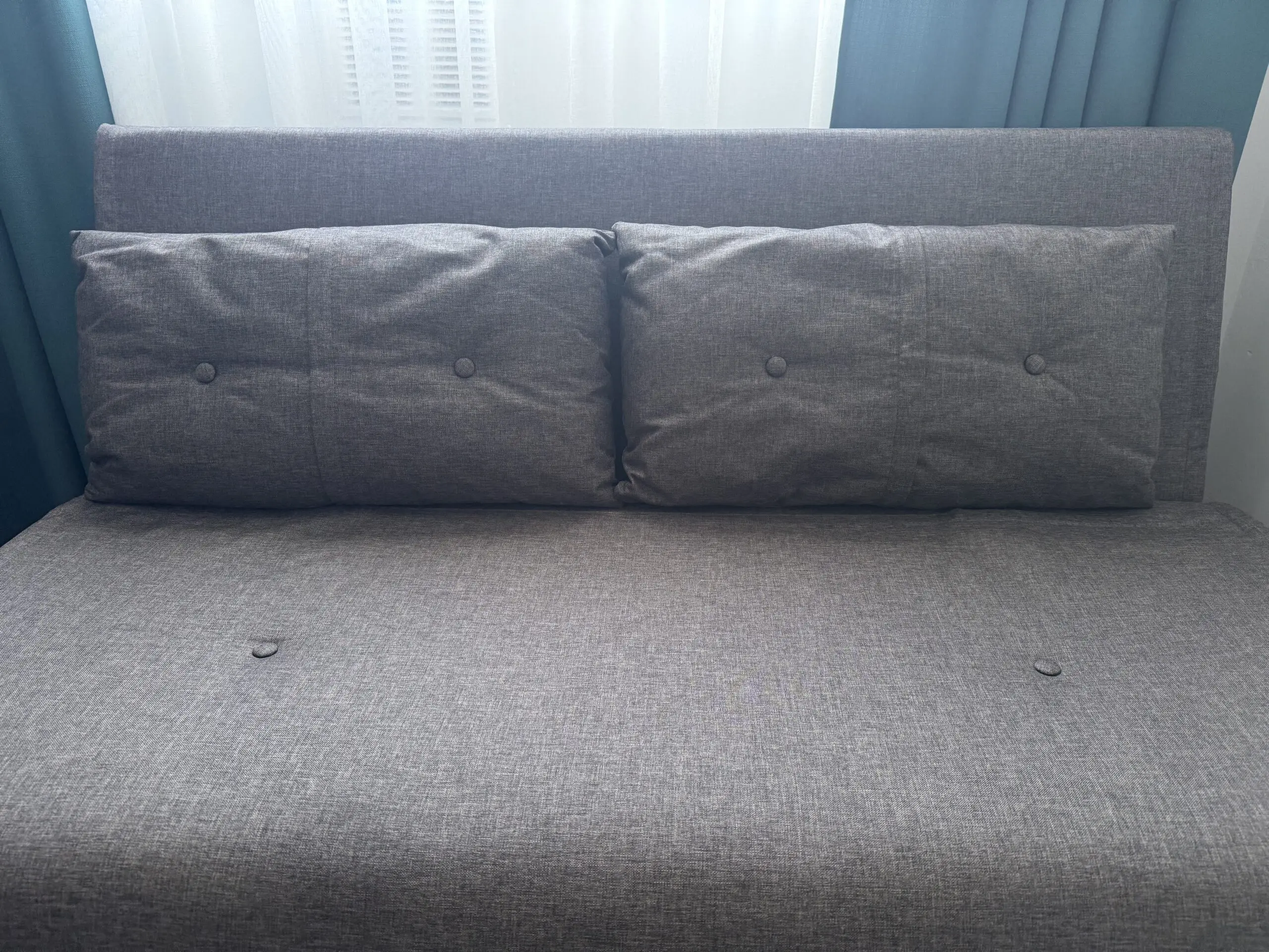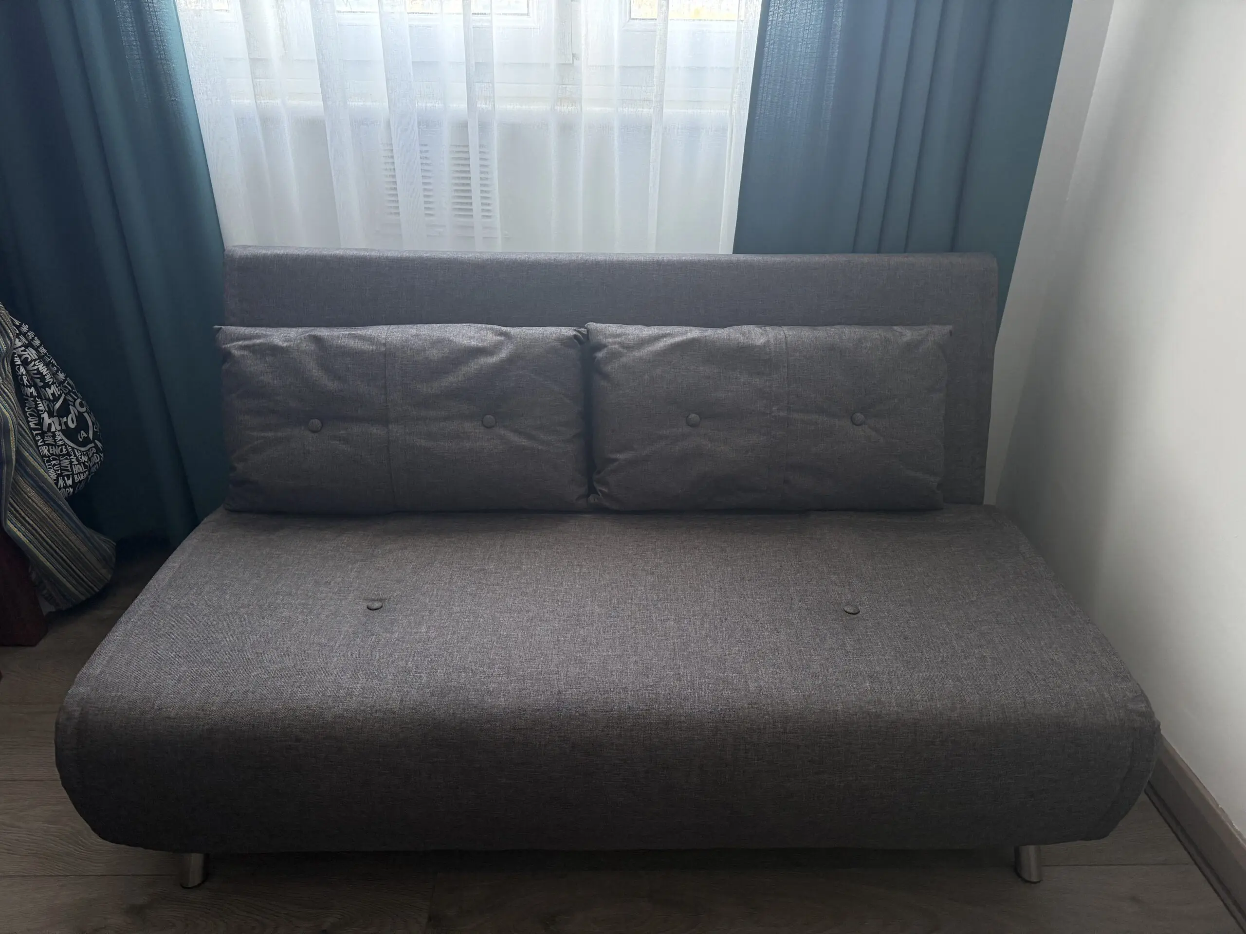 Haru sofa bed from made.com in dark grey, which opens out into a sofa bed. The sofa has a clic-clac mechanism and can be opened partially or fully. It comes with two matching dark grey cushions.