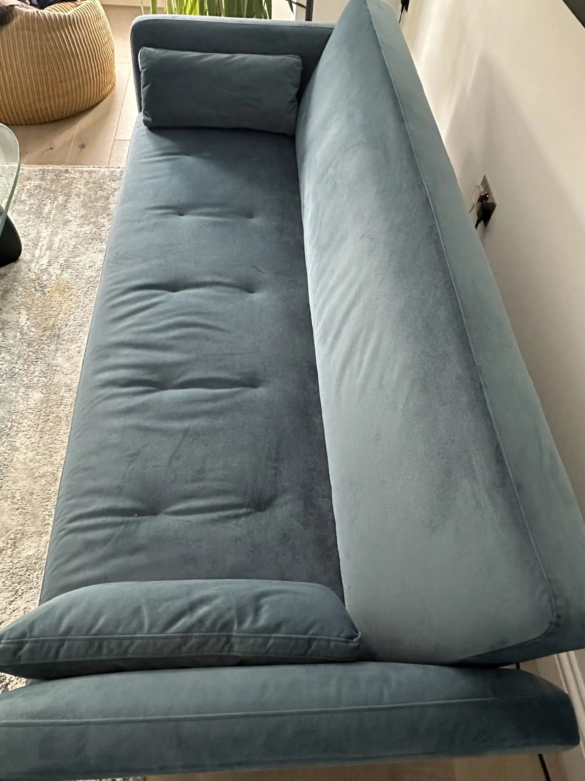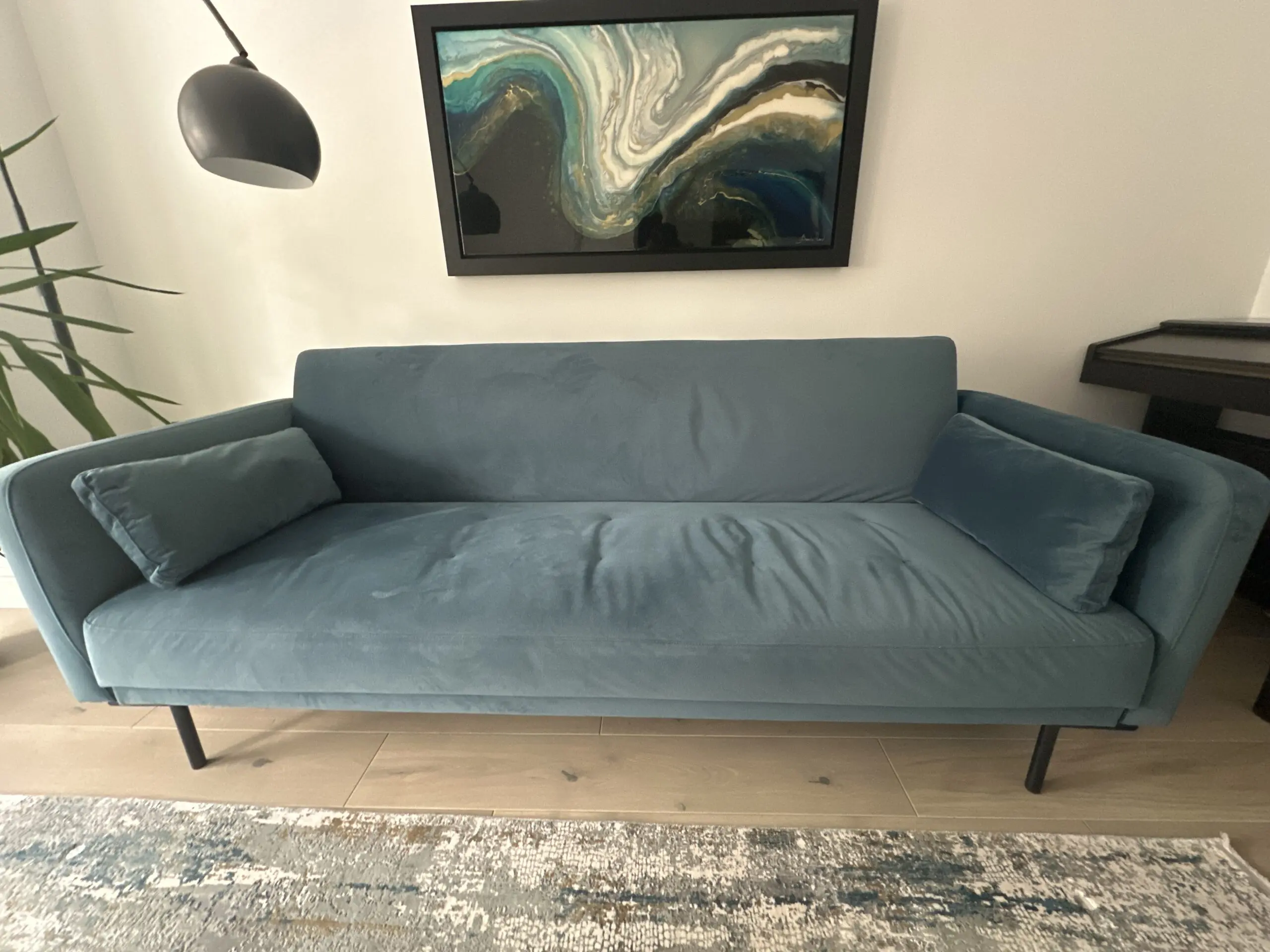 MADE Harlow 3 seat click clack steel blue velvet sofa bed.