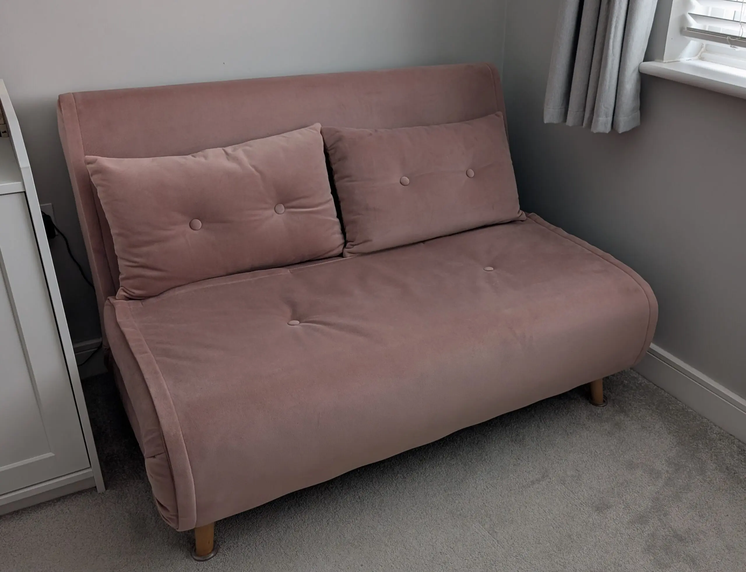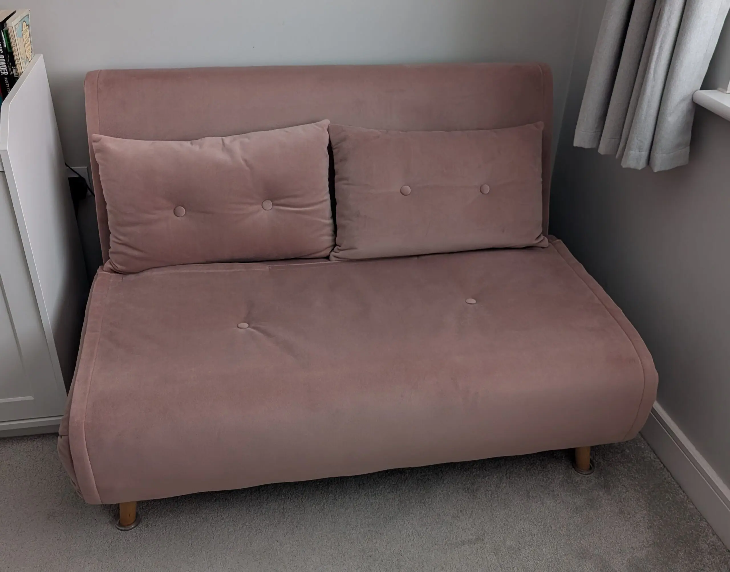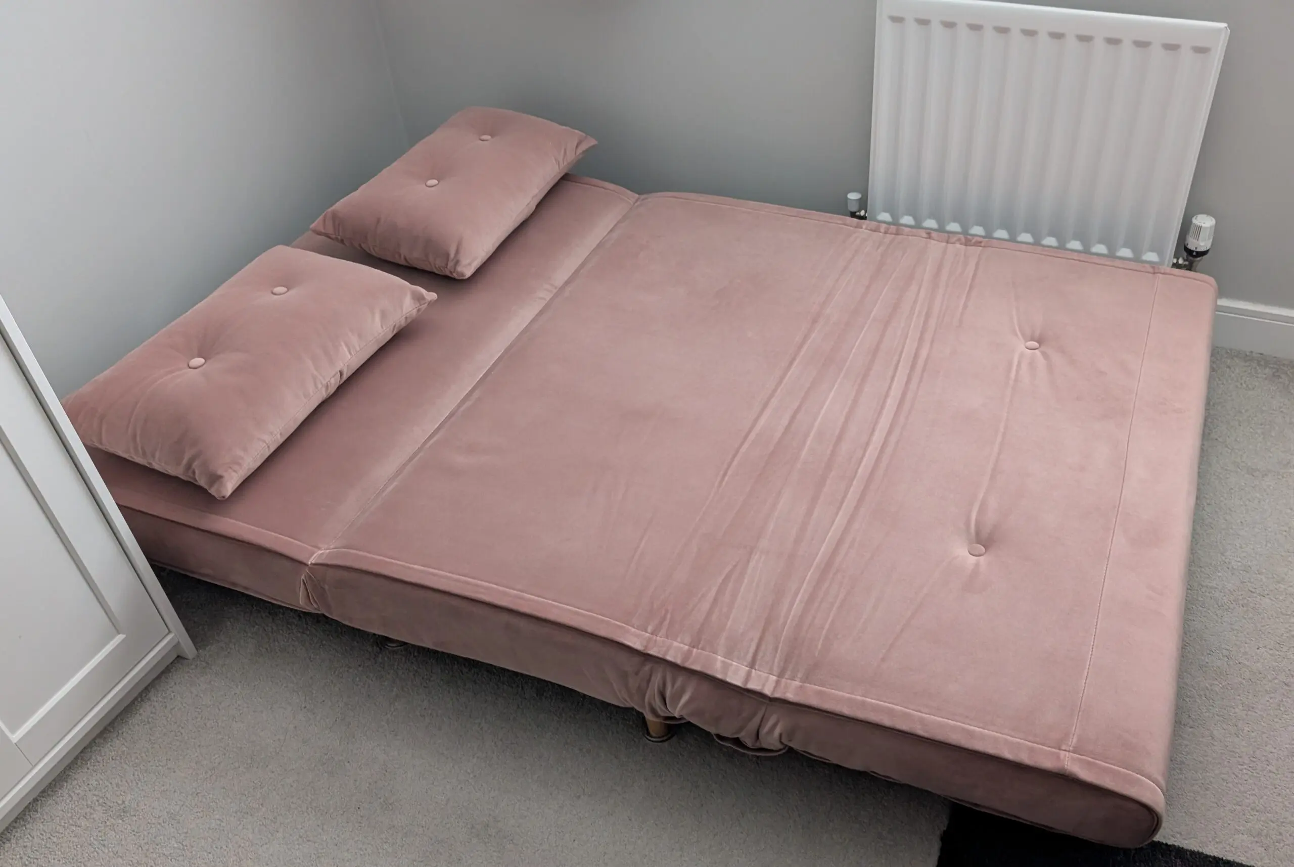 Regular Haru 2 seater sofa bed from Made.com in smooth velvet pink. Very rarely used and in excellent condition.