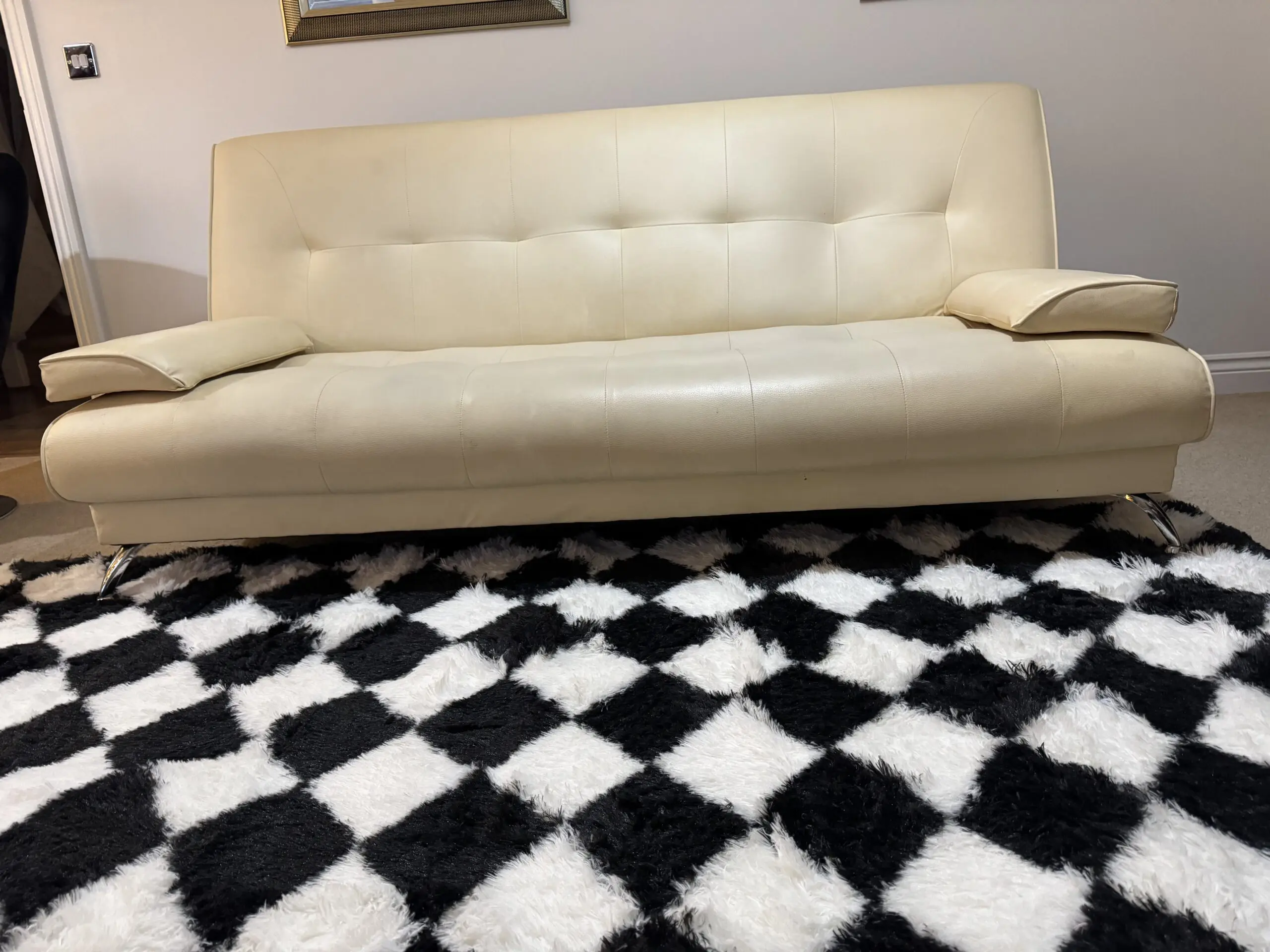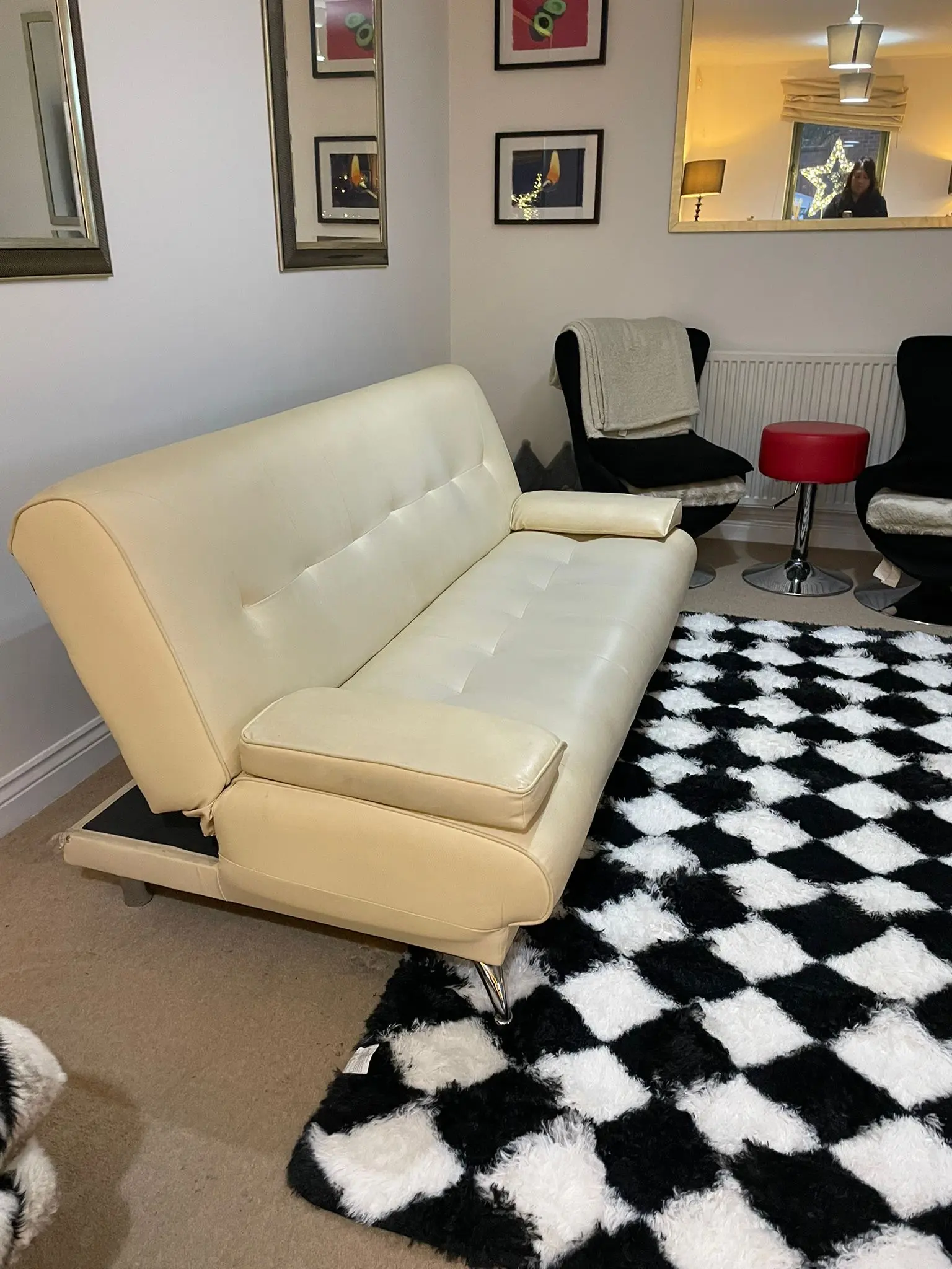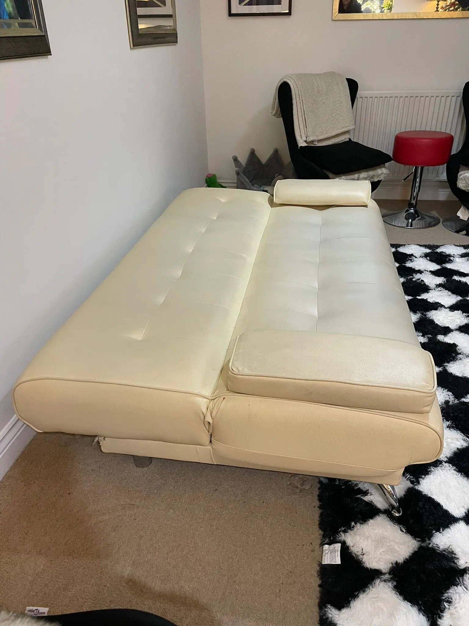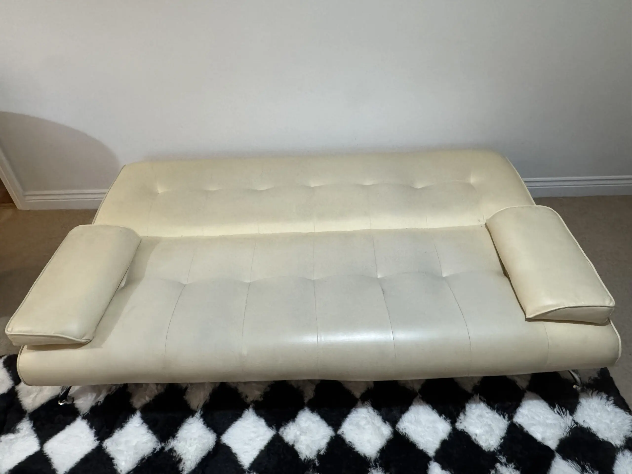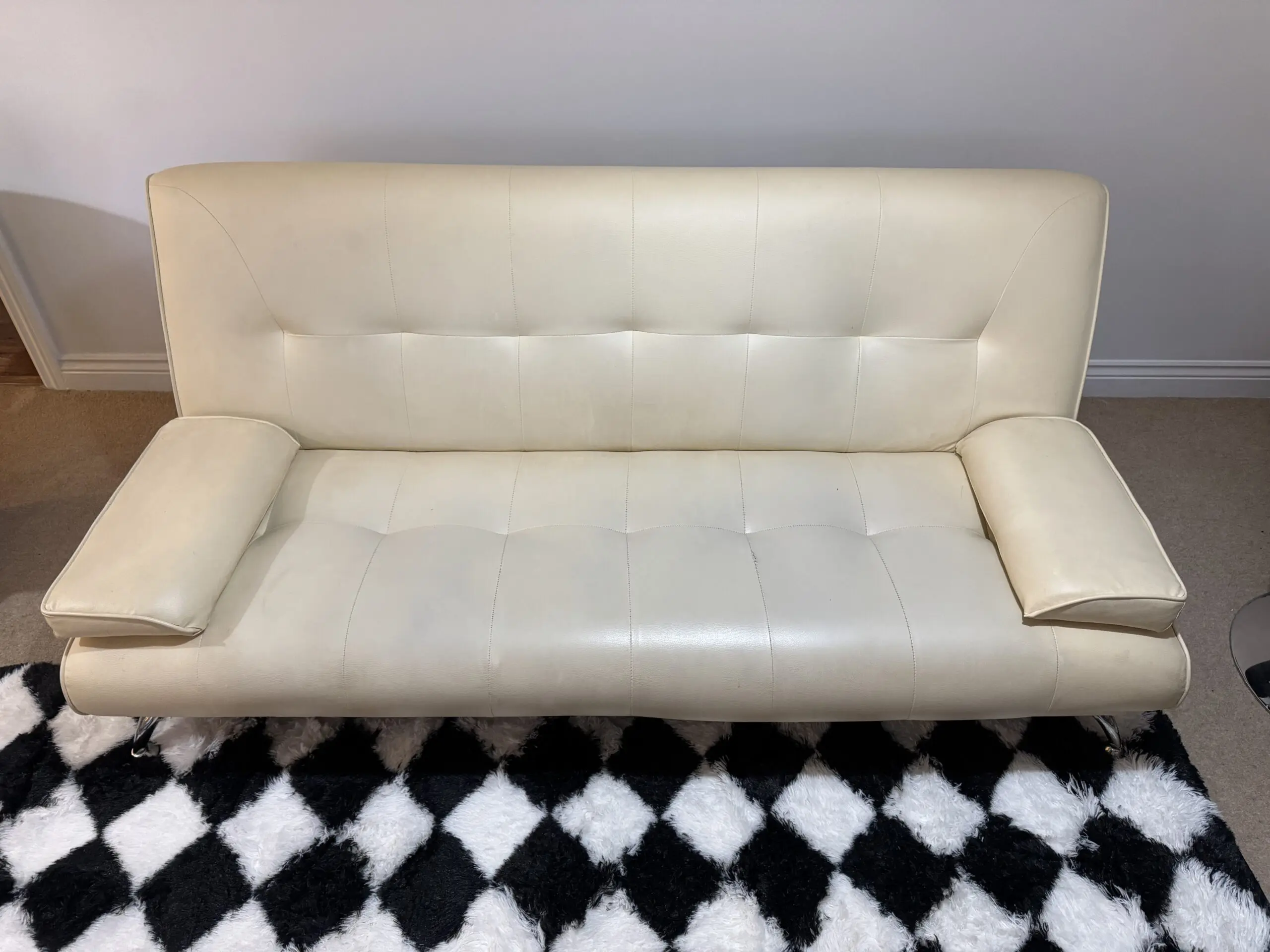 Modern, cream, faux leather sofa bed. Chrome legs. Removable arm rests.