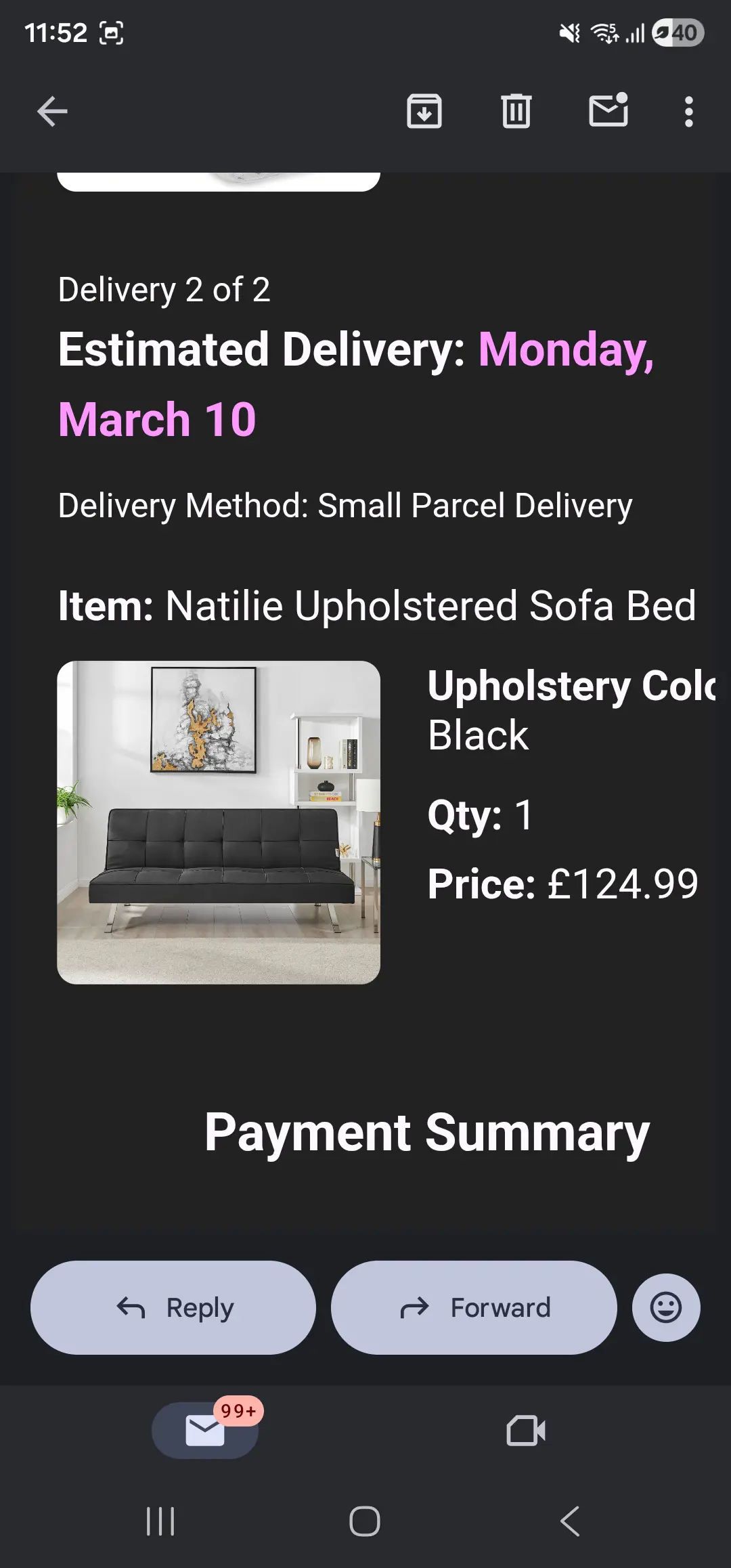 Excellent condition sofa bed. Double bed, only used once. Purchased brand new in March 2025 for £124.99. Only selling as I am moving house