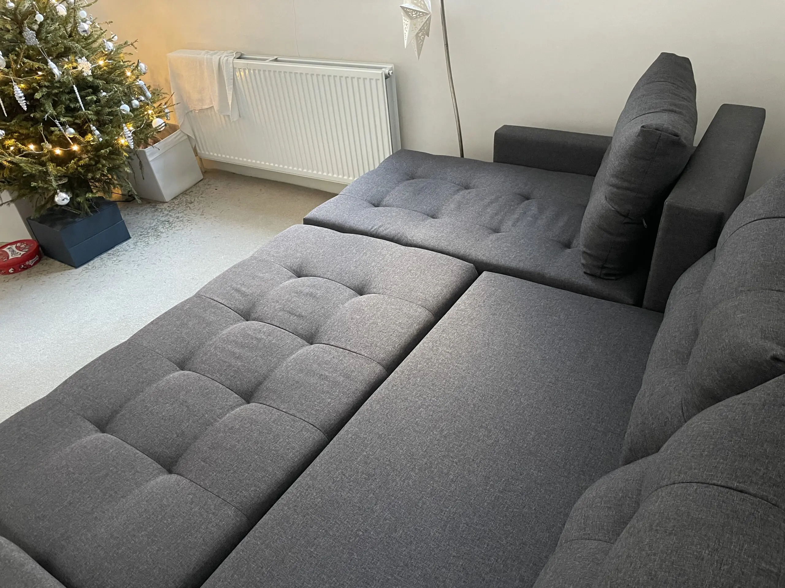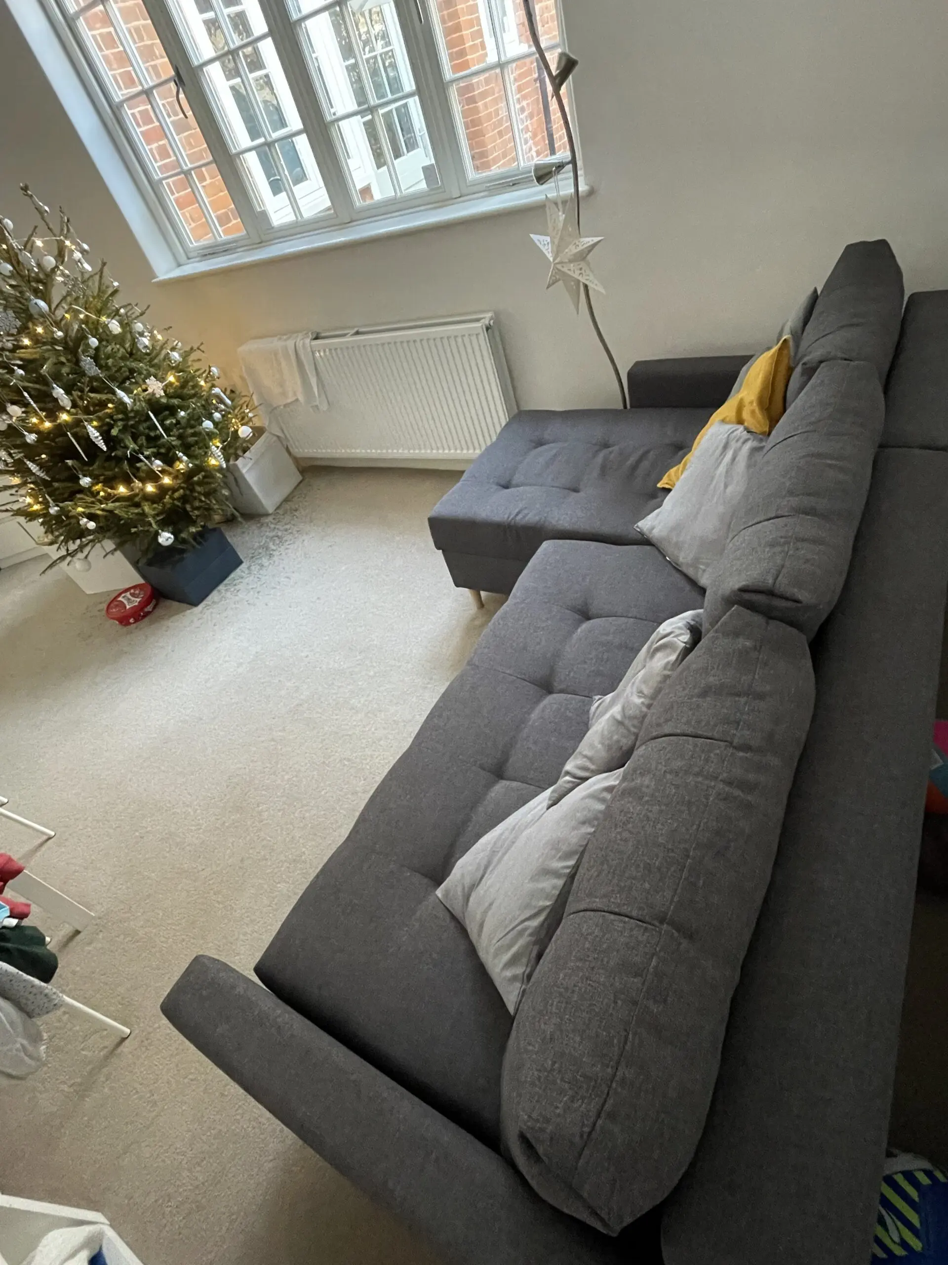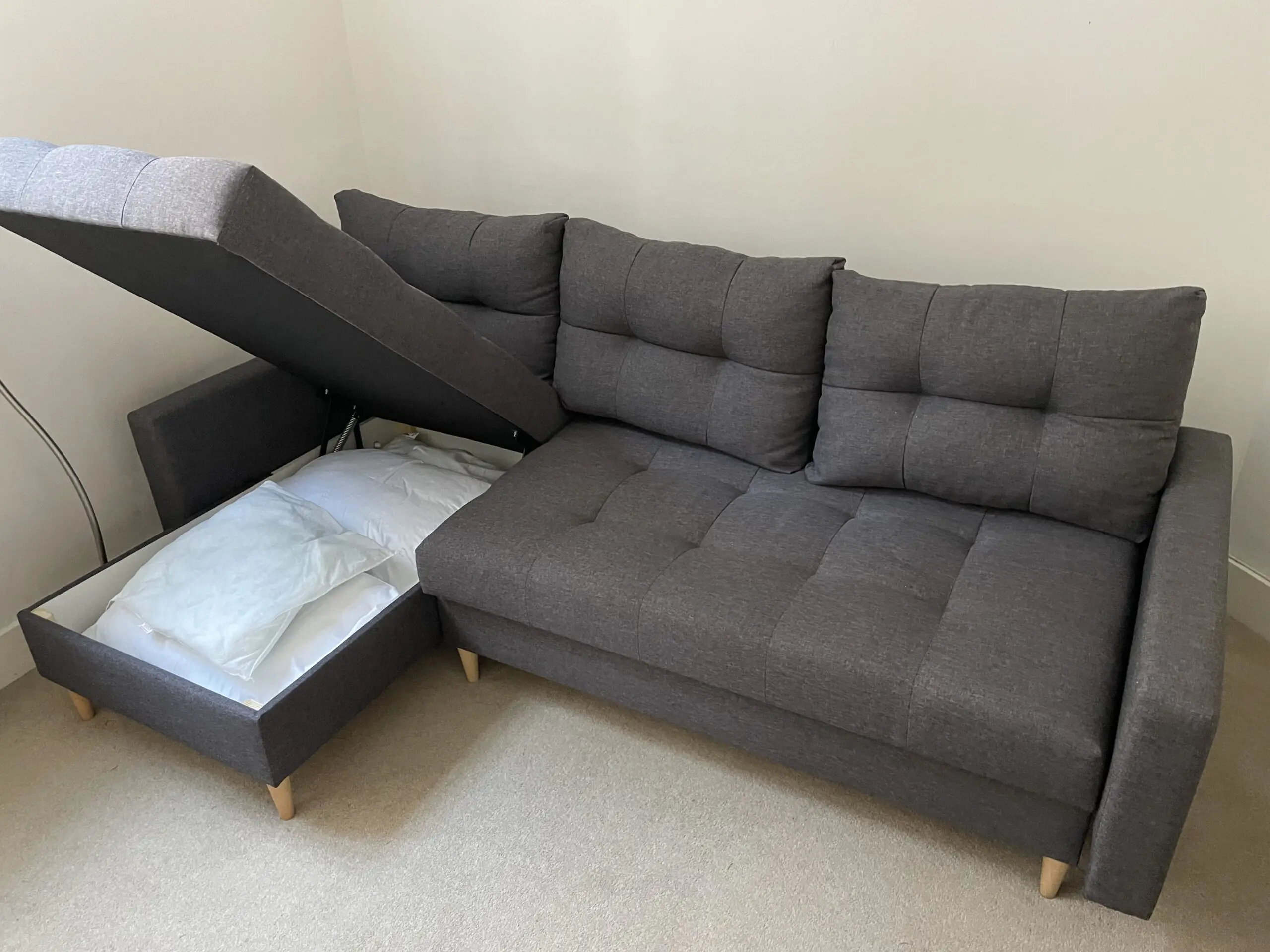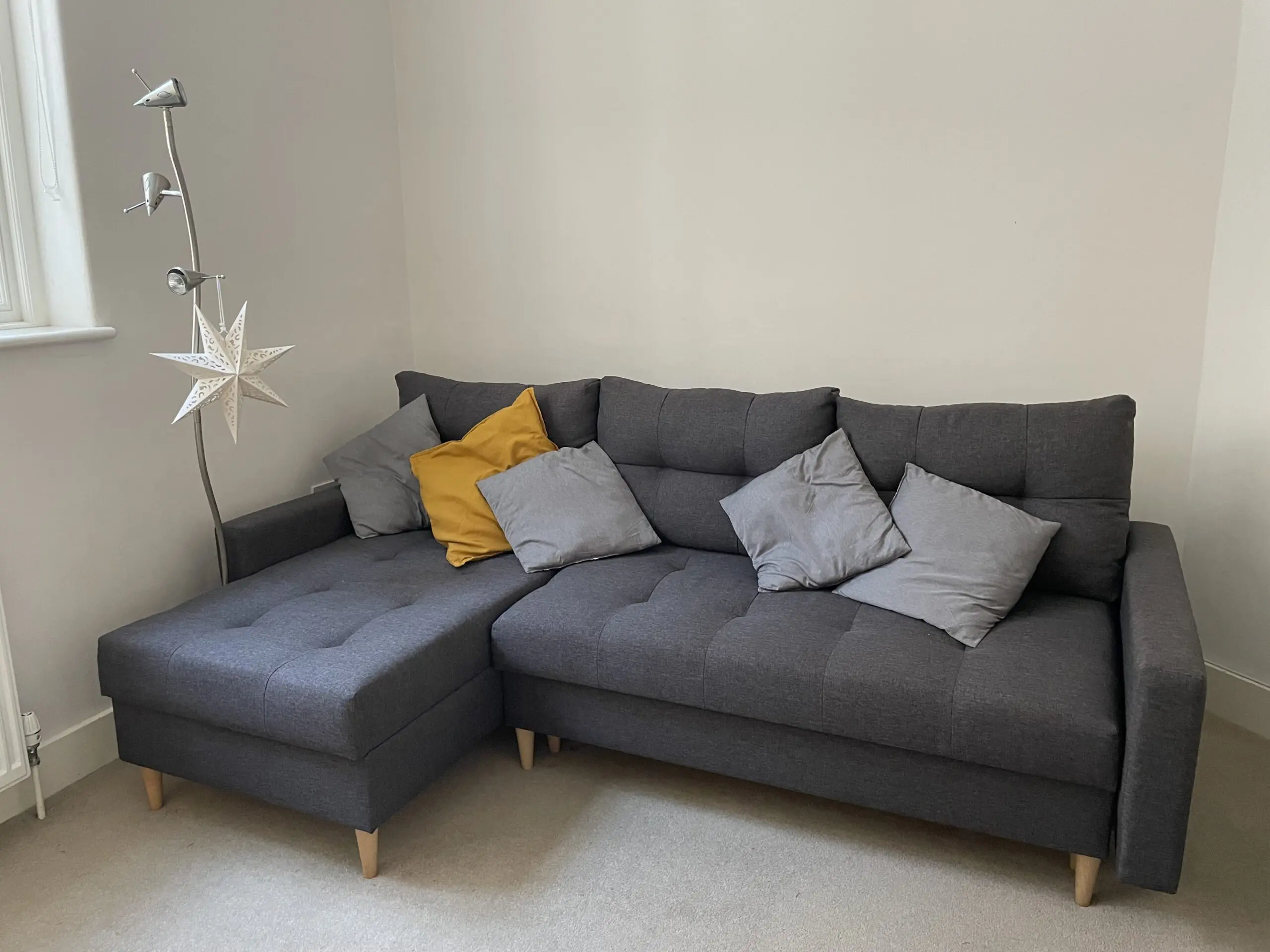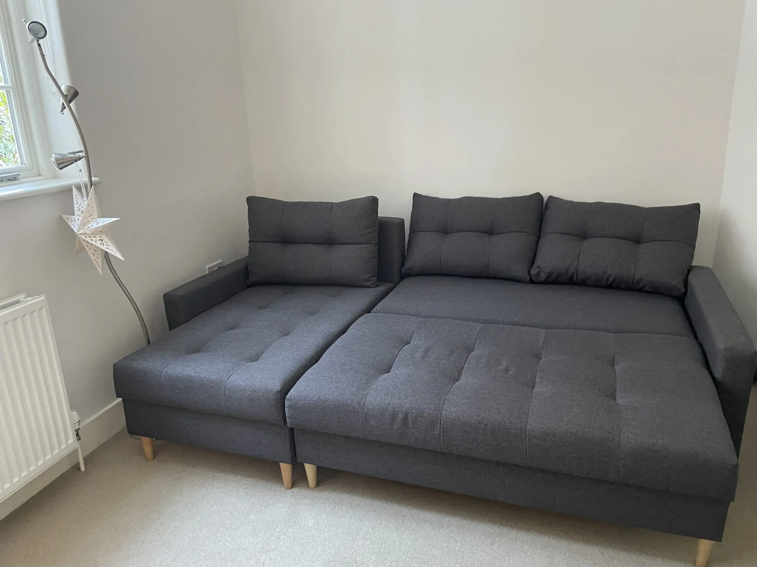 New sofa bed (except for one small burnt from a lamp/ on the side u can’t see), very comfy and easily transforms into 2 seat bed. Please collect no later than by 27 January 2026, moving abroad.