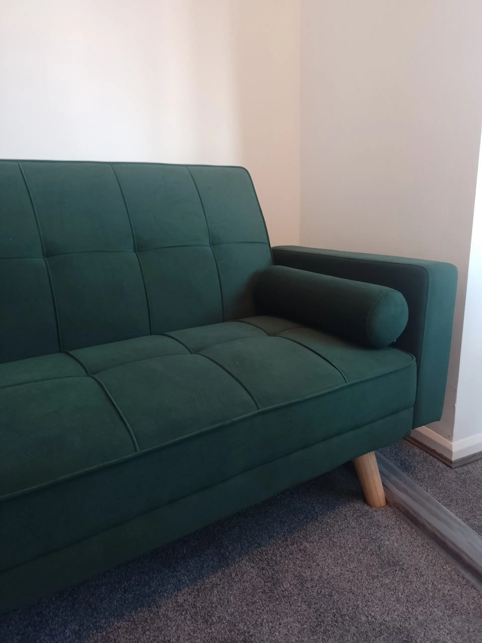 Unused click clack sofa bed with 2 small bolster cushions. Soft to the touch fabric firm seats. Cost £190.