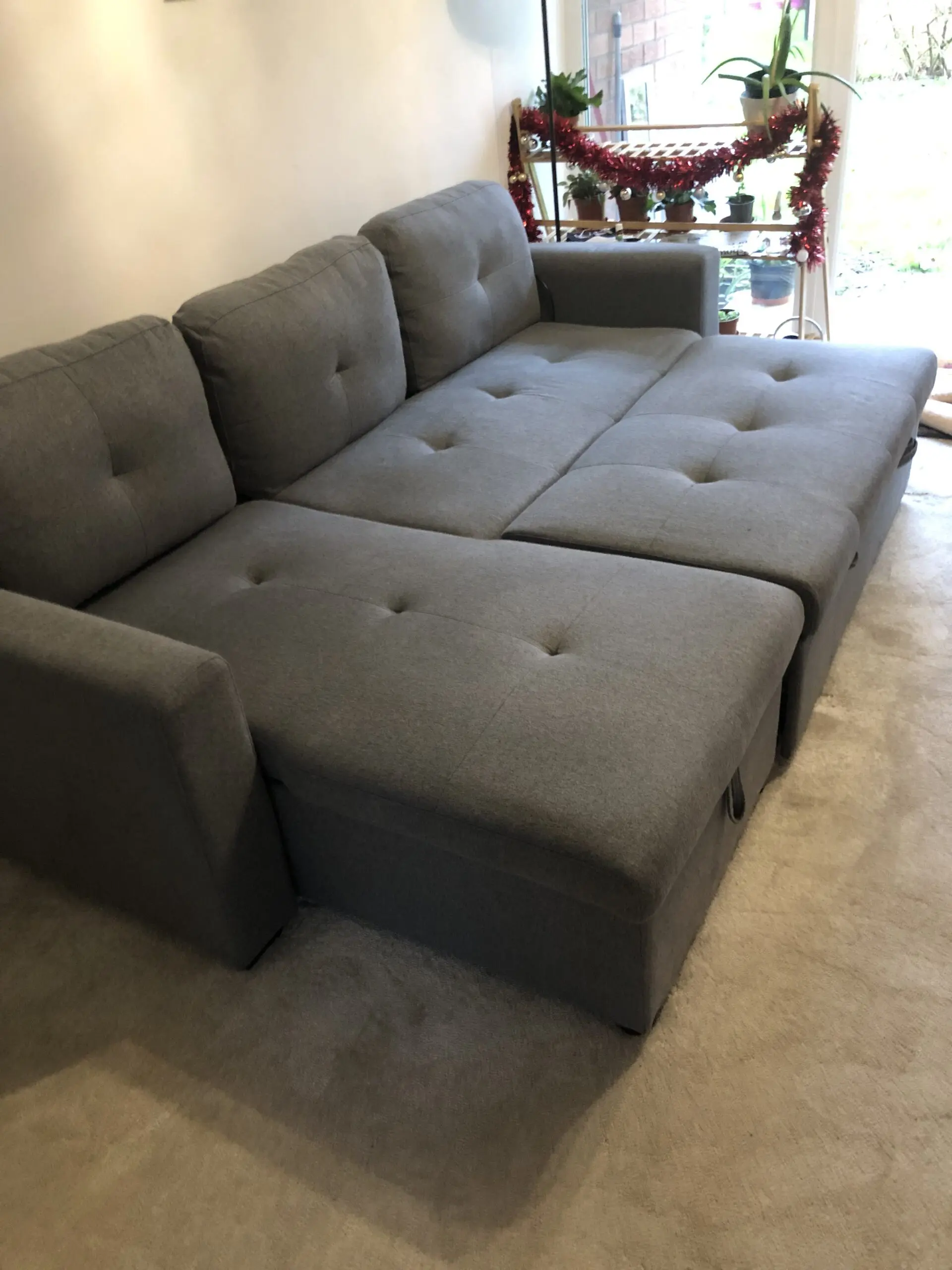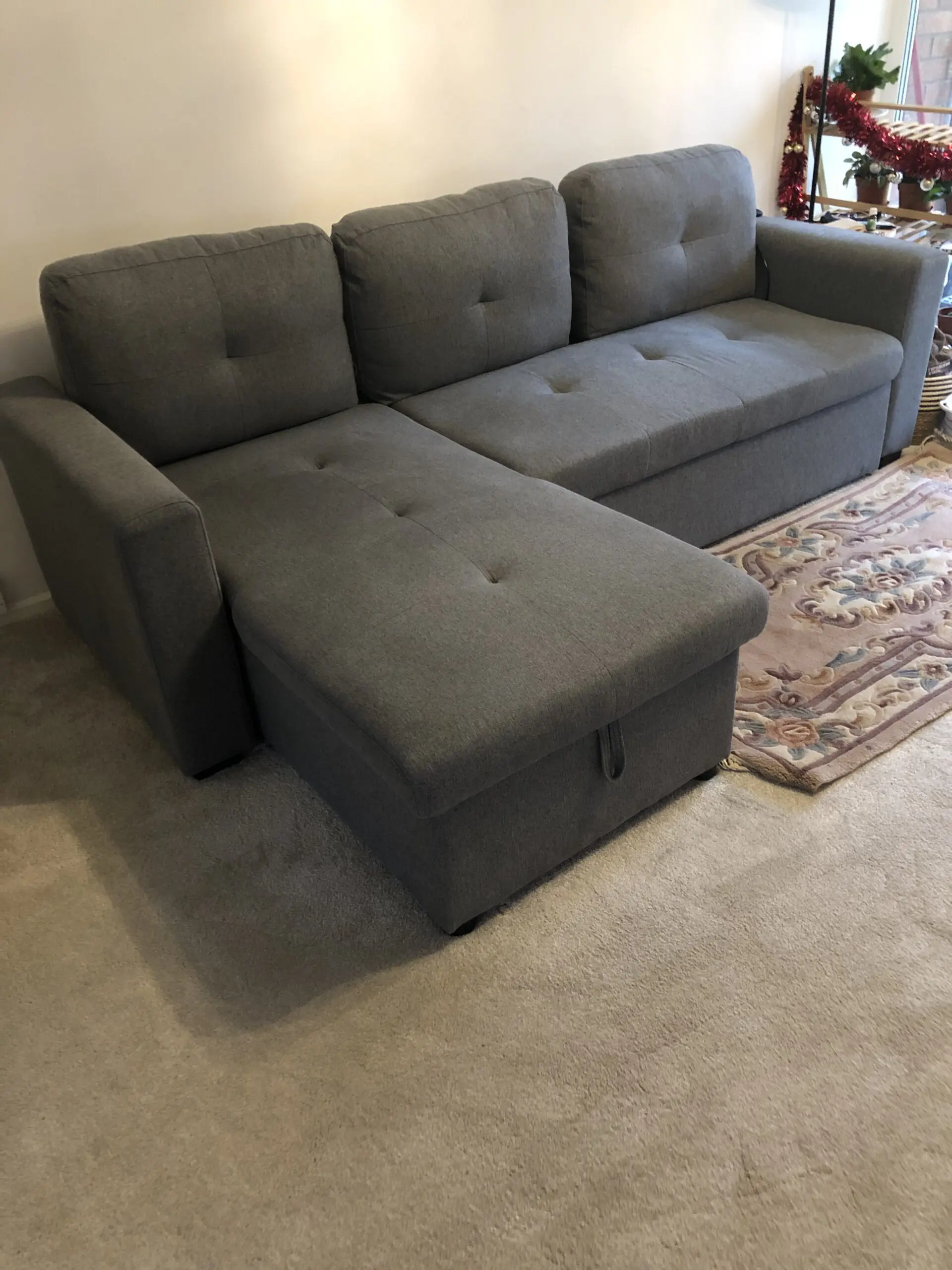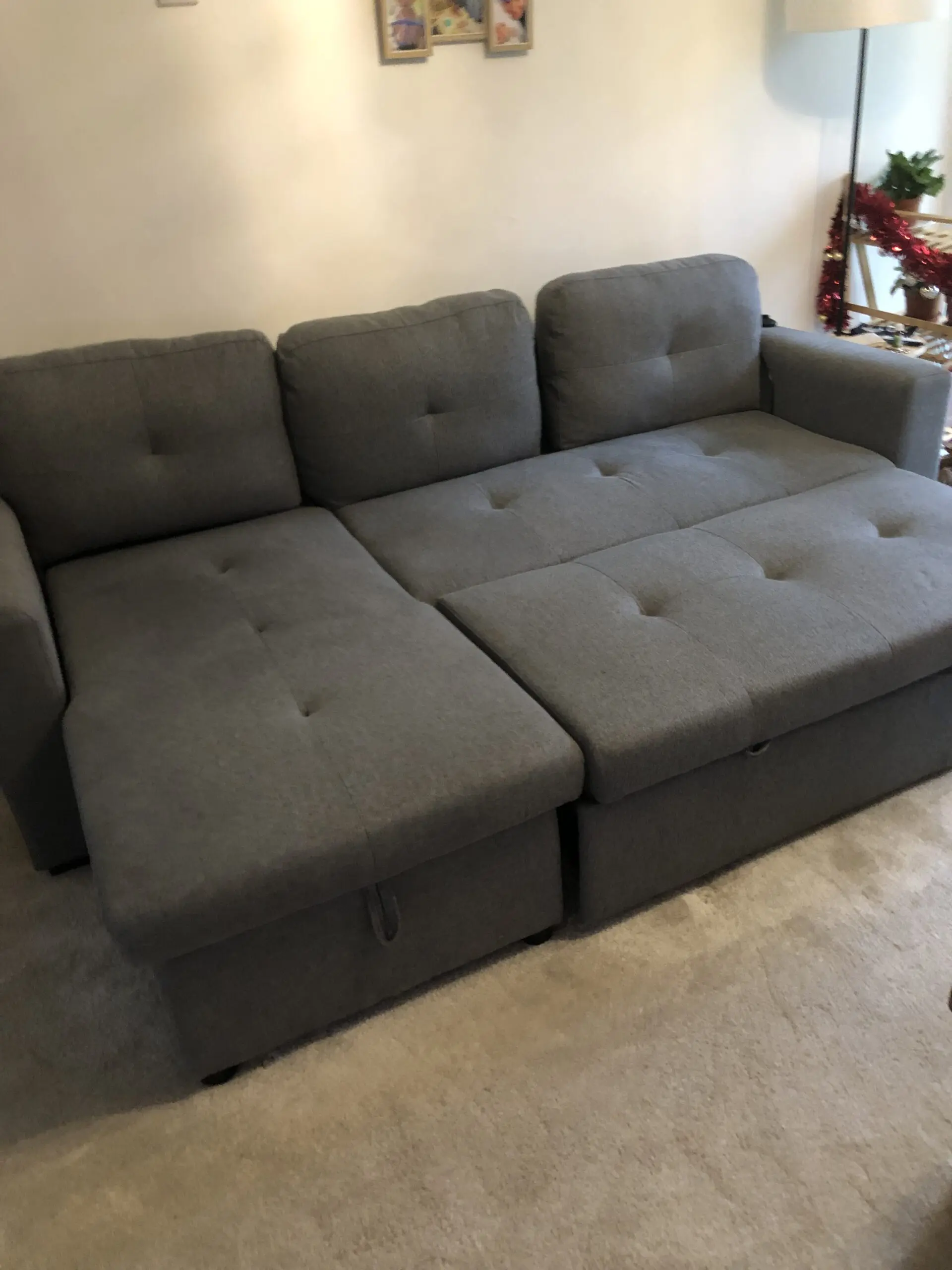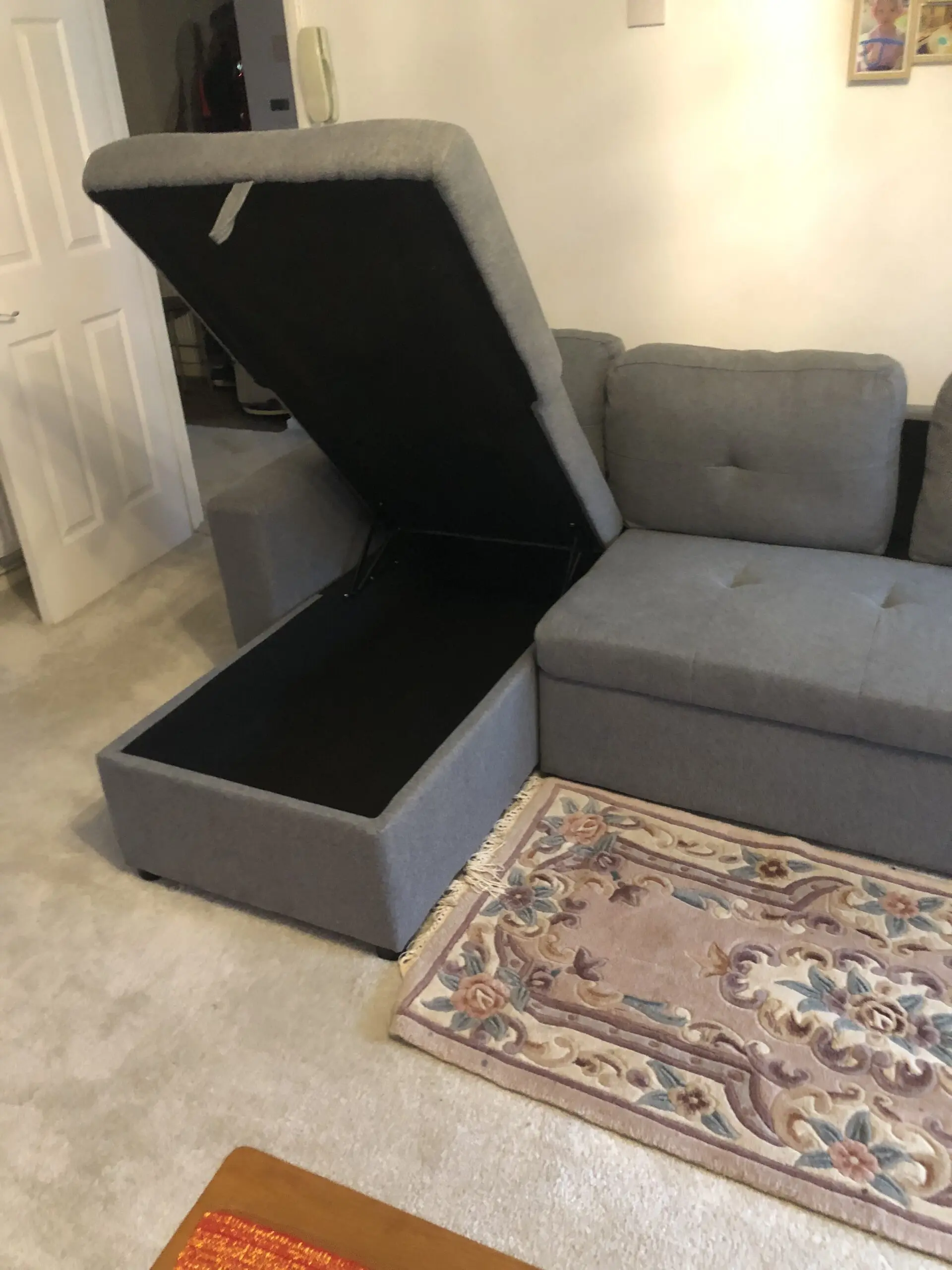 This is convenient 3 seater sofa bed, has a generous storage for blankets, pillows etc. , easy can be transformed In spacious bed. Cover material is linen. Storage can be installed on the left or right.