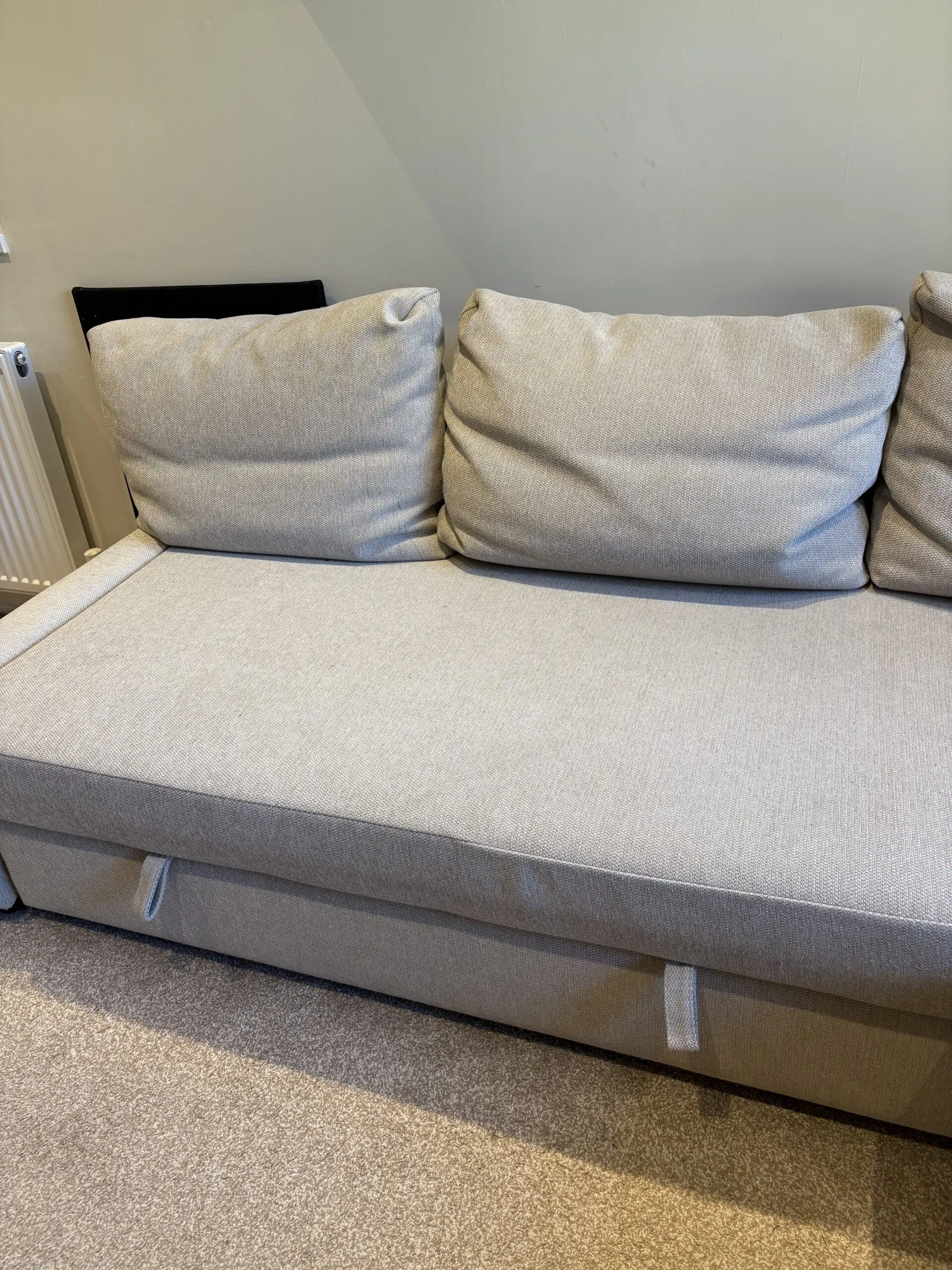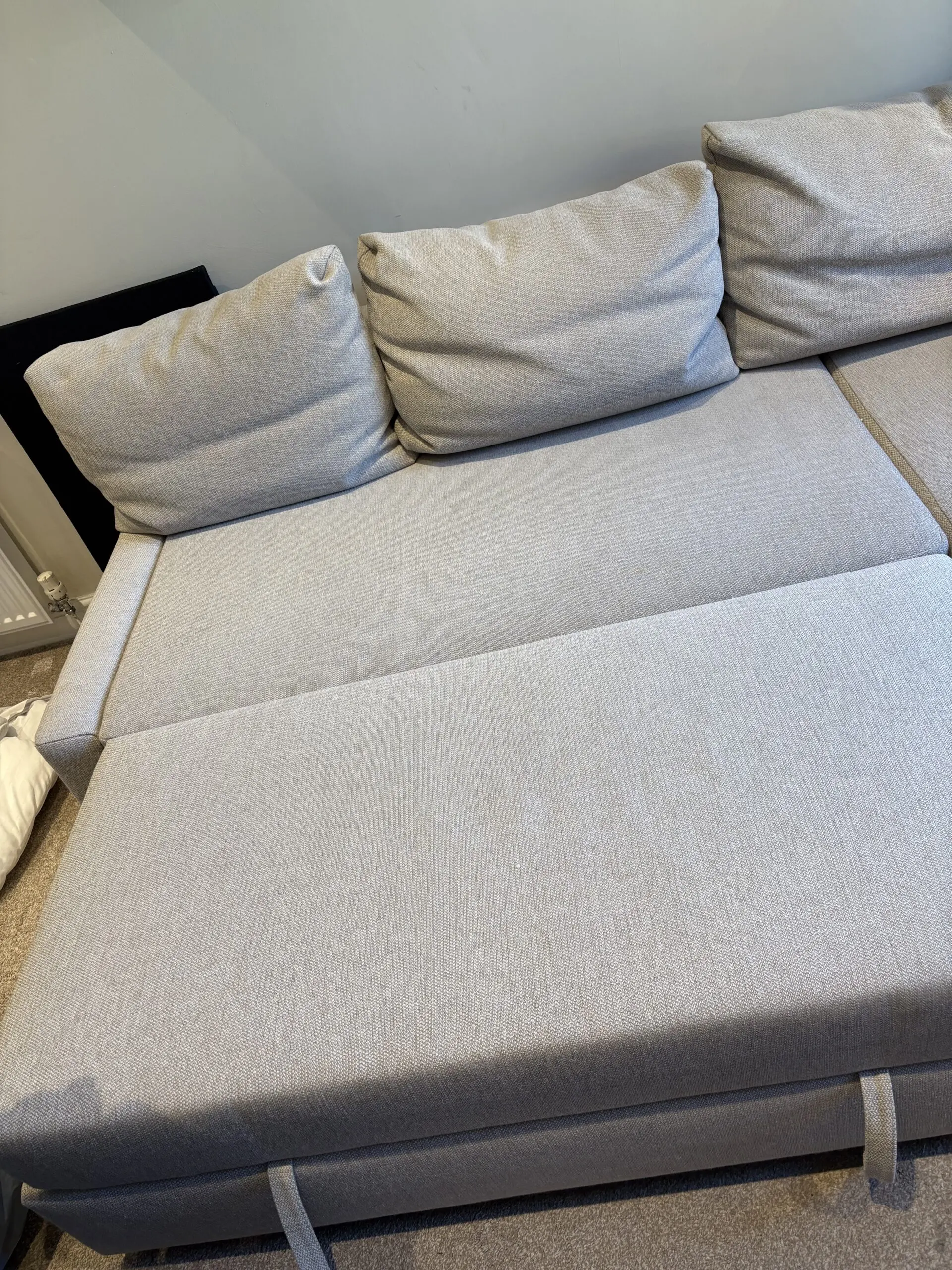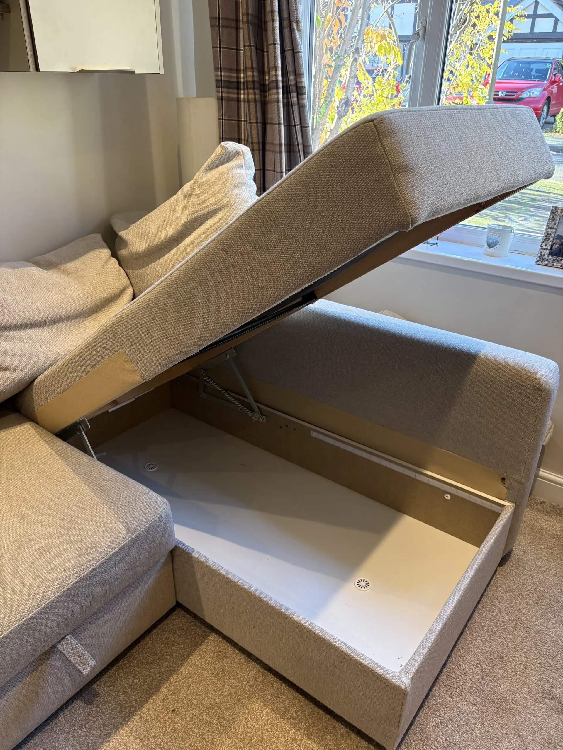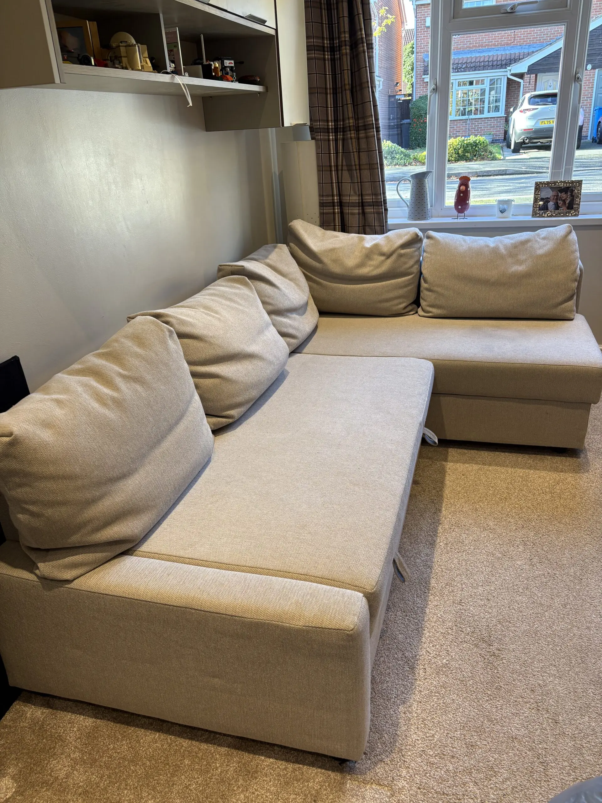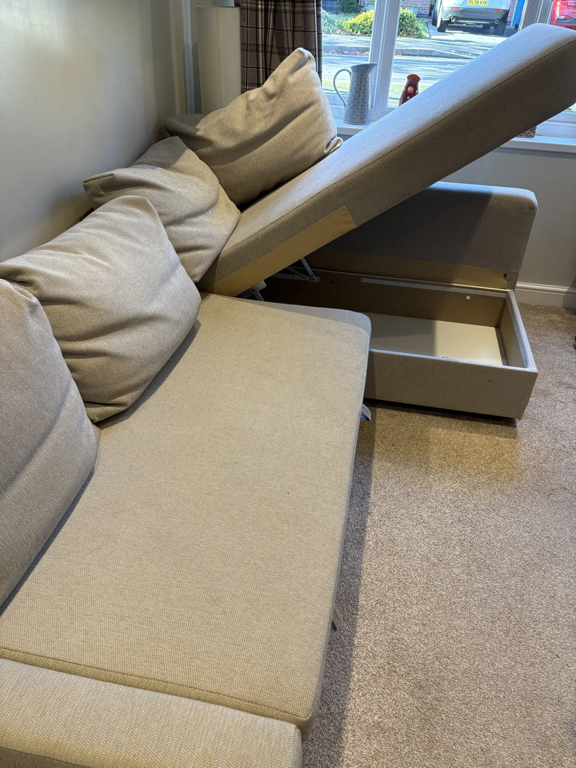 Hardly used corner sofa which can easily seat 4. Pulls out to make a large, comfortable sofa bed. Has a large compartment for storage. From a smoke and pet free home.