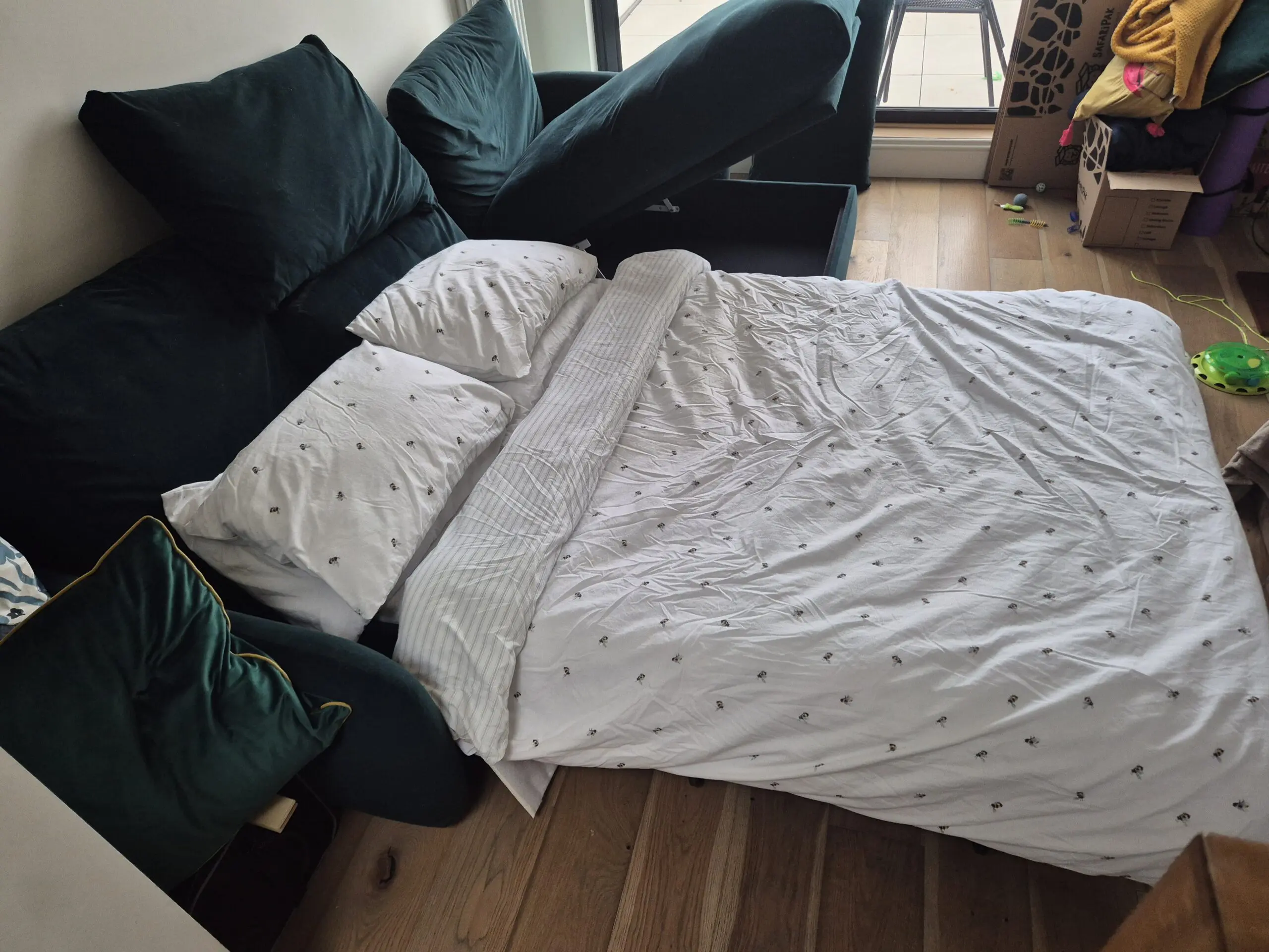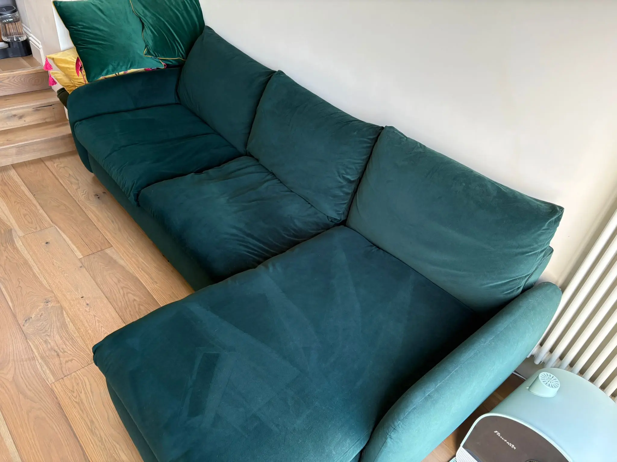 L shaped 3 seater sofa bed, green velvet. Depth measurement is for the L. Double bed pulls out and storage under the L. Very good condition. Purchased originally for around 3k in early 2023. Only reason we are selling is its slightly too big for the living room in our new place.