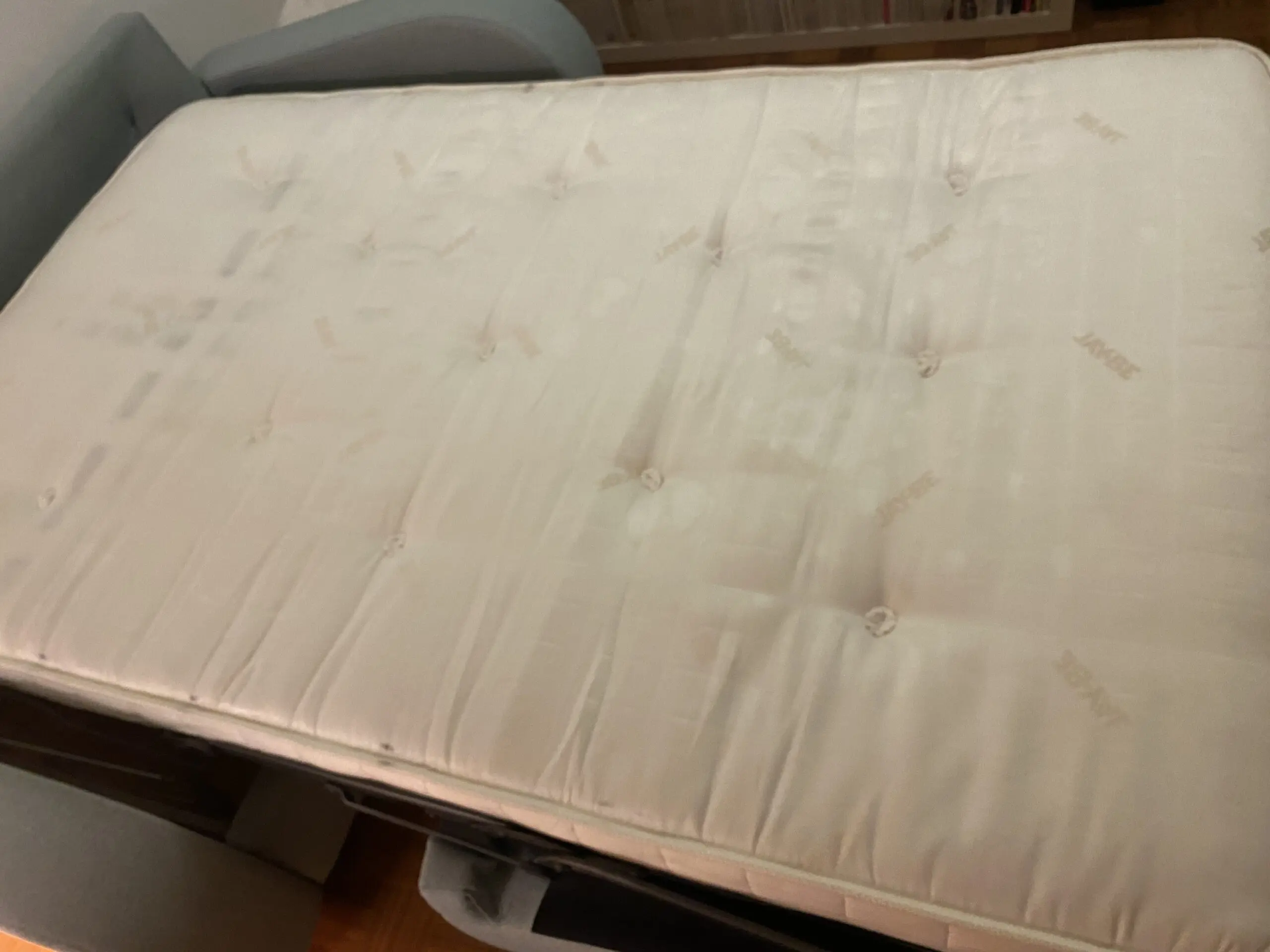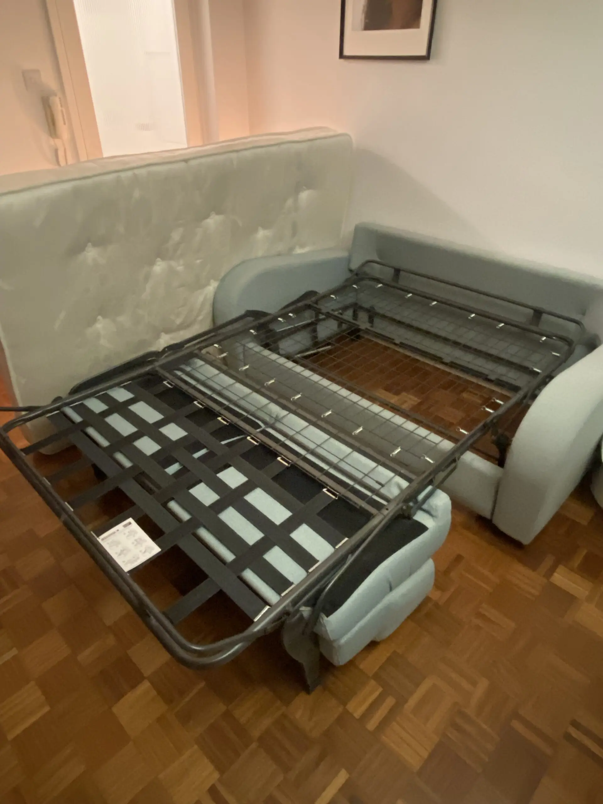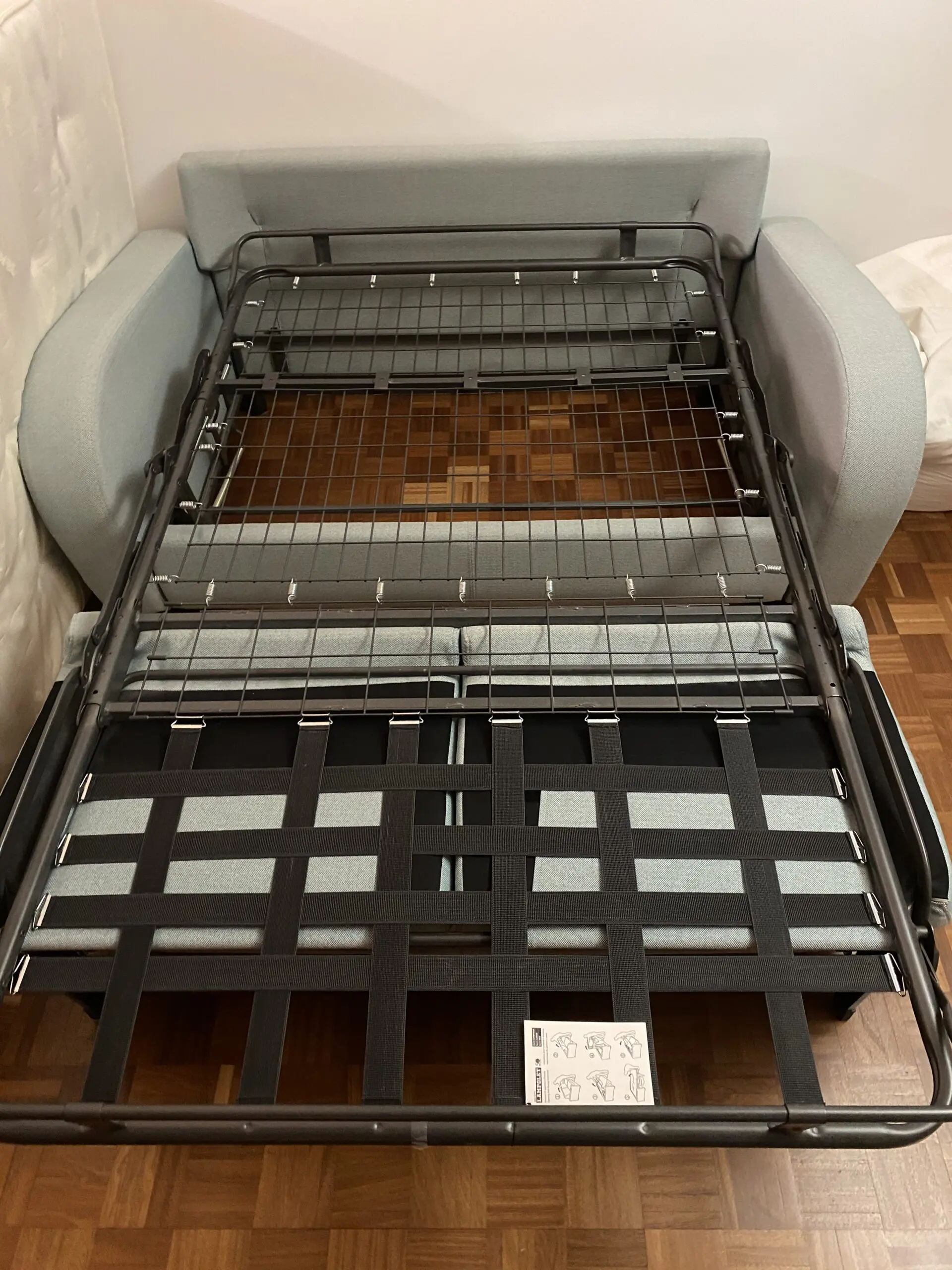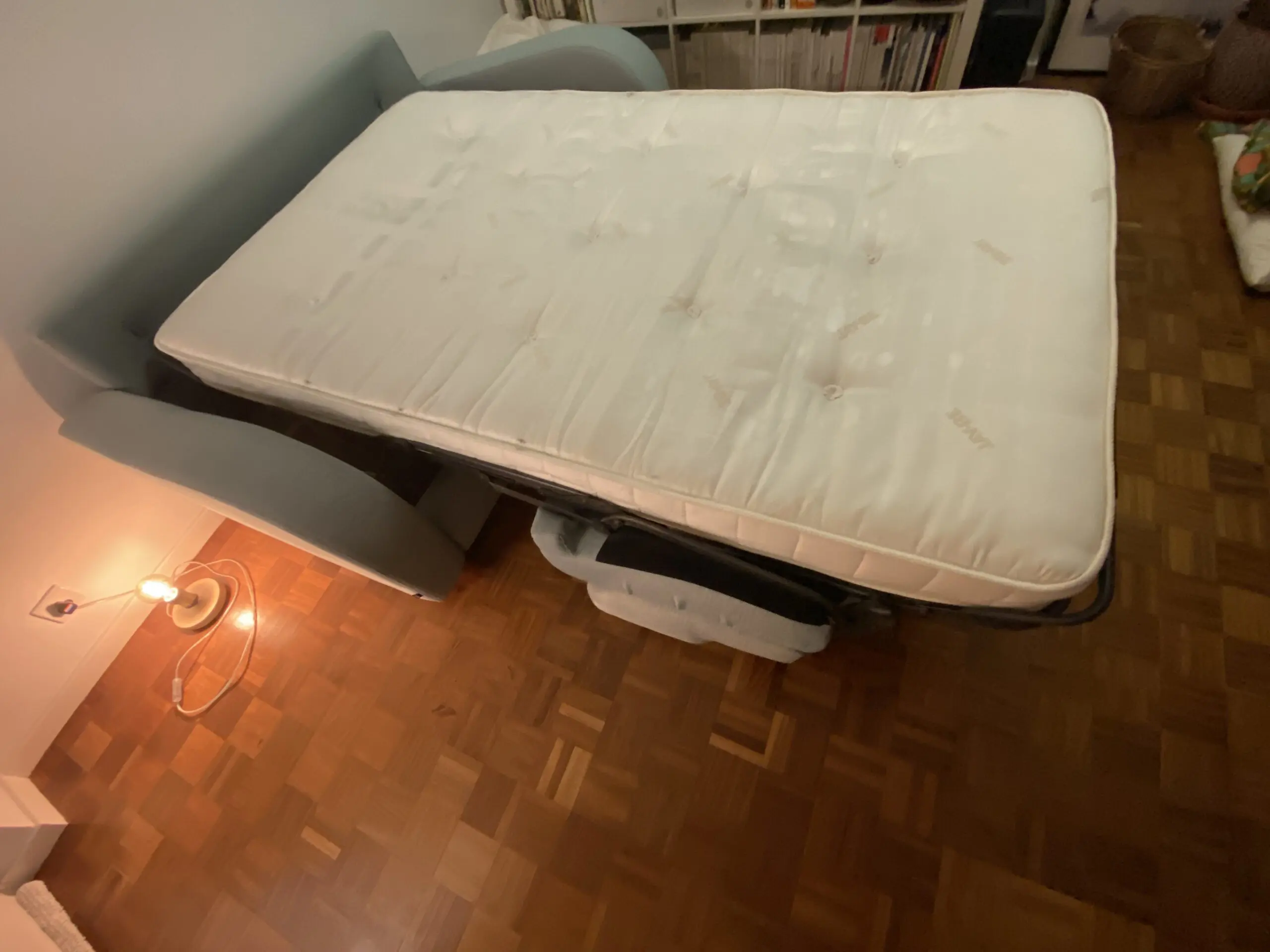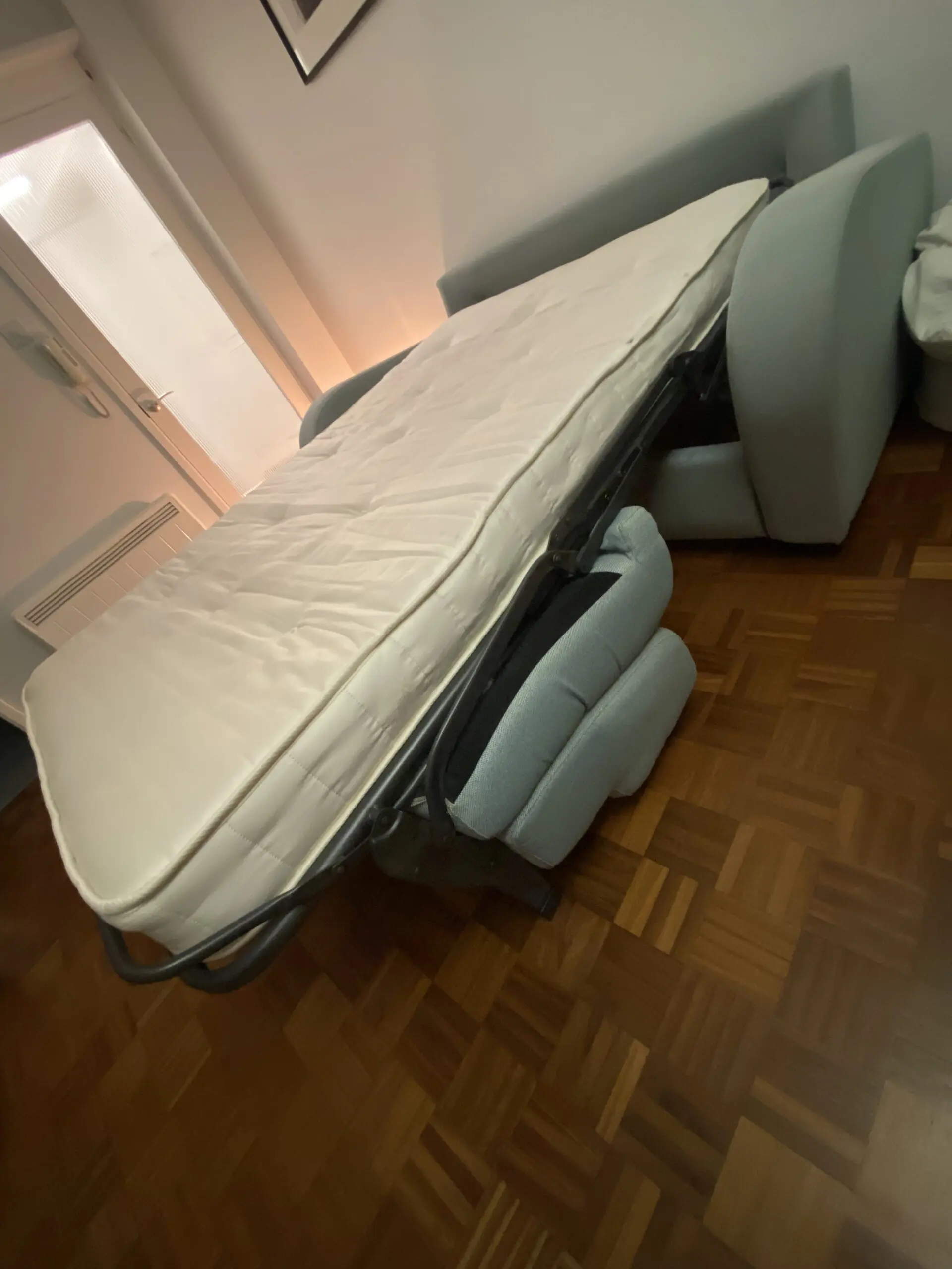 Light blue sofa bed 3 seats ,excellent condition! Mattress super comfortable, medium firmness, easy mechanism to assemble and disassemble. High quality material made to last.