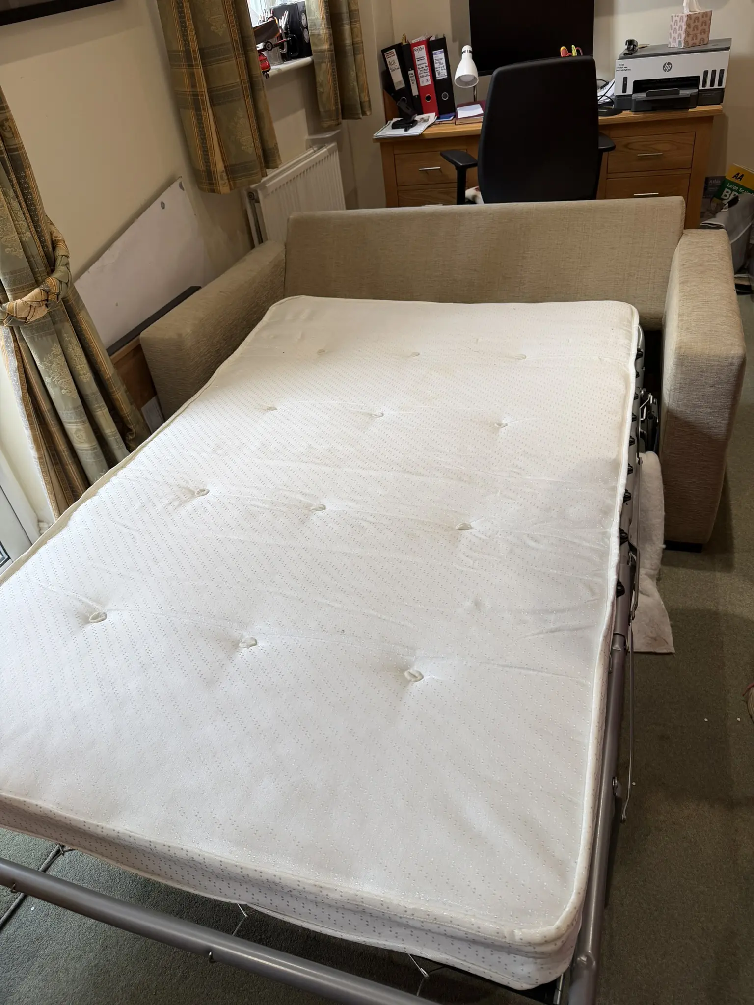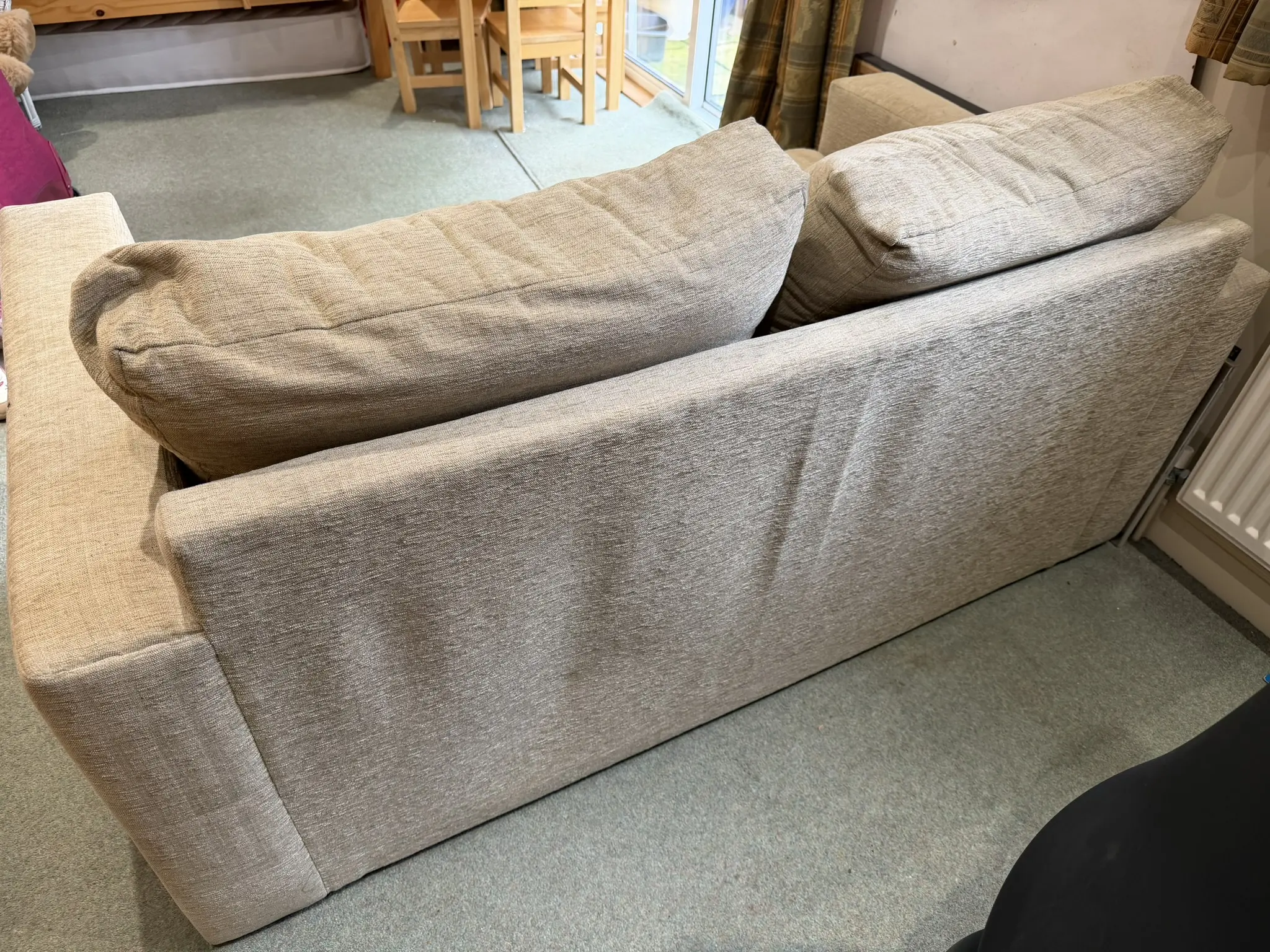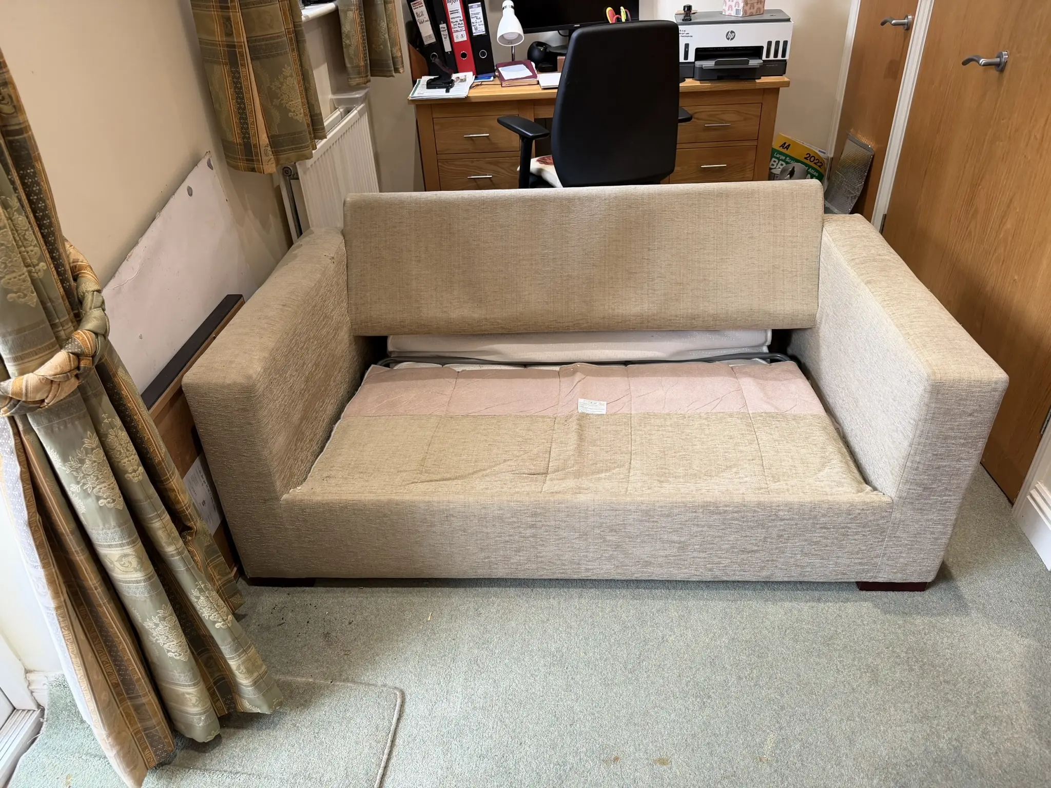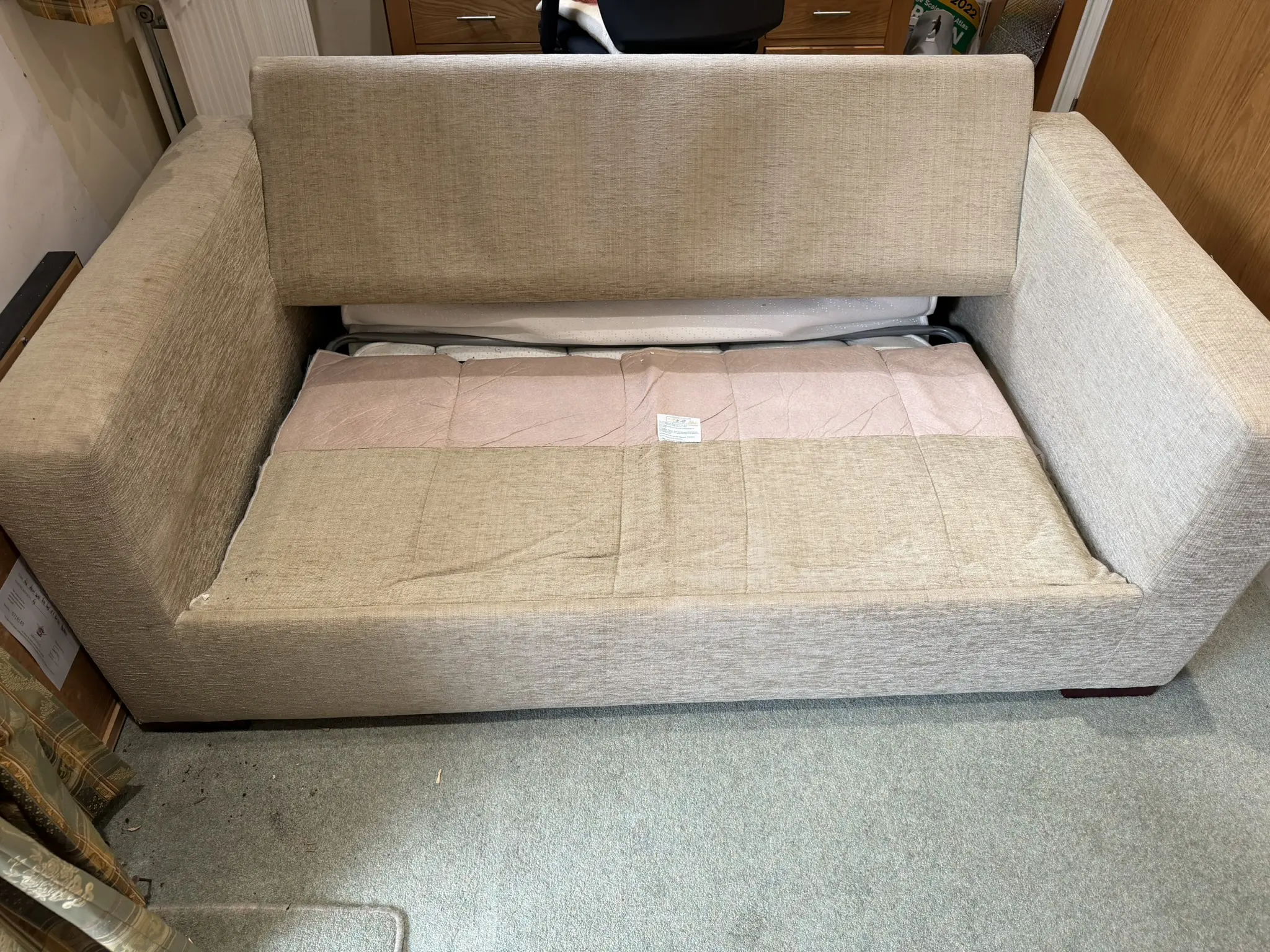 Good condition double sofa bed with the excellent ‘Sedac Meral*’ pull out mechanism. 13cm mattress in good condition. Hardly used with very comfy seating. Fire certificates attached.