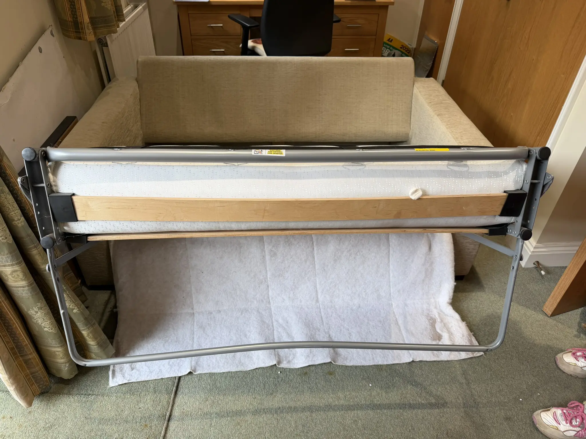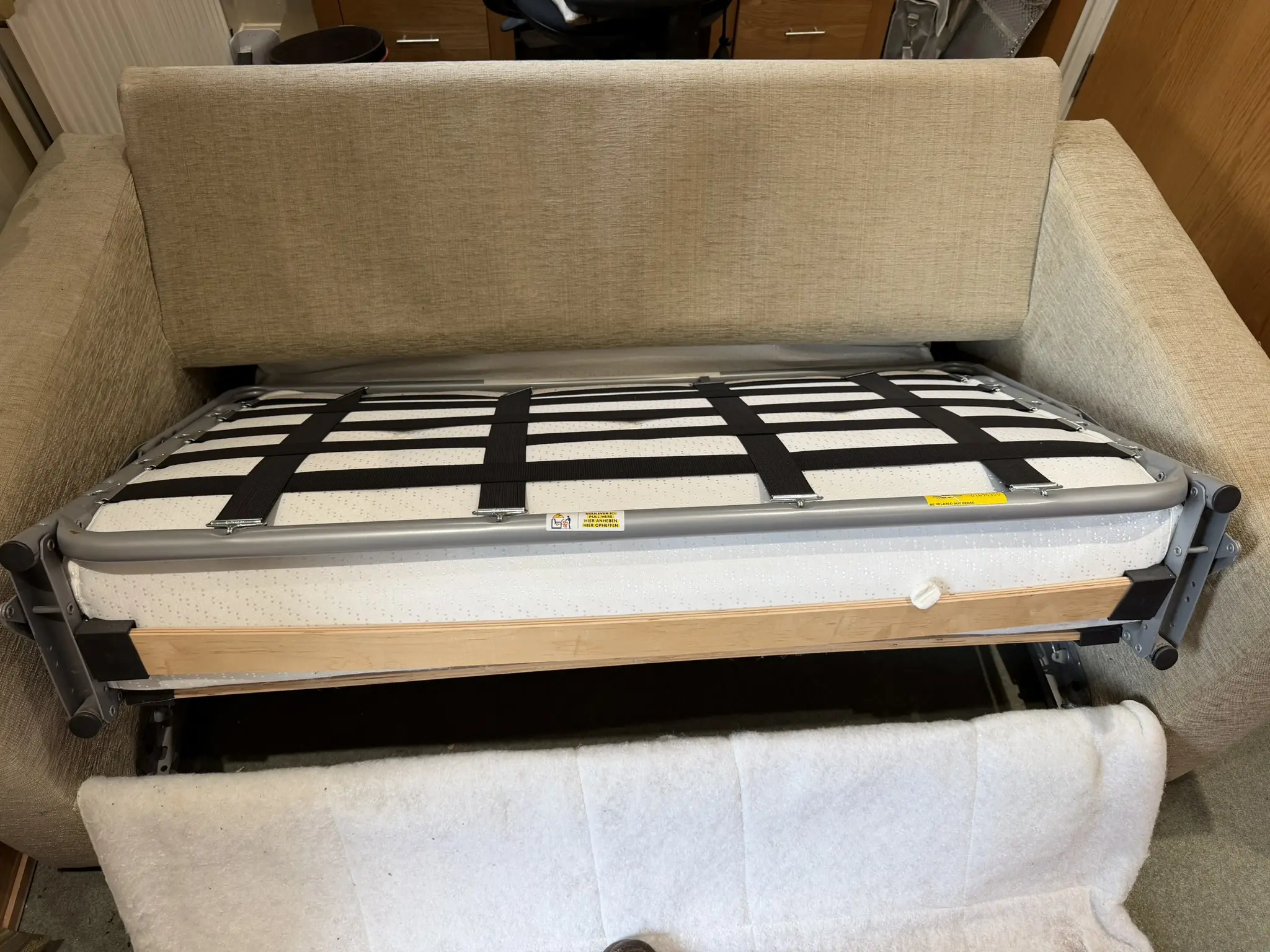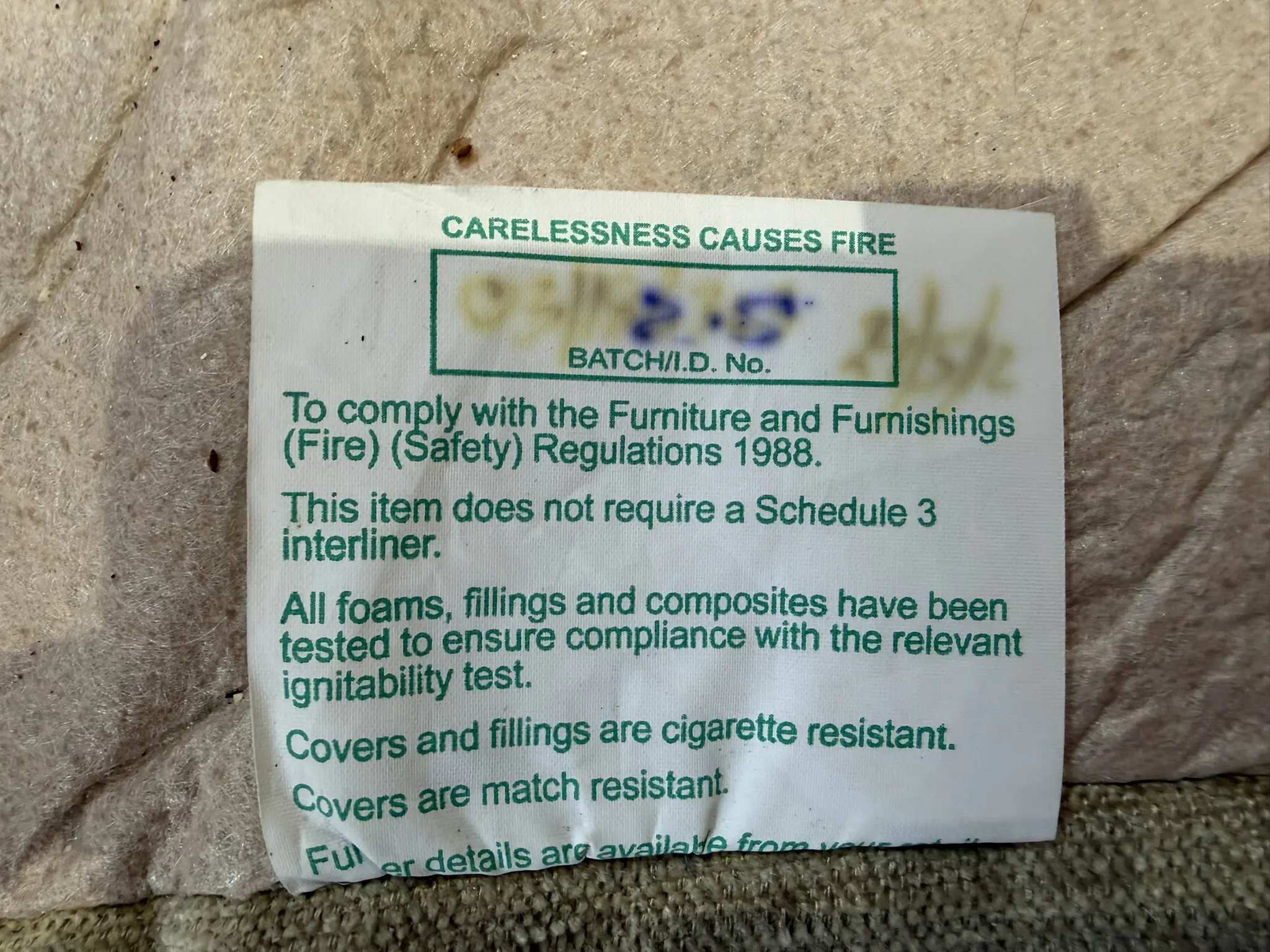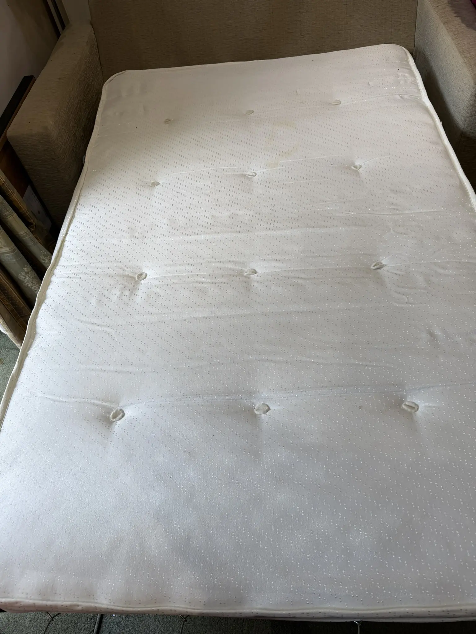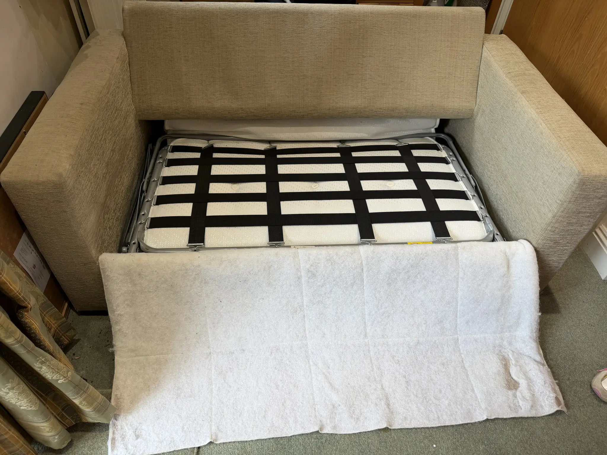 Good condition double sofa bed with the excellent ‘Sedac Meral*’ pull out mechanism. 13cm mattress in good condition. Hardly used with very comfy seating. Fire certificates attached.