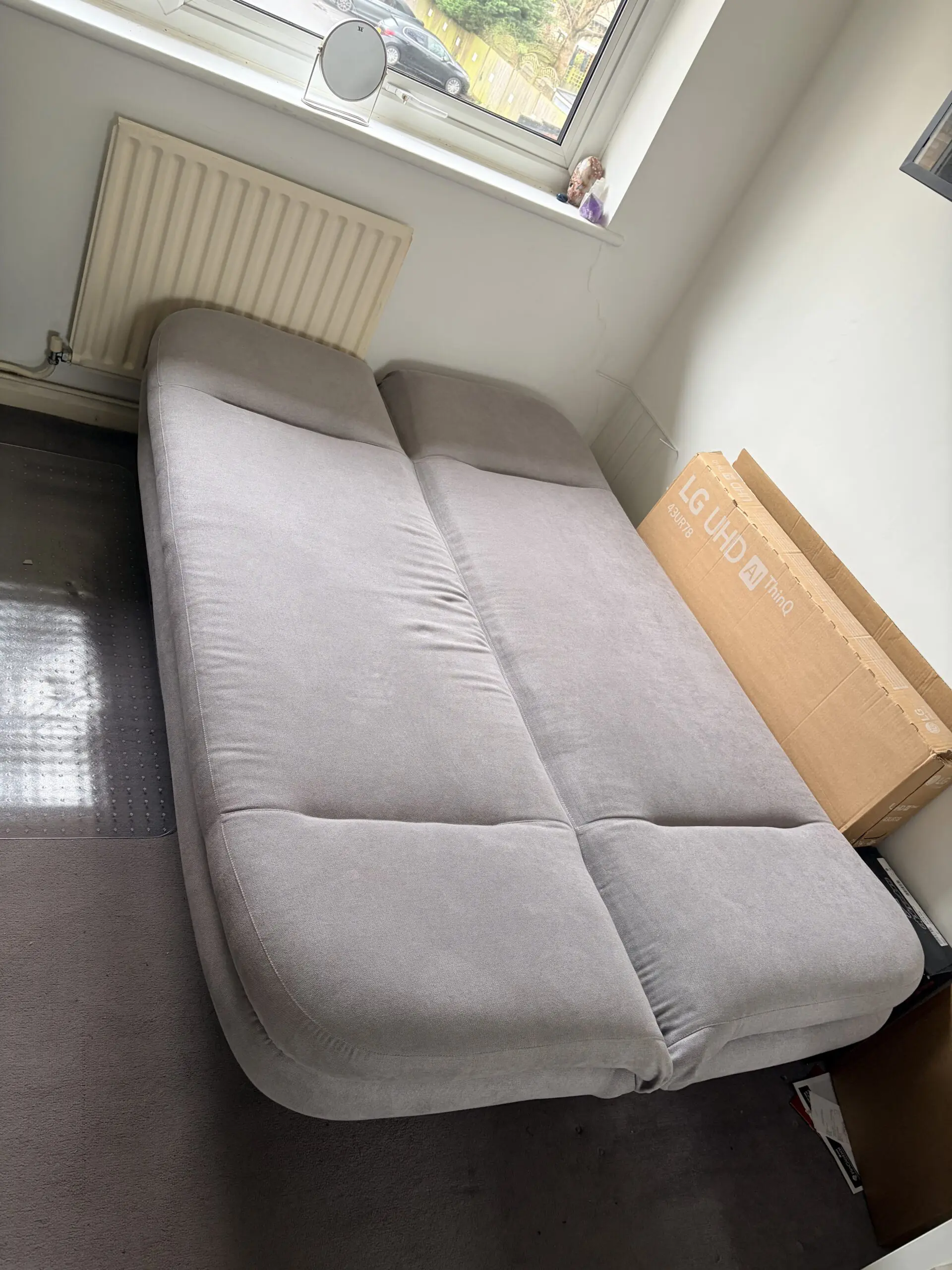 Grey fabric, 3 seater pull out sofa bed with storage. No tears, scuffs or stains from a smoke free home.