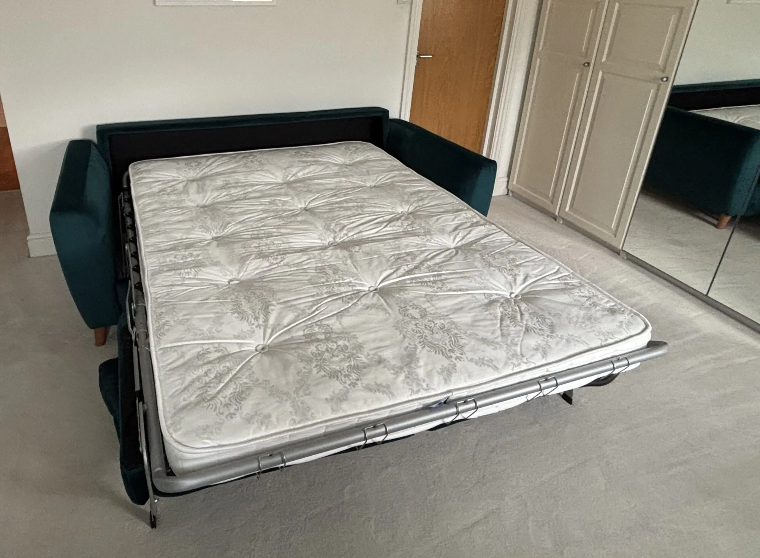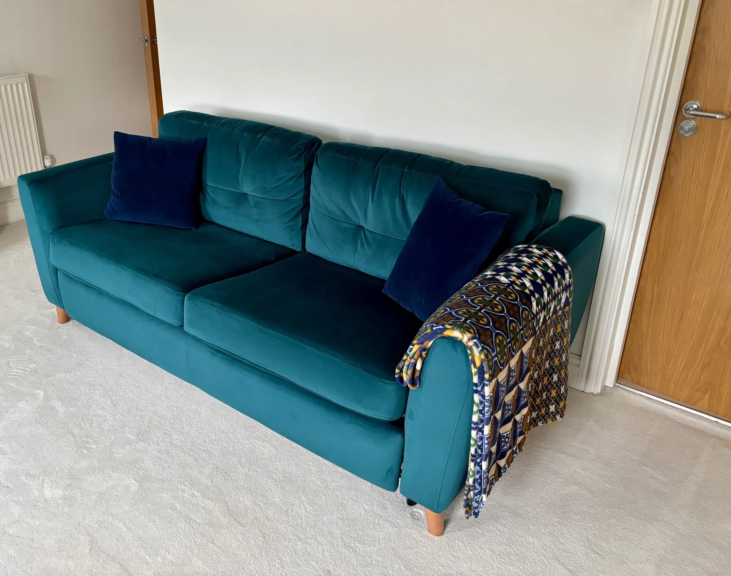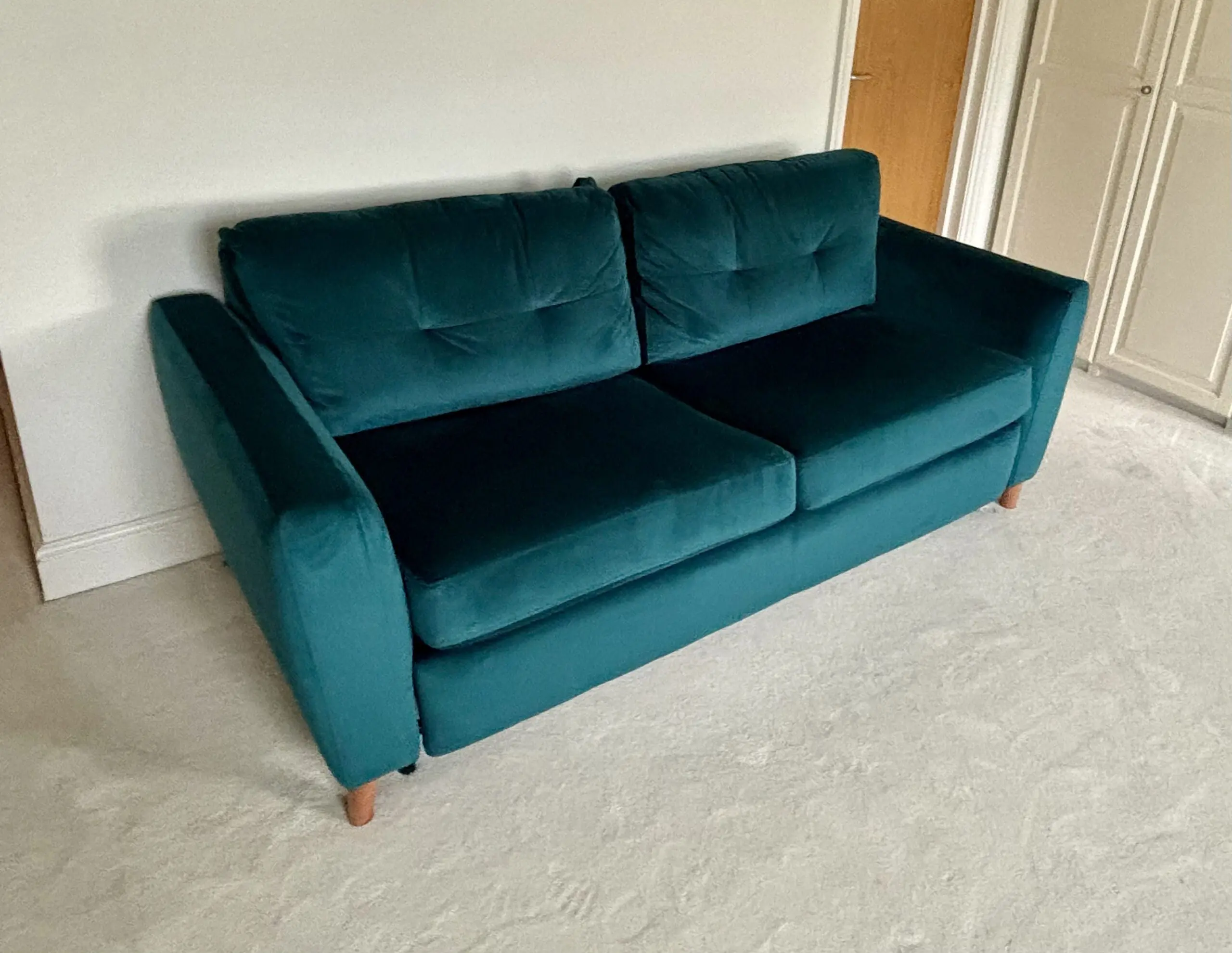 This is a comfortable and very easy-to-convert sofa bed, only being sold due to lack of space in our apartment. It has been kept in a guest bedroom/home office and was not used as our main sofa, so it shows minimal wear. The velvet fabric naturally shows temporary pressure marks when touched, which is normal and easily brushed out to restore a smooth appearance. A steamer can be used for deeper marks, although we have only needed to do this once since purchase.