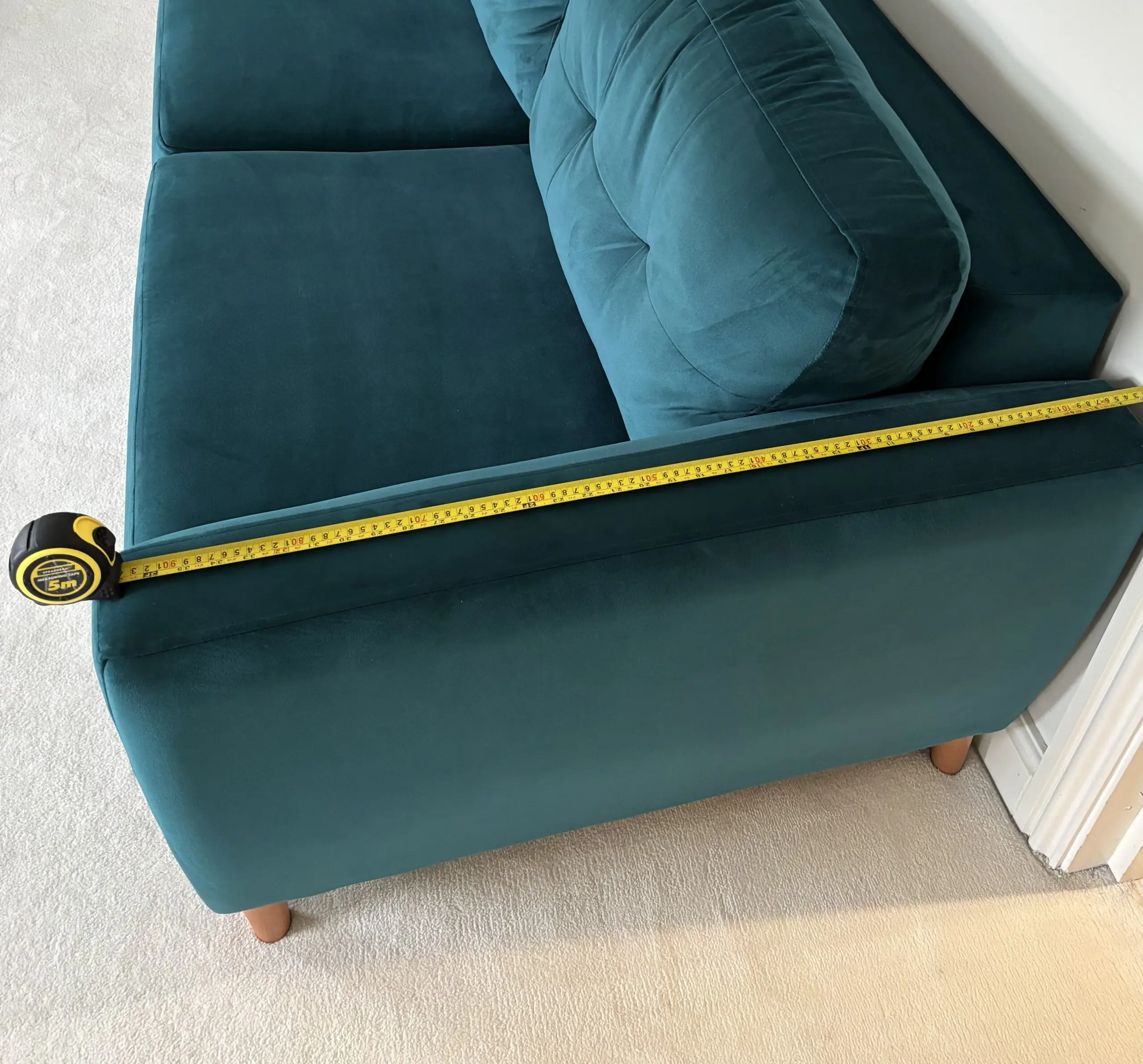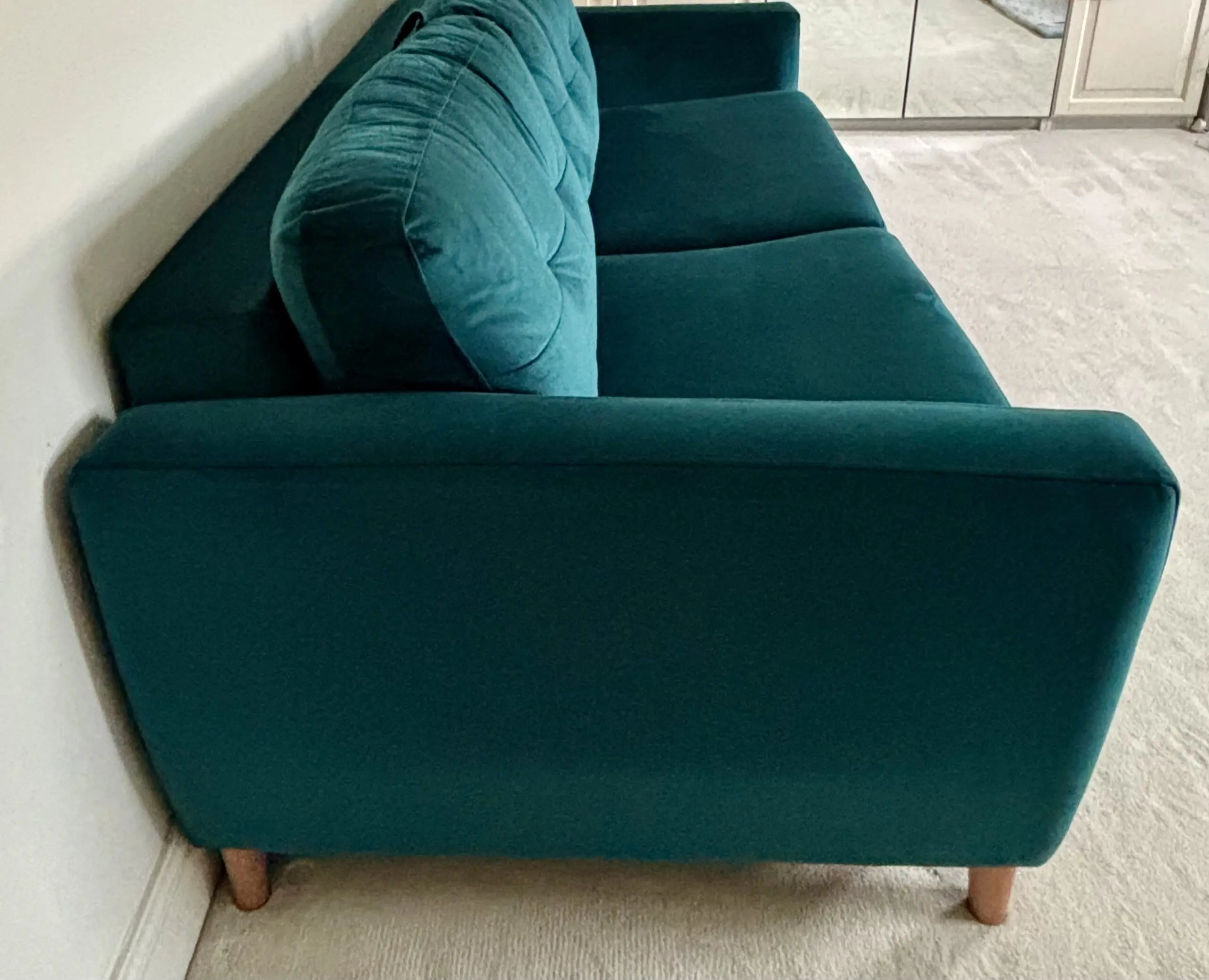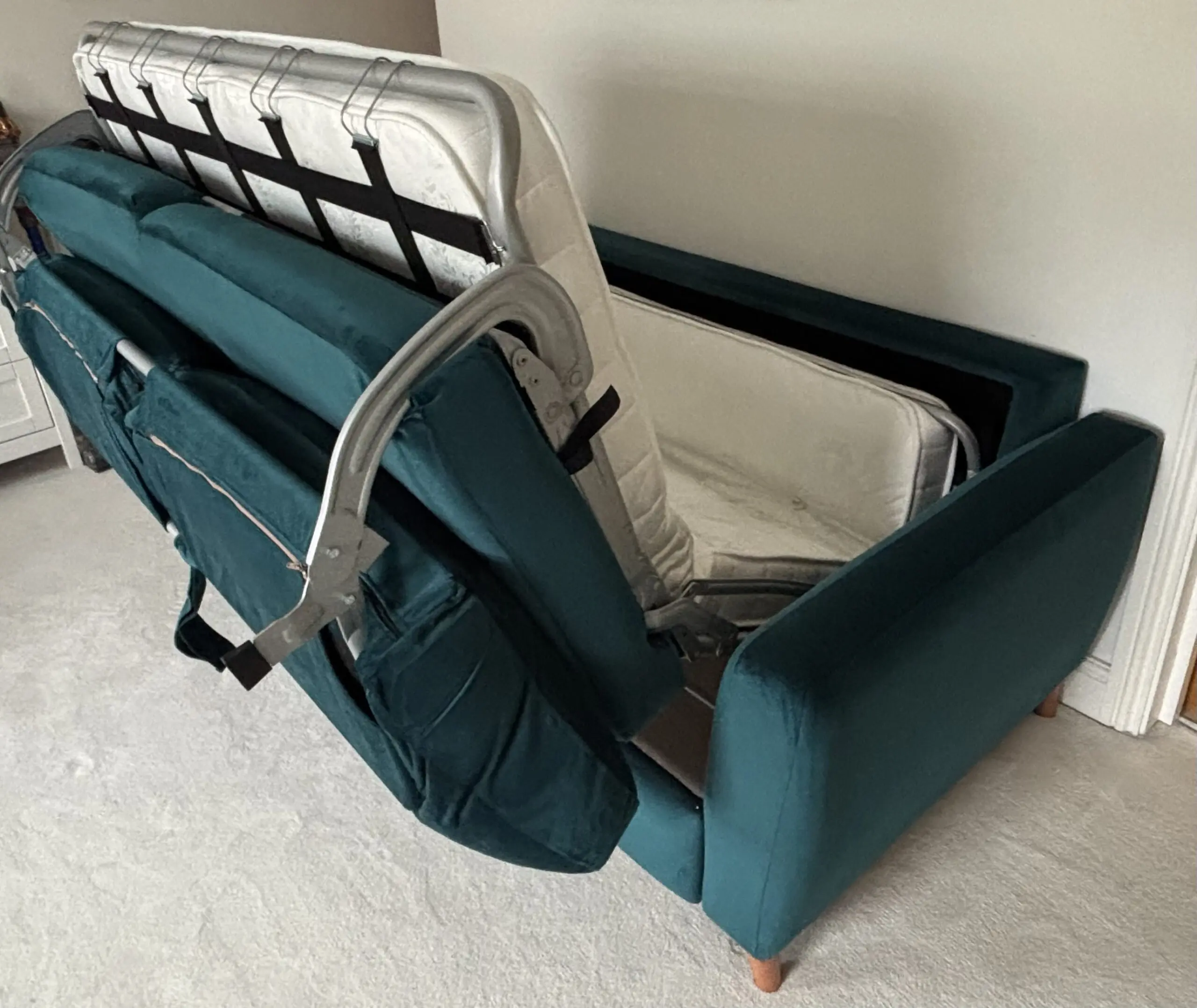 This is a comfortable and very easy-to-convert sofa bed, only being sold due to lack of space in our apartment. It has been kept in a guest bedroom/home office and was not used as our main sofa, so it shows minimal wear. The velvet fabric naturally shows temporary pressure marks when touched, which is normal and easily brushed out to restore a smooth appearance. A steamer can be used for deeper marks, although we have only needed to do this once since purchase.