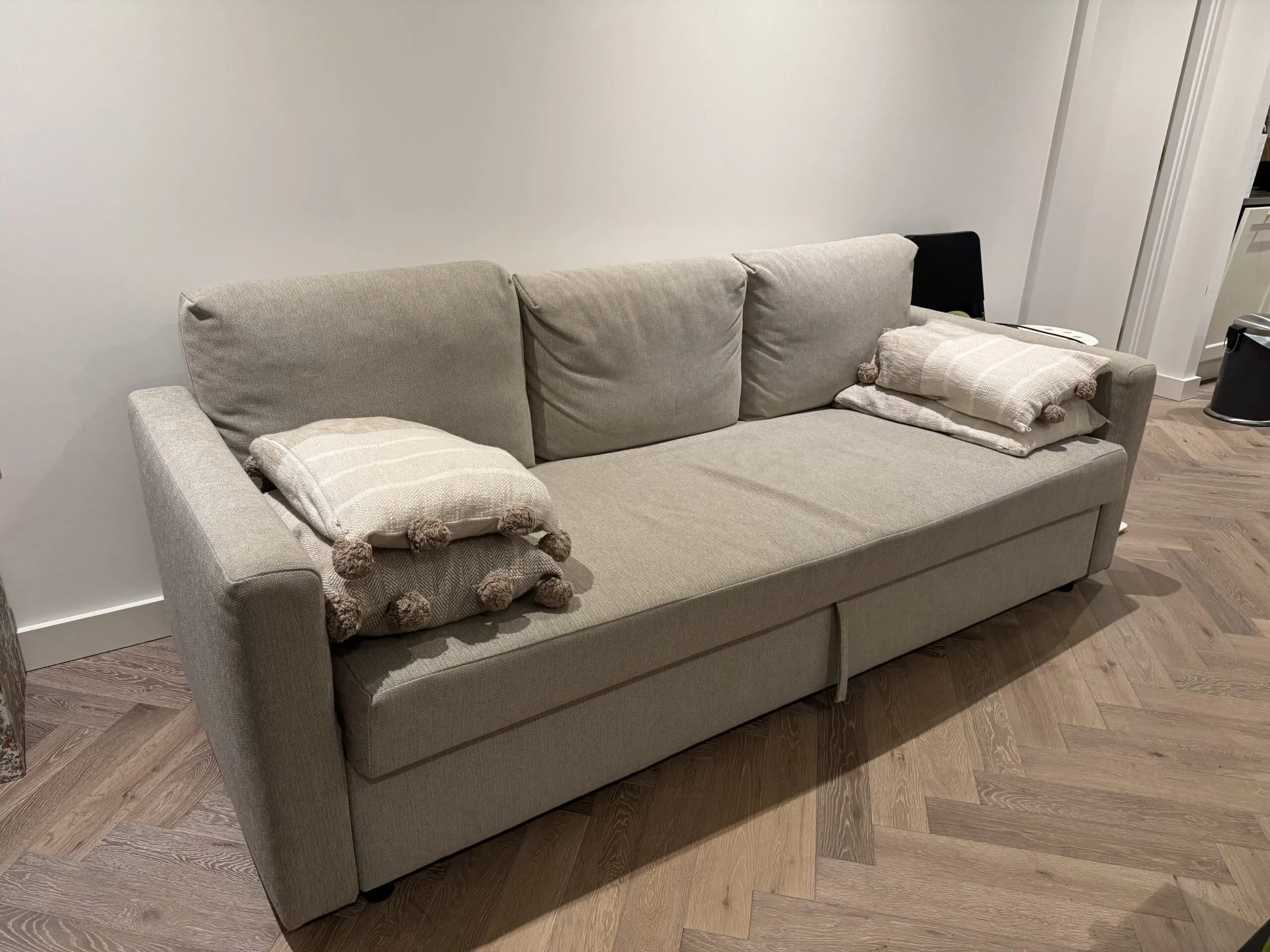 selling a pre-owned sofa due to moving. The sofa is in good overall condition with no major damage or sagging. It is well maintained, and very comfortable to sit on, can extend into a sofa bed for two people. There are only normal signs of use. Suitable for living rooms, rental properties, or temporary use. protected with sofa cover.