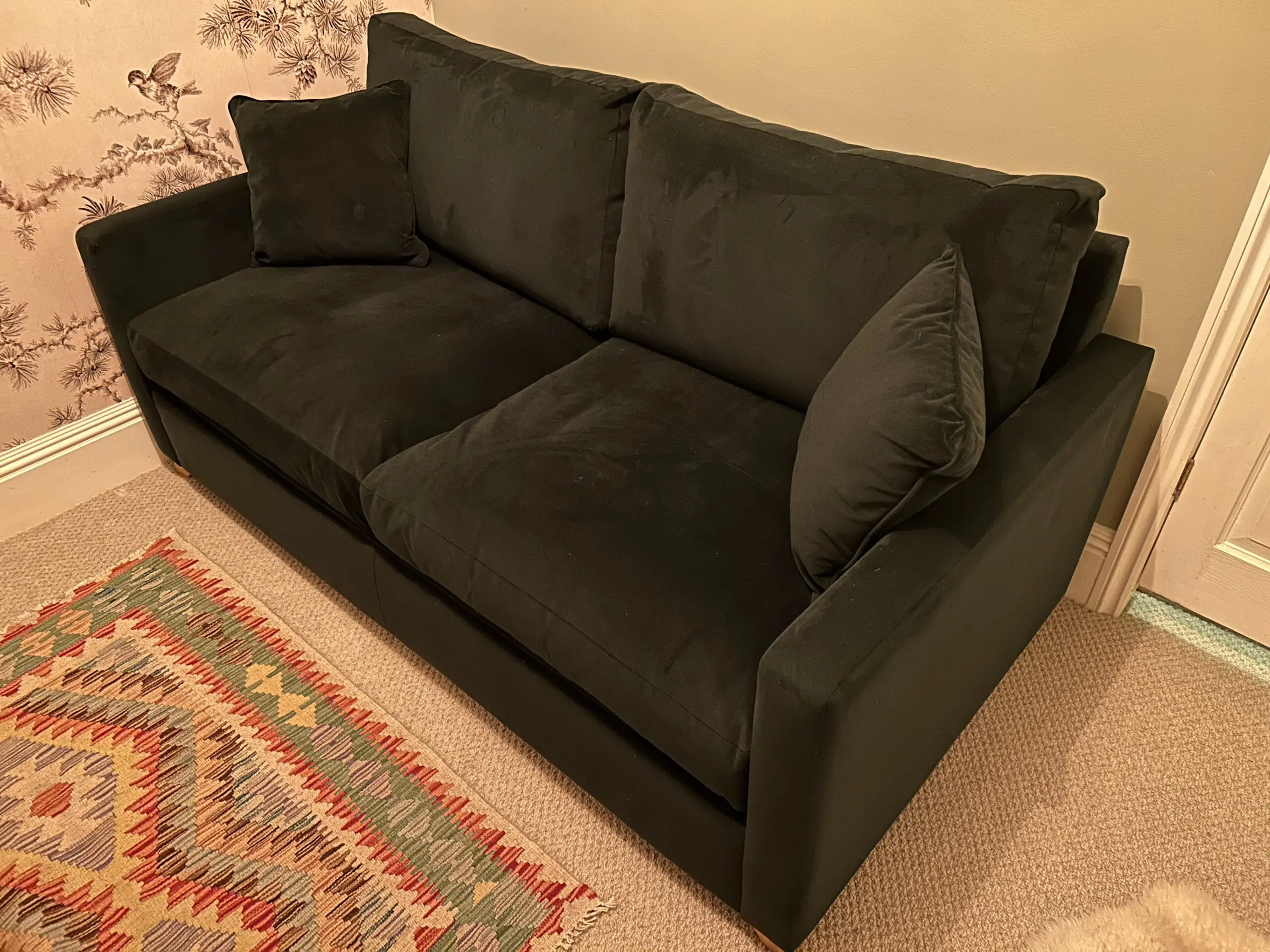 Hunter Green velvet 3 person sofa bed from Willow & Hall with matching cushions. Excellent condition as has only been used occasionally as a guest bed.