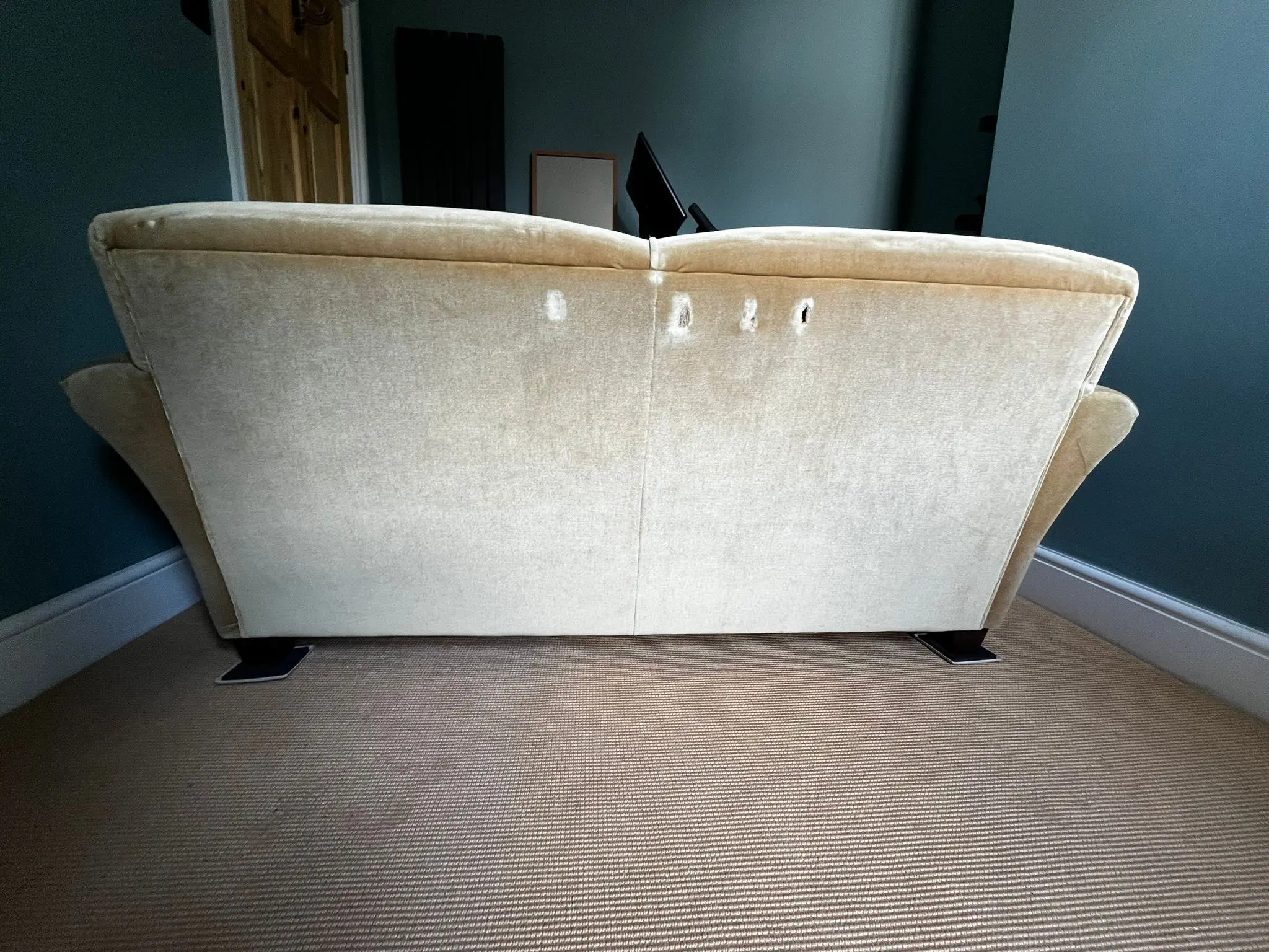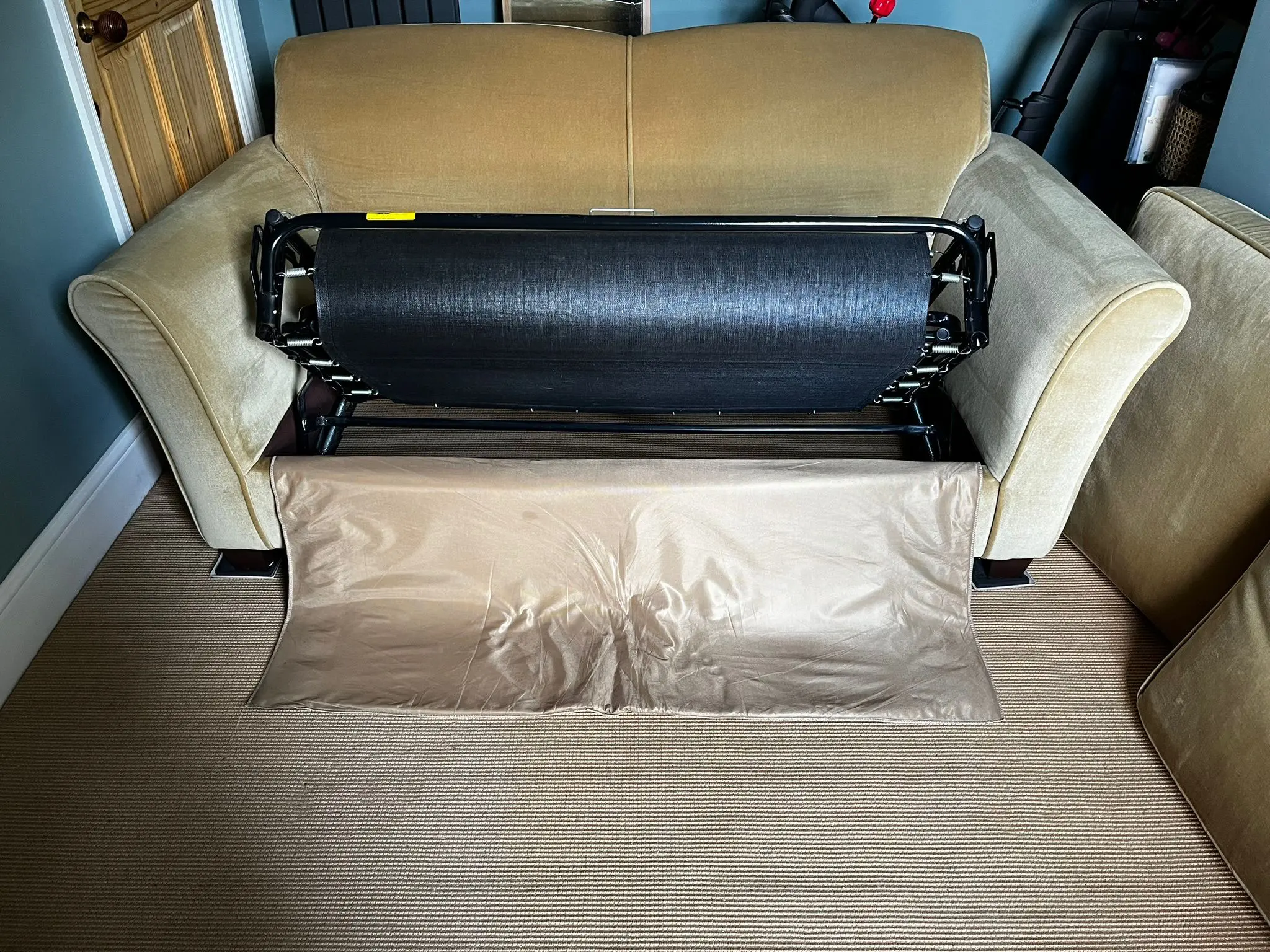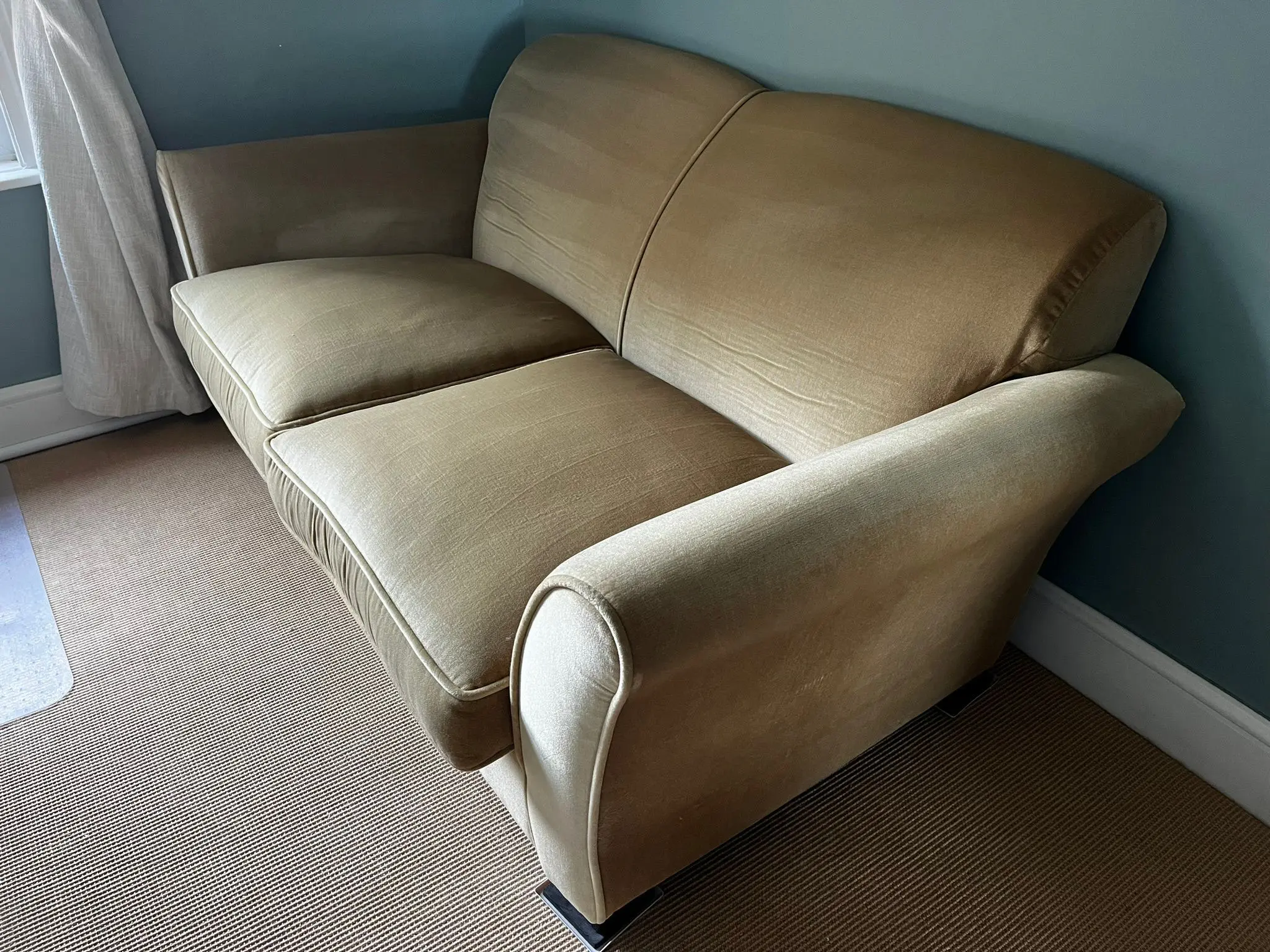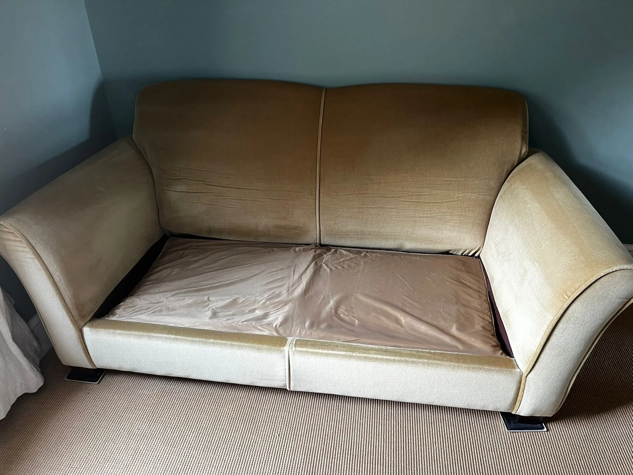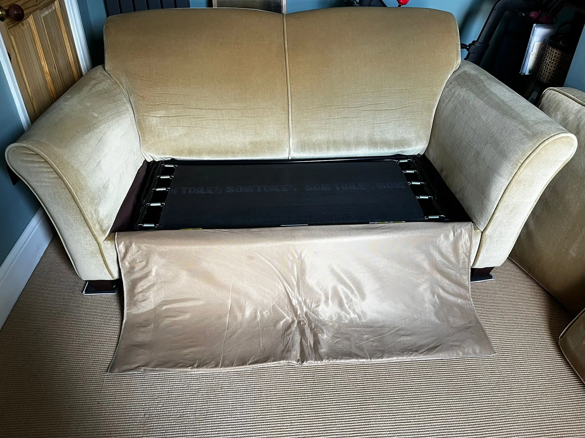 Custom upholstered yellow gold velvet dralon two-seater pull-out sleeper sofa couch, used.