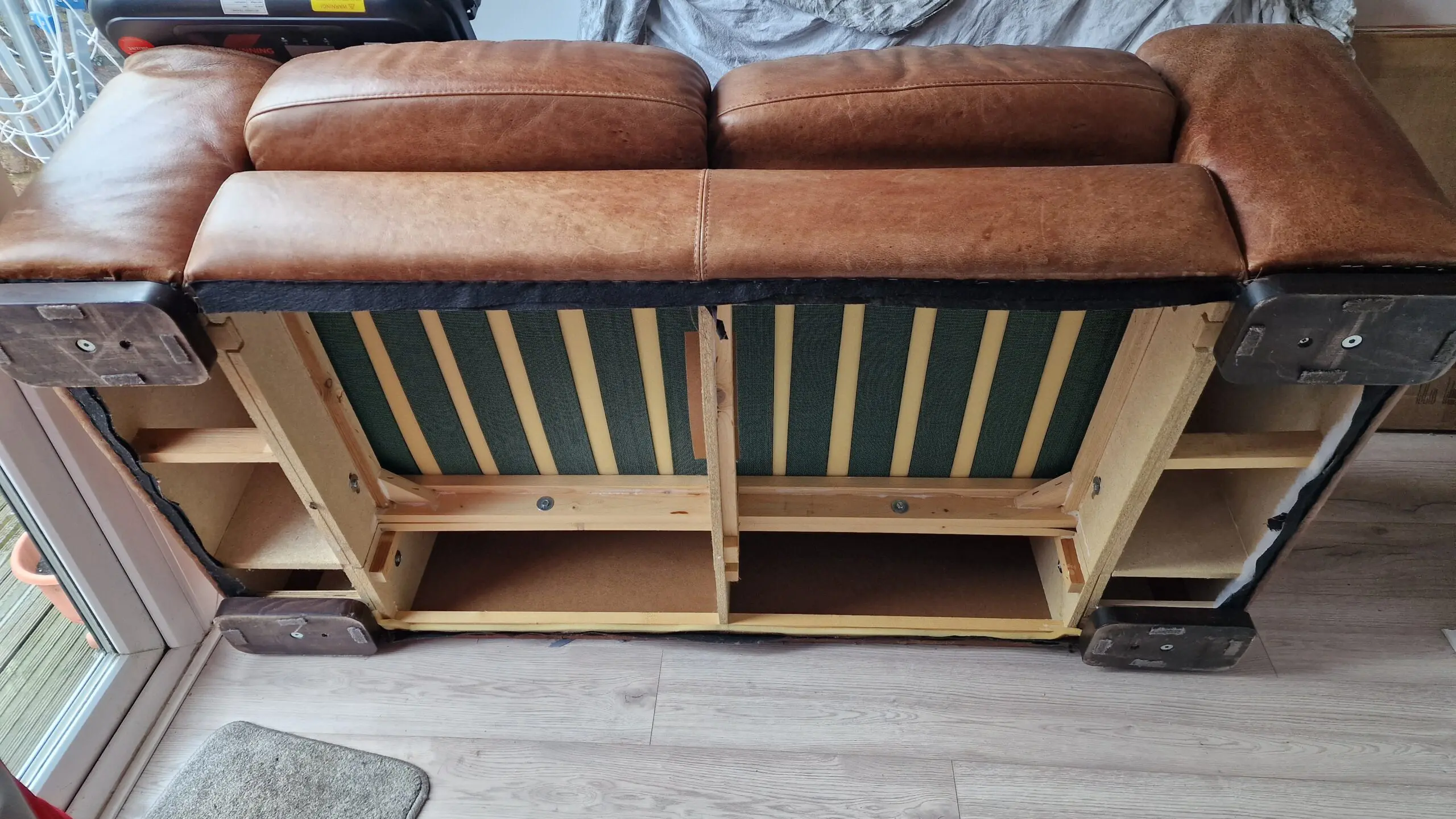The sofas both dismantle in to three sections, with the arm sections and feet being easily removable. Please note that the under fabric has been removed to dismantle them in the past (Pictured). This can be easily replaced with some fabric once in it’s new home – It is not visible unless actively looking under the sofas.