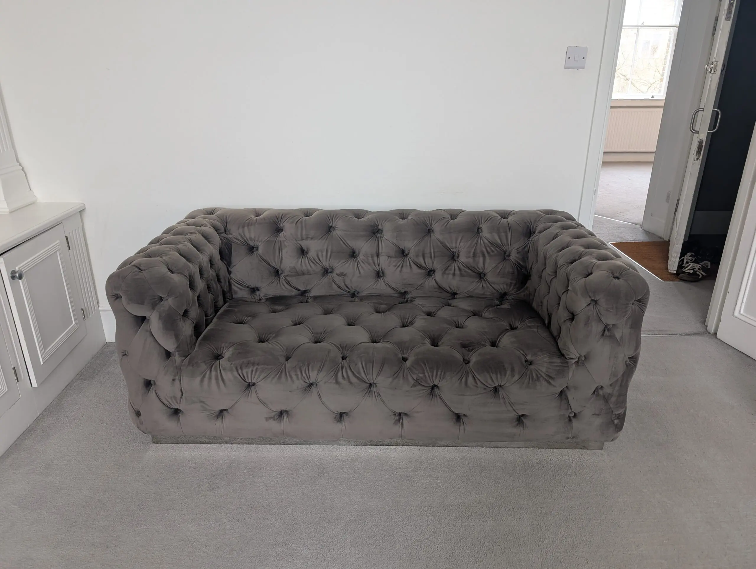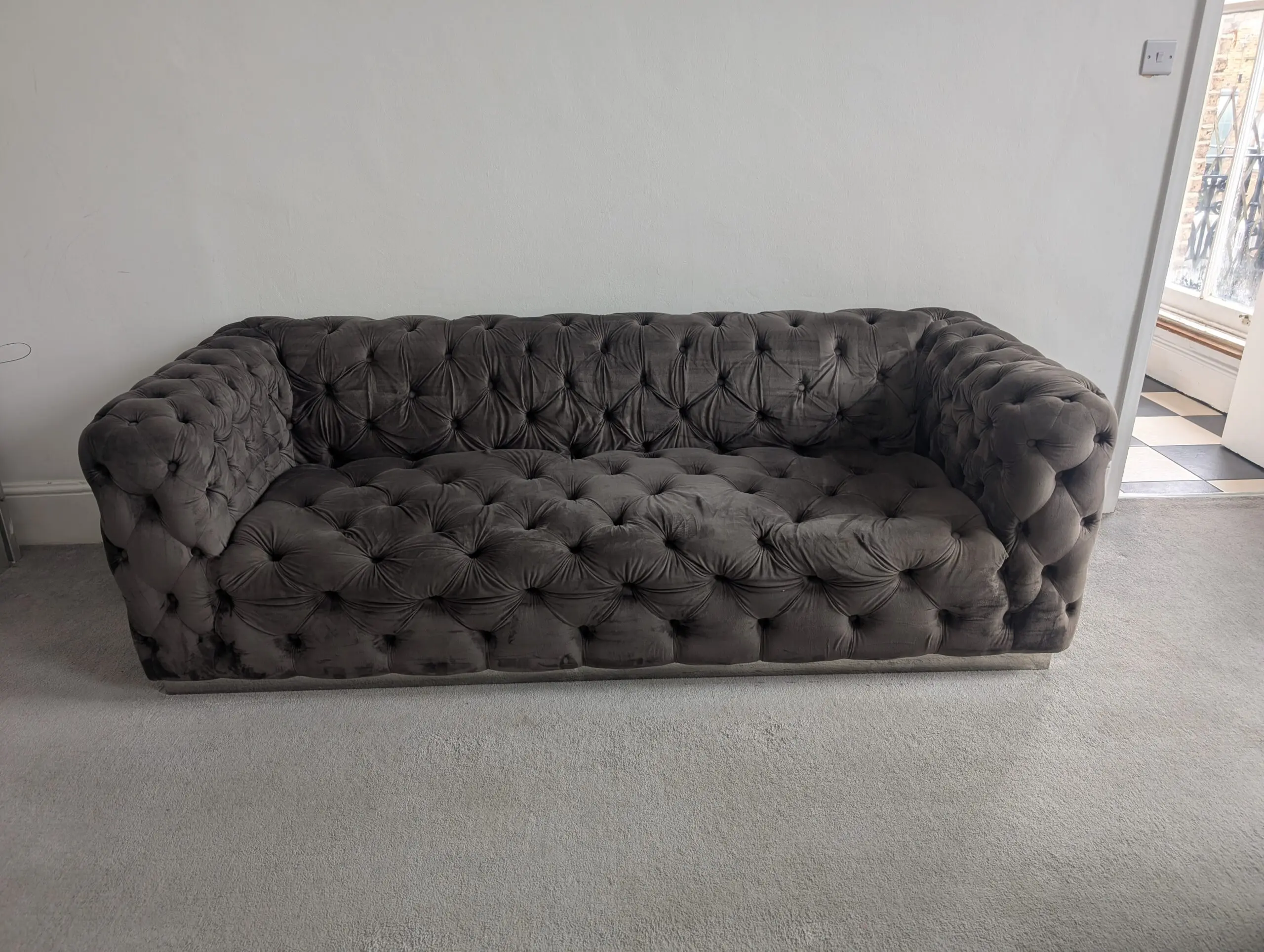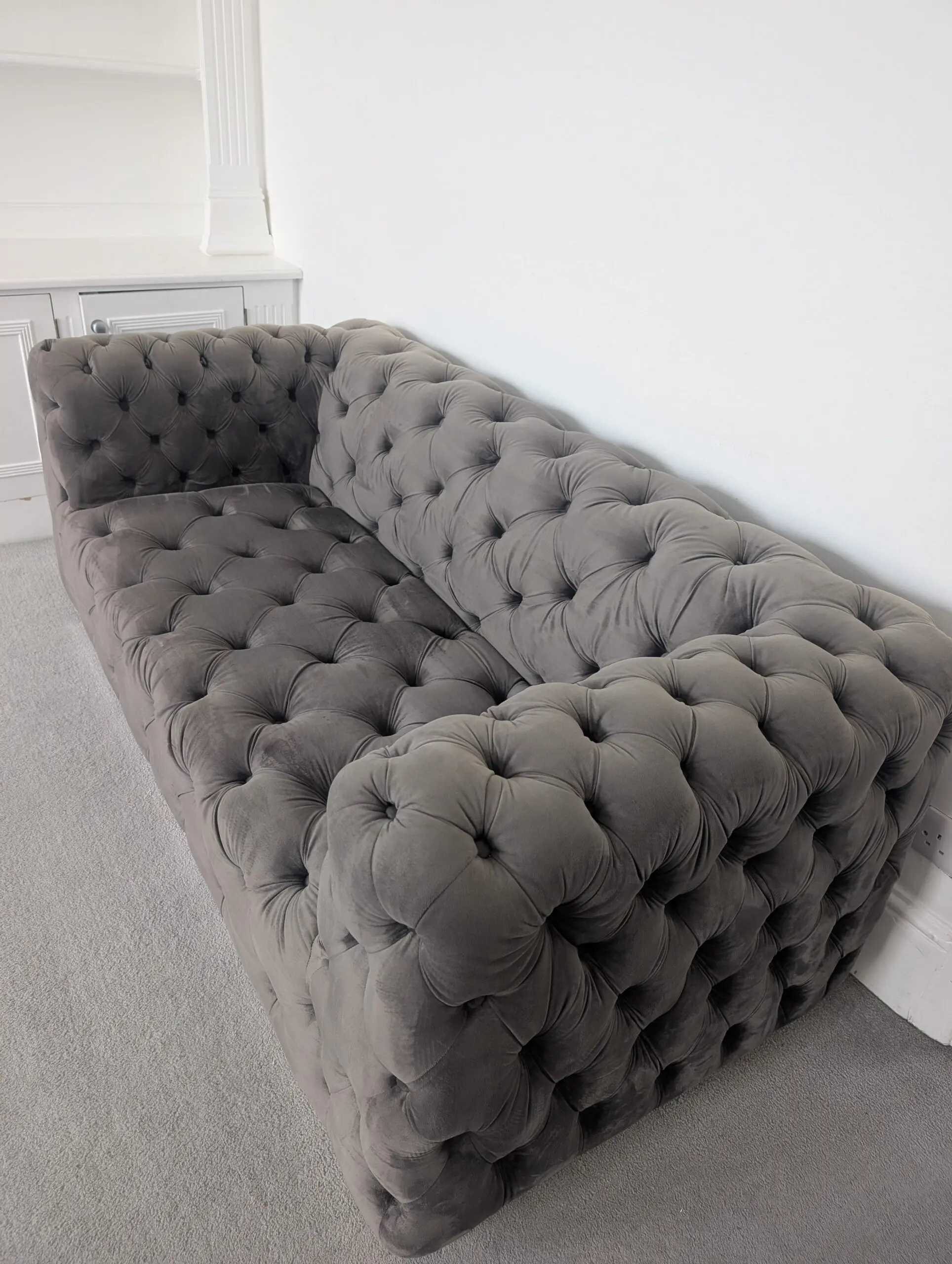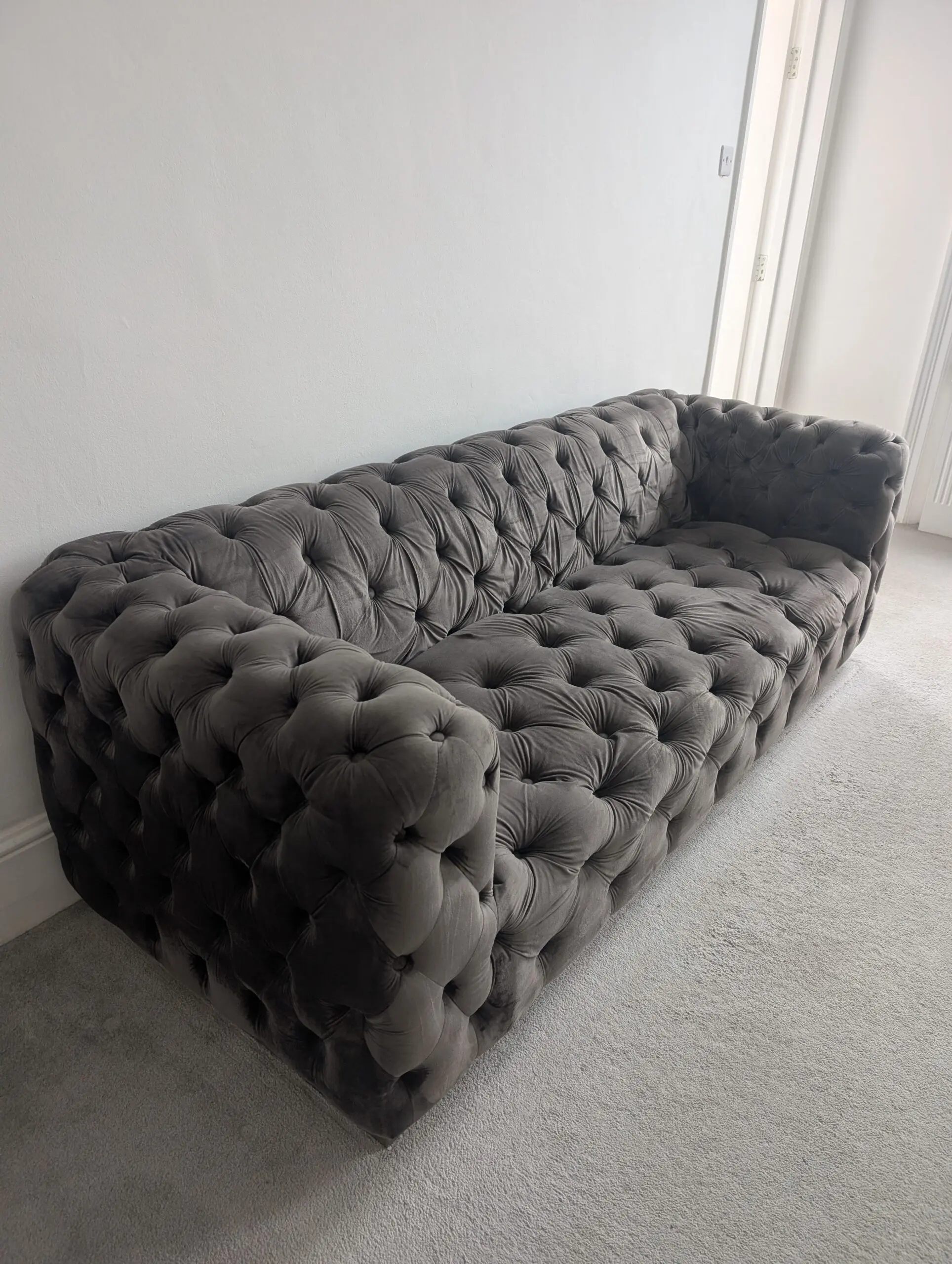 Luxury grey velvet Chesterfield-style sofa set with deep button tufting. Very comfortable, solid build, and in great condition. Perfect statement piece for a living room.