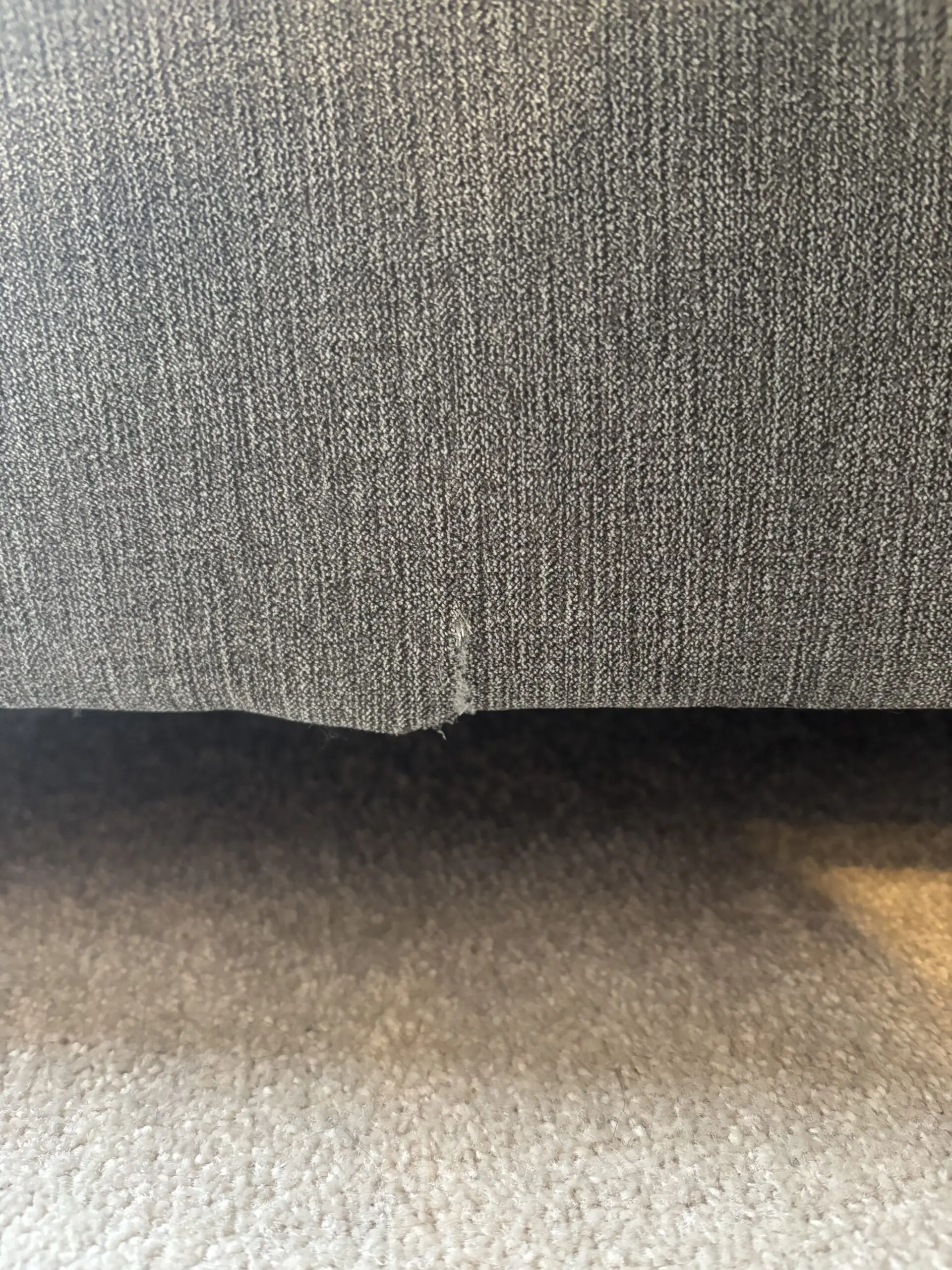Armchair has slight tare to bottom which happened when we were moving them into the house. Have photoed this up close and at a distance as it is tiny.