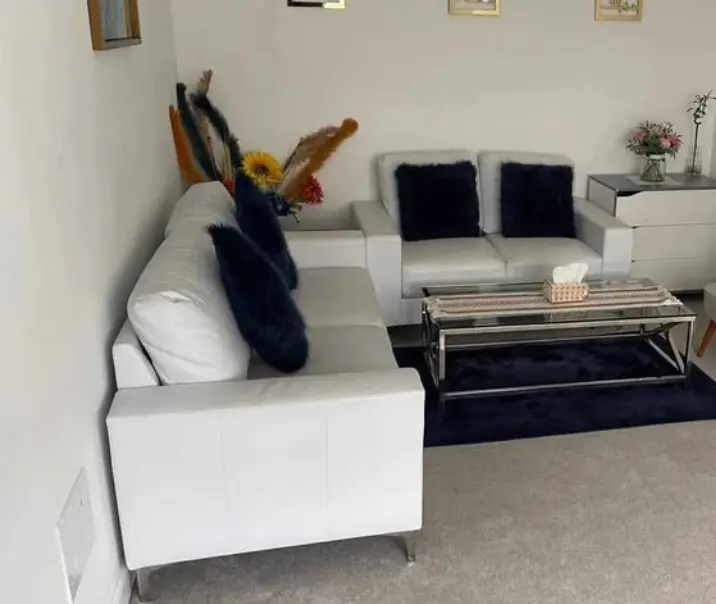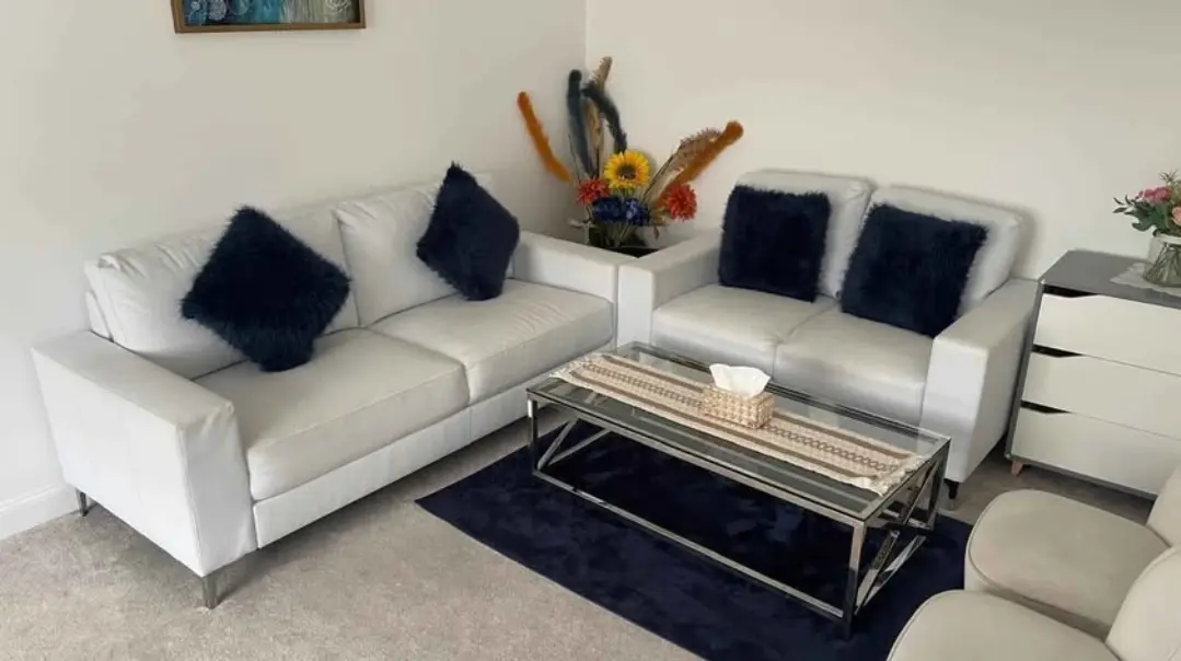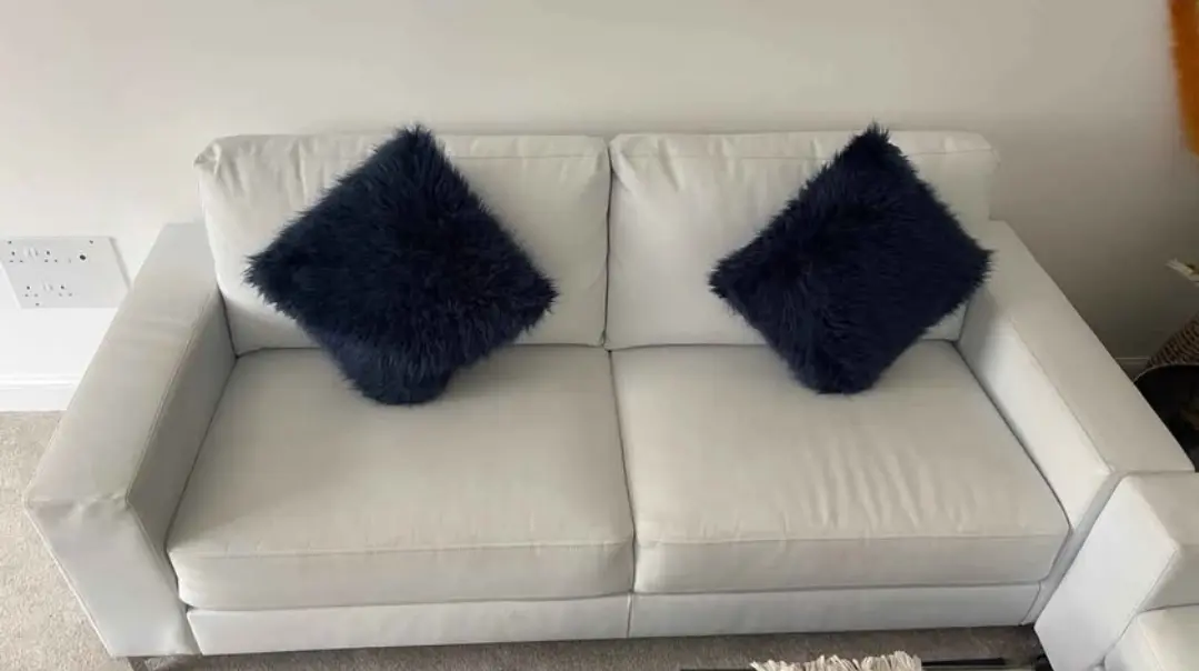 2 white lather sofa set. Hardly used. In exilent condition. Perfect to modern touch to sitting room.