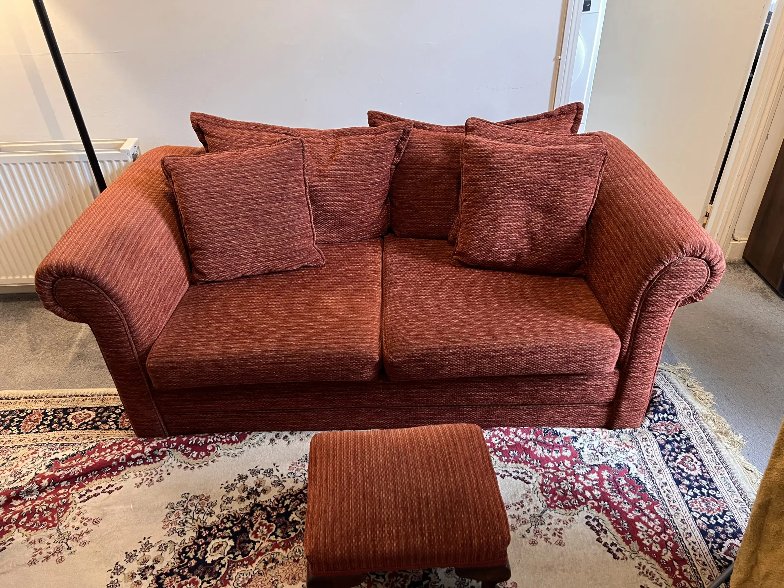 Two beautiful red two-seater sofas with matching footrest.
