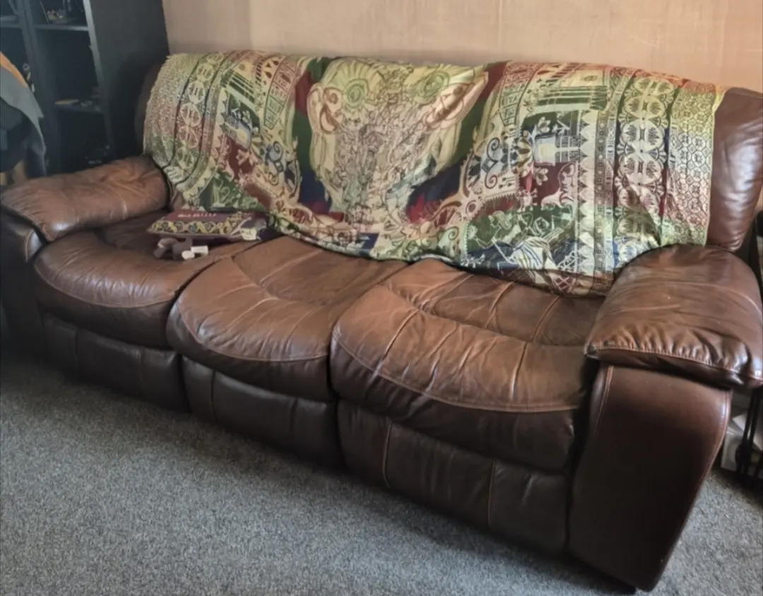 3 seater brown leather manual recliner sofa and 2 seater electric brown leather recliner sofa. Both in good condition