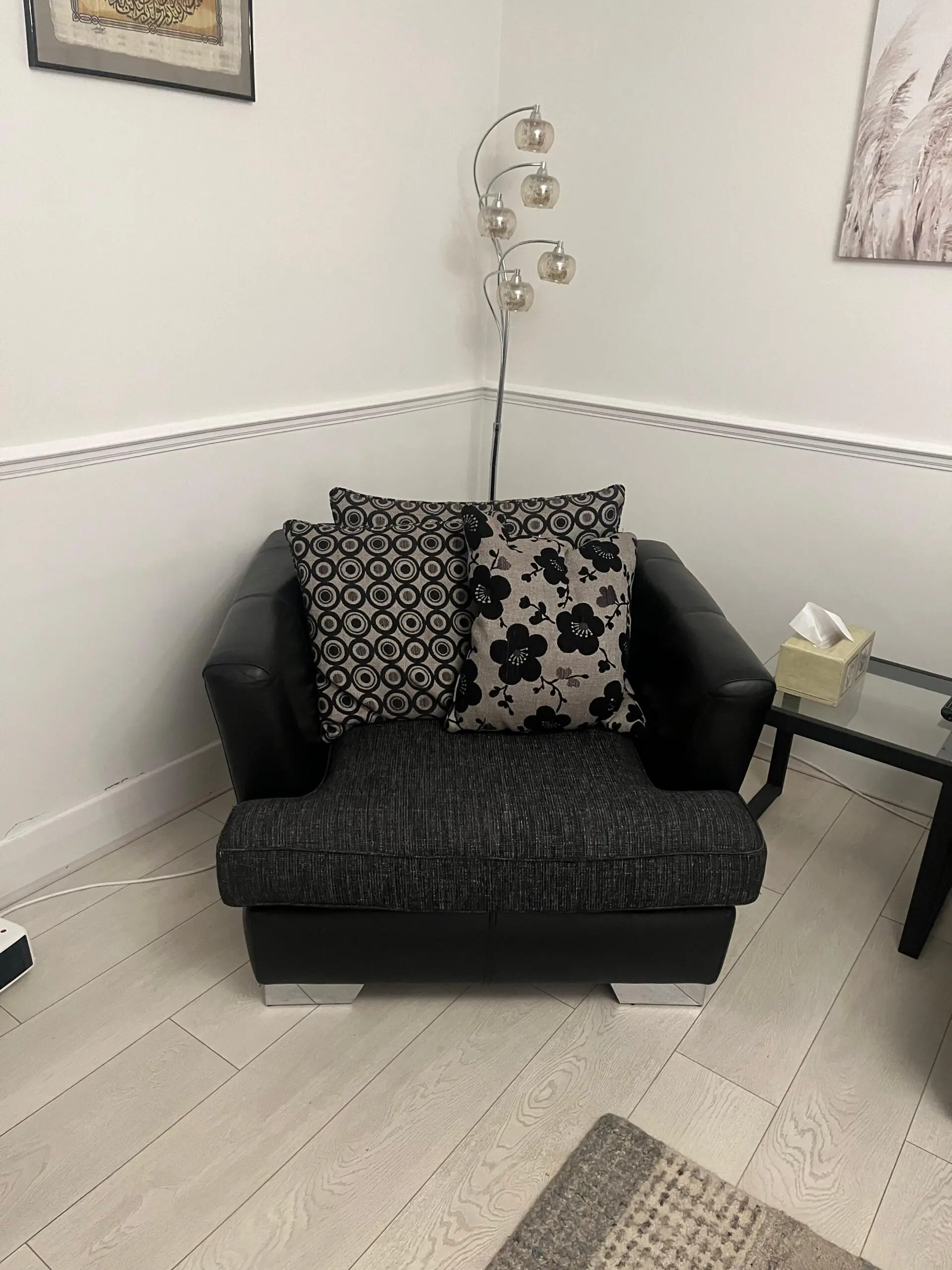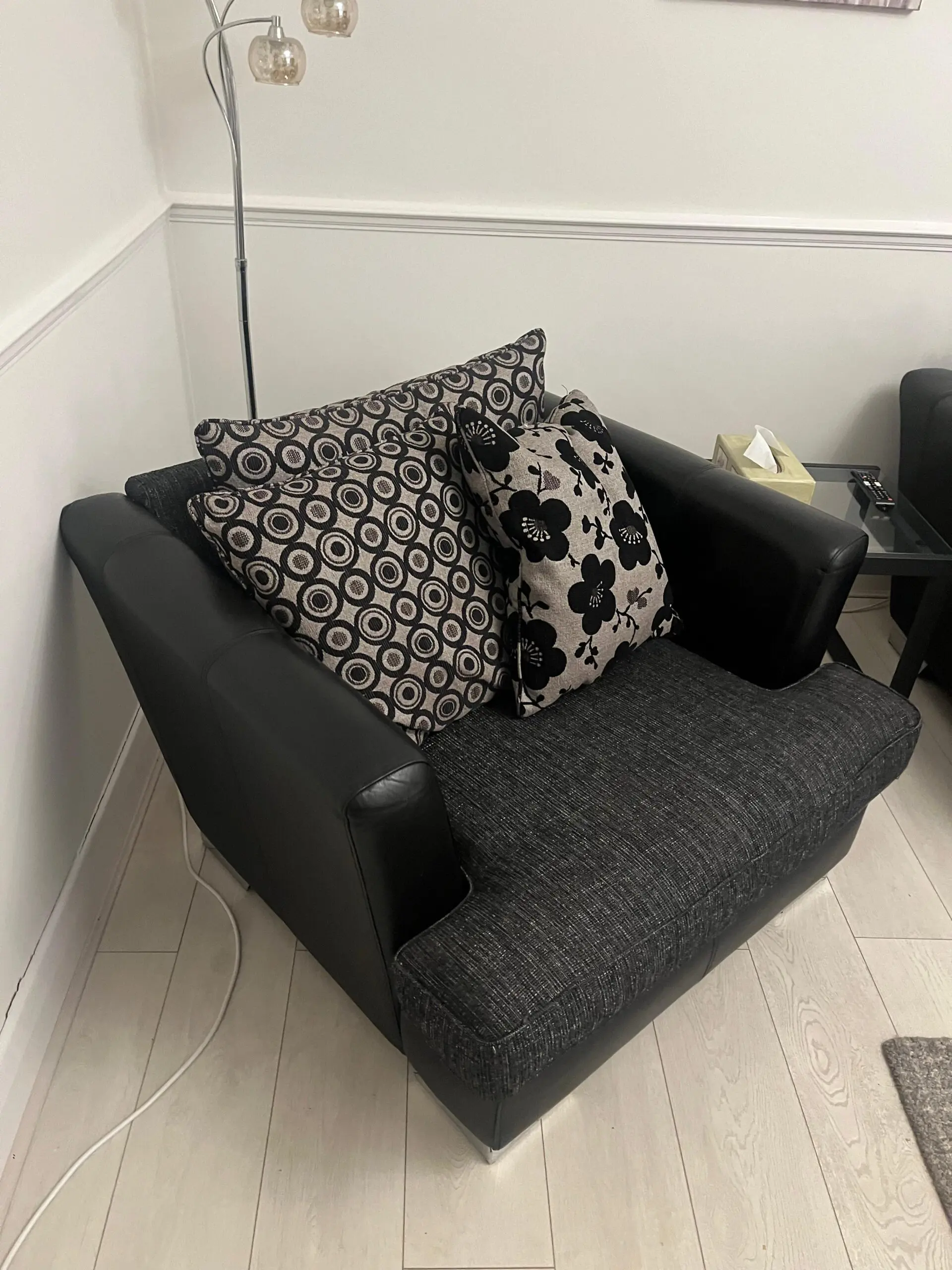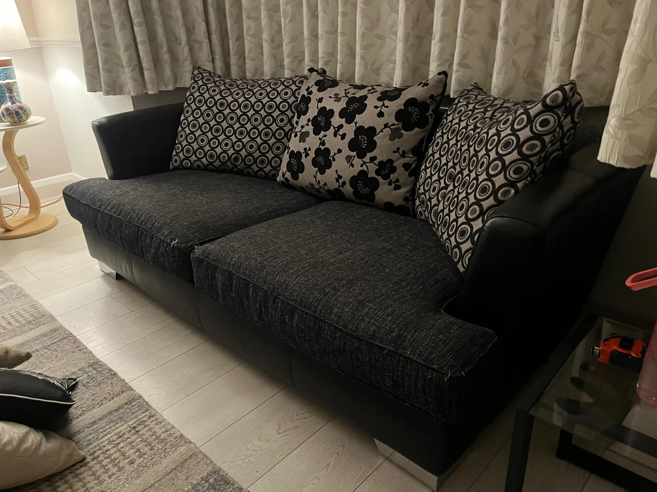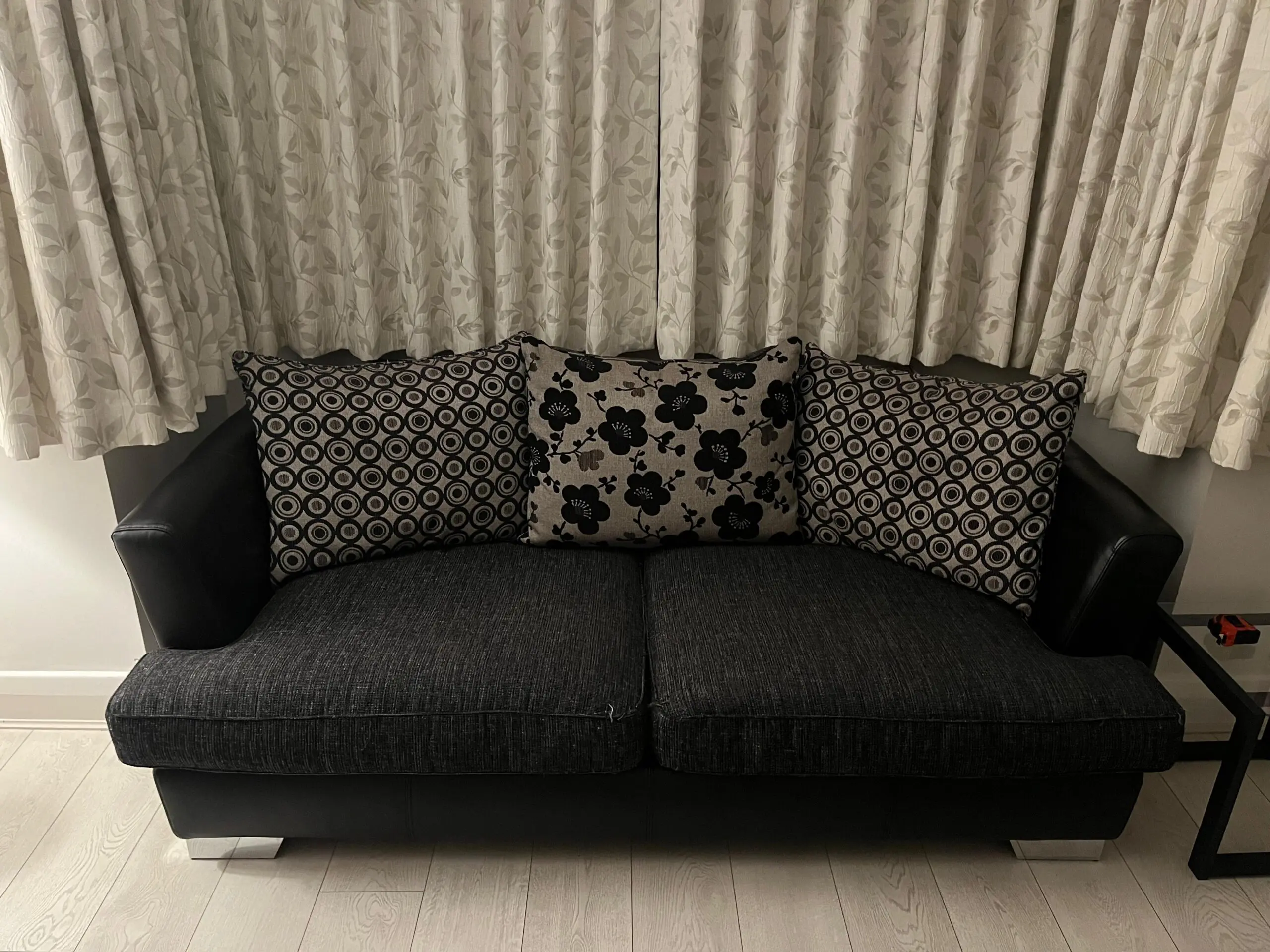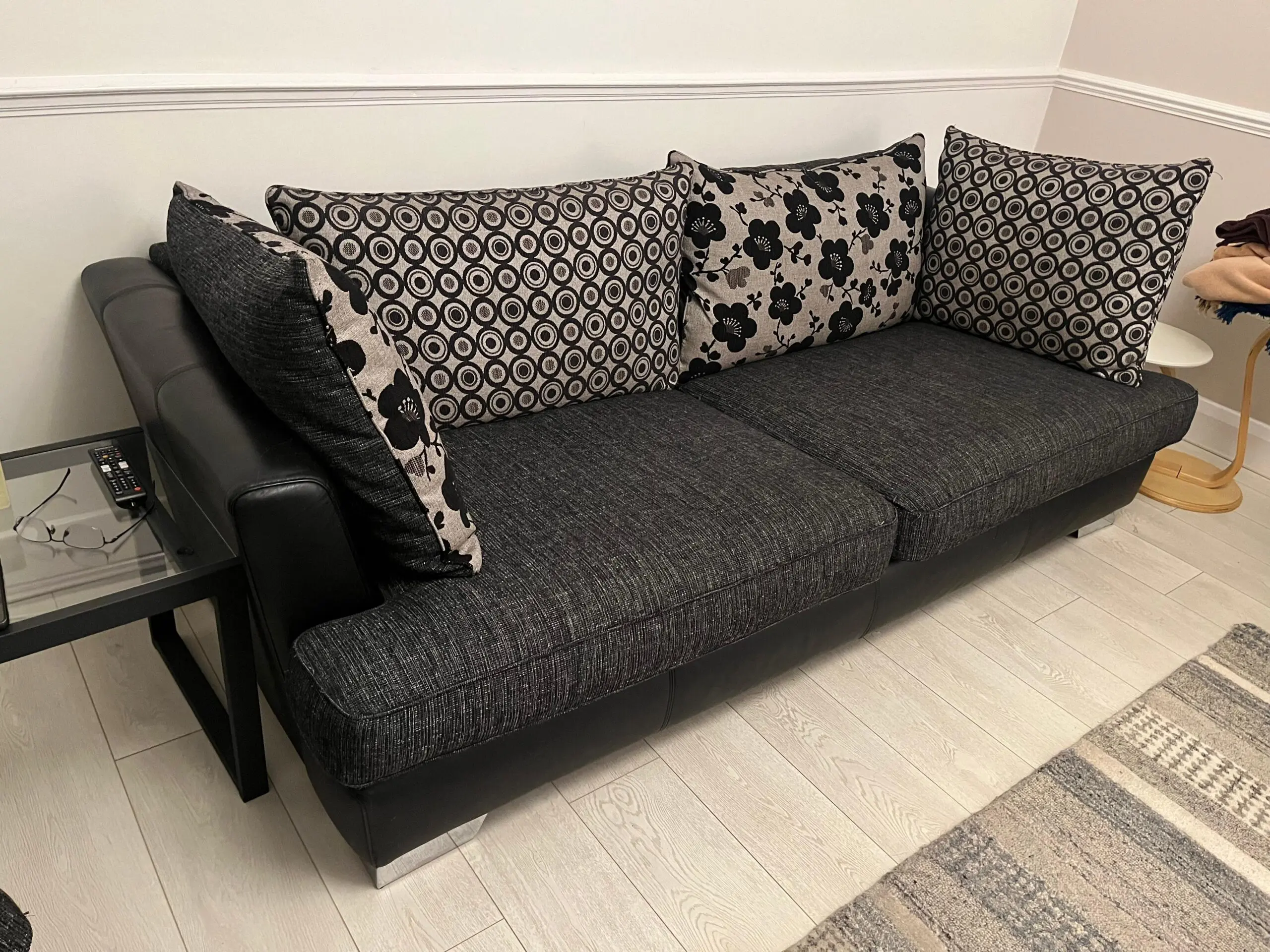 Selling a stylish and comfortable 3-piece sofa set, featuring black leather structure with black/grey fabric seat cushions. Comes with all cushions shown in the photos.